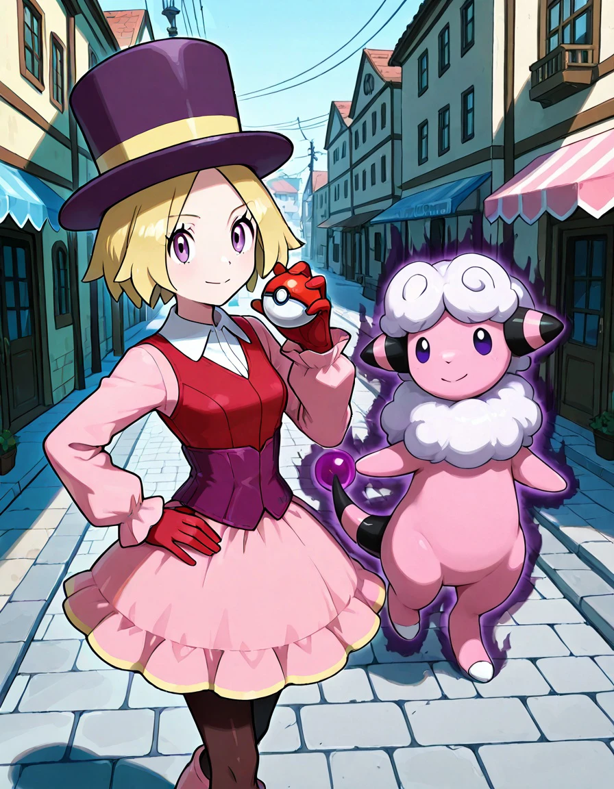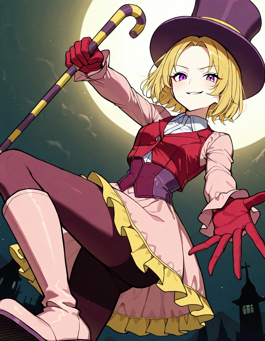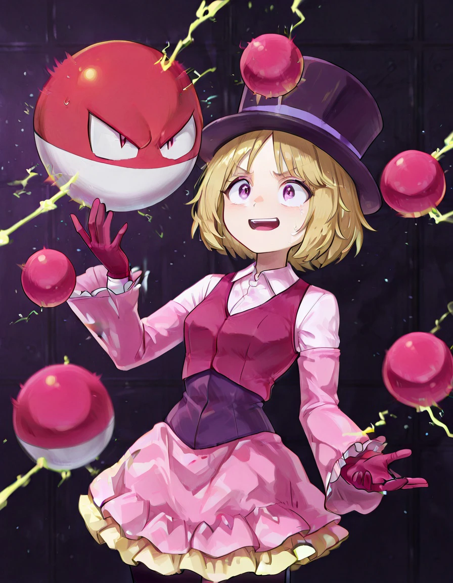 short hair, blonde hair, purple top hat, purple eyes,