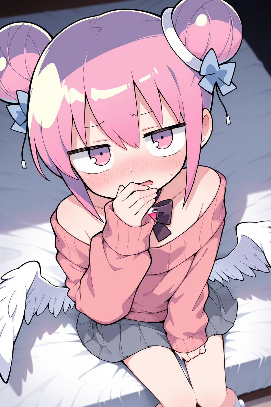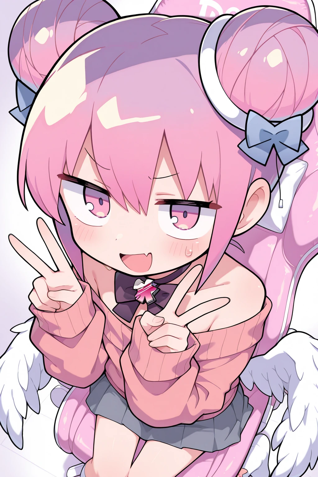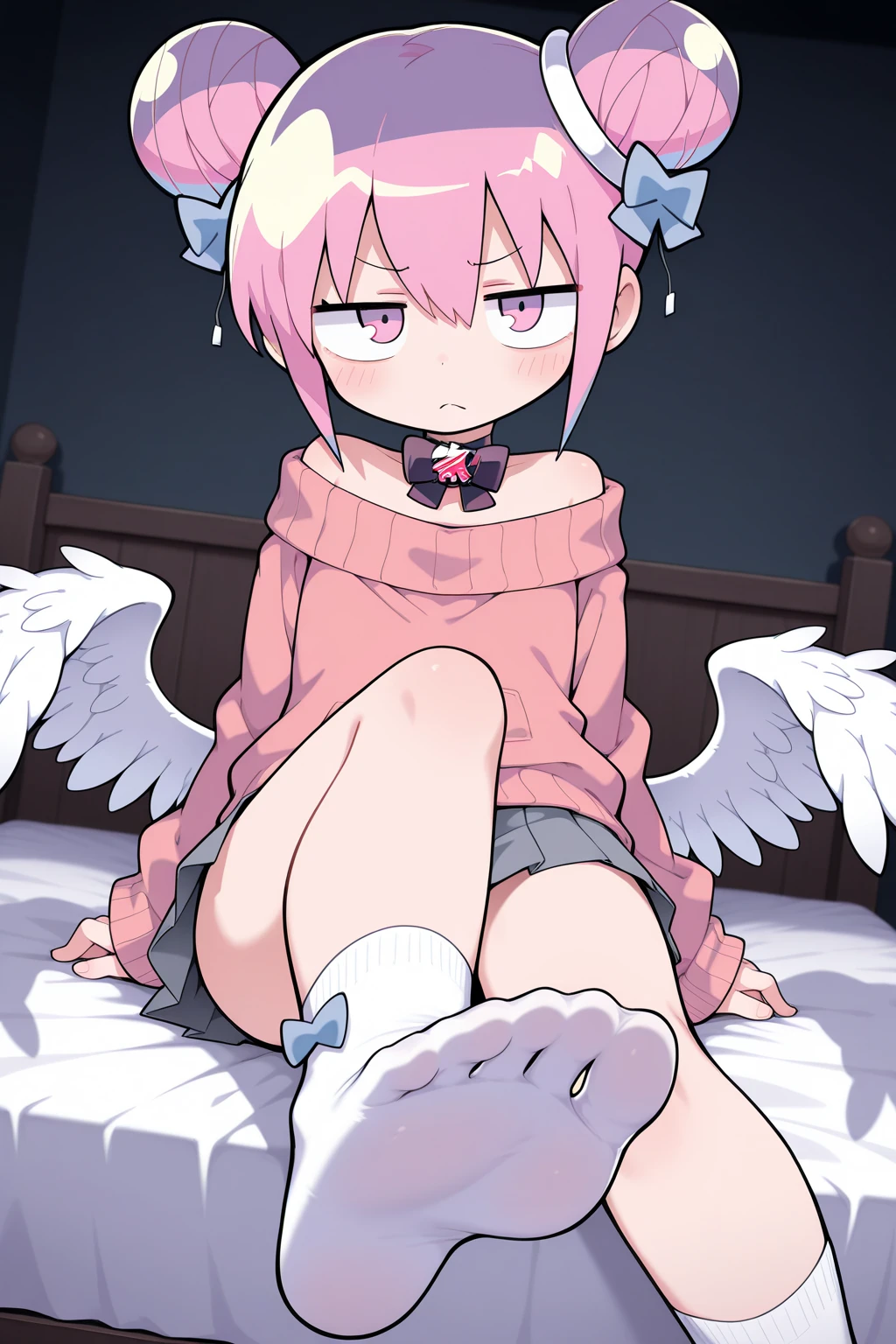 double bun, bow choker, black bowtie, gem, off-shoulder sweater, pink sweater, long sleeves, sleeves past wrists, puffy sleeves, low wings, miniskirt, grey skirt, white socks