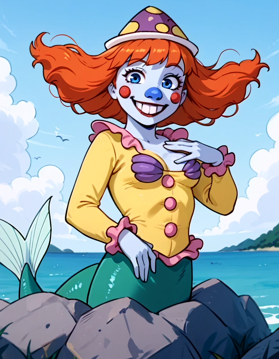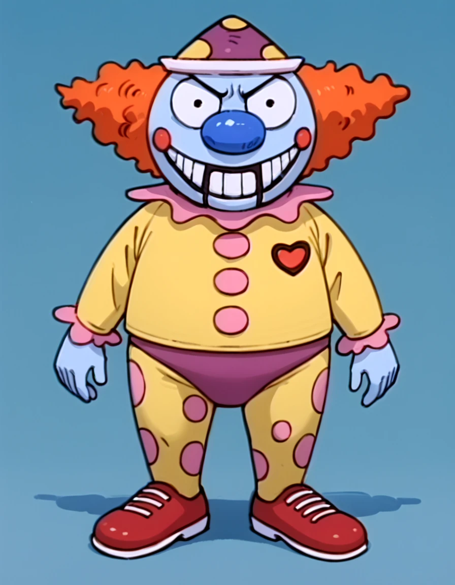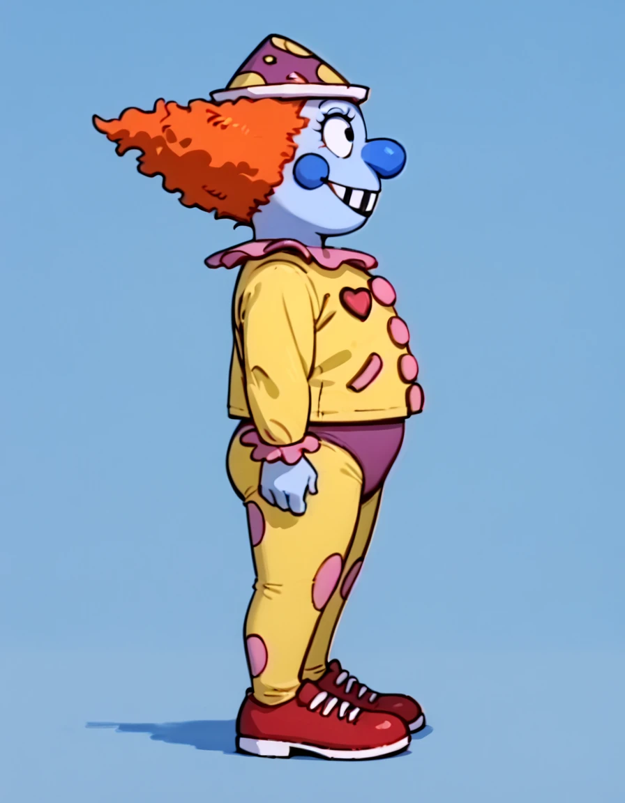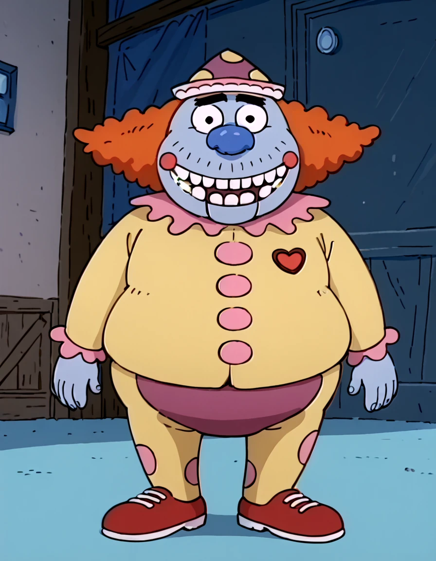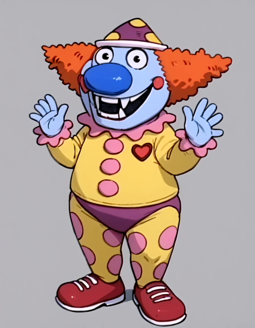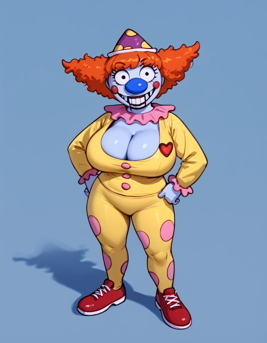 mr_friend, clown_doll, black eyes, doll eyes, orange hair, blue_skin, yellow_and purple_clown_suit, clown_hat, blue nose, rosey_cheeks, heart_boutonnière, red shoes, grin, full body,