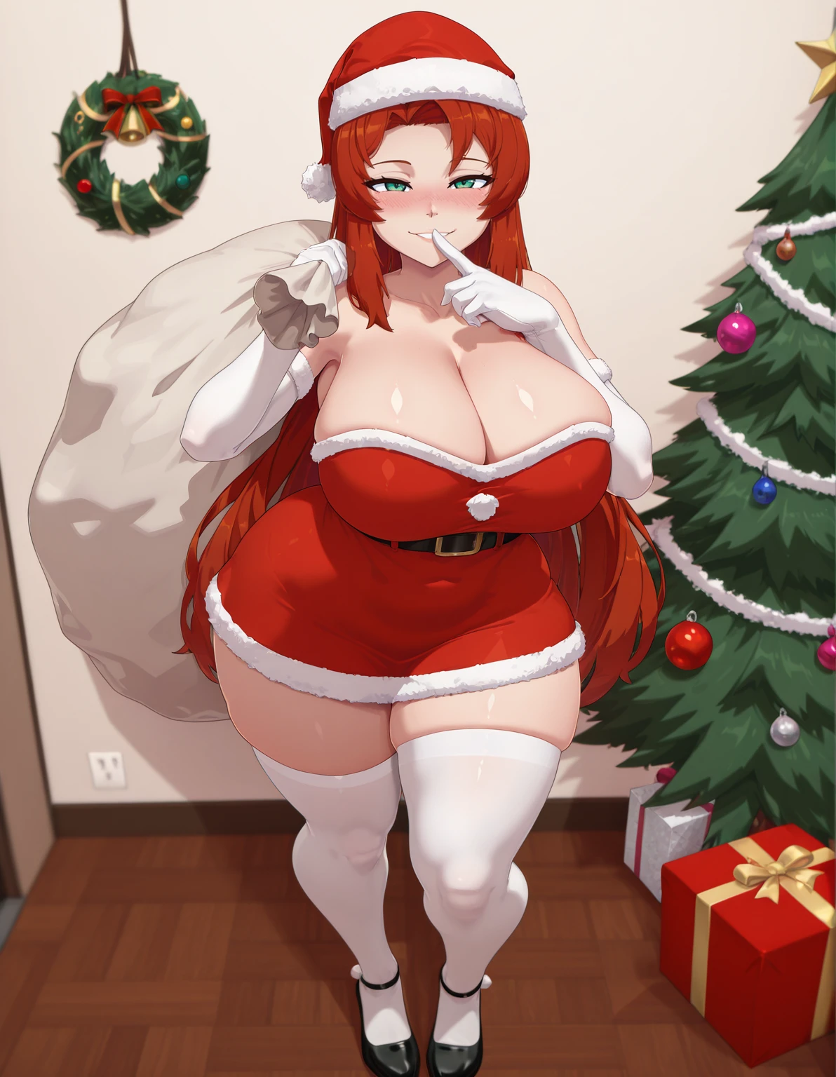 Red dress: covered ???????, red dress, tight dress, cleavage, bare shoulders, red panties, covered navel, necklace, hair ornament, earrings