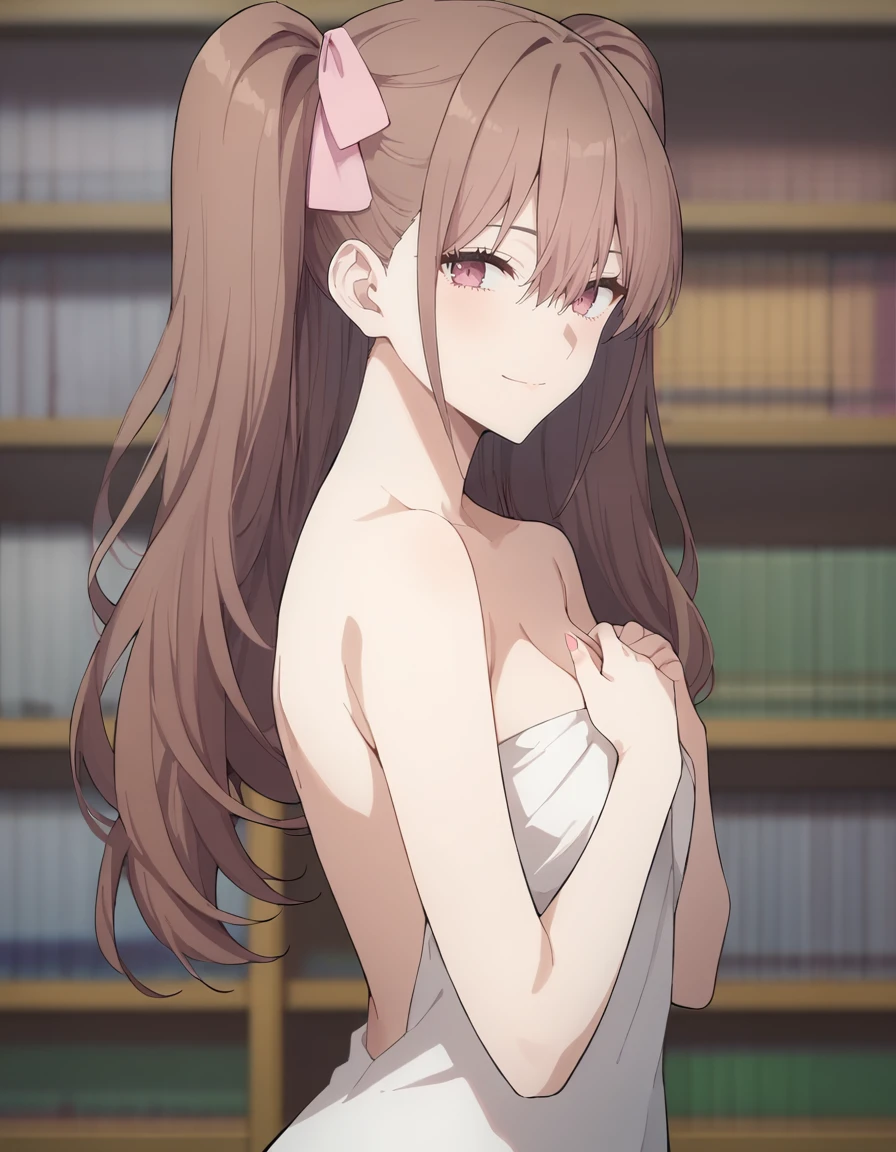 mikari tachibana, long hair, brown hair, twintails, hair ribbon, hair between eyes, sidelocks, pink eyes