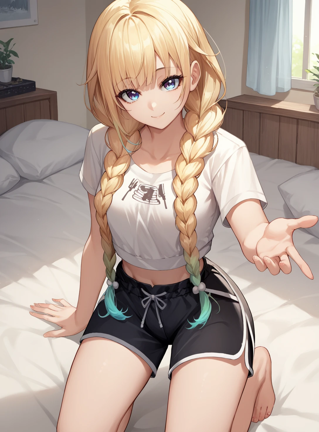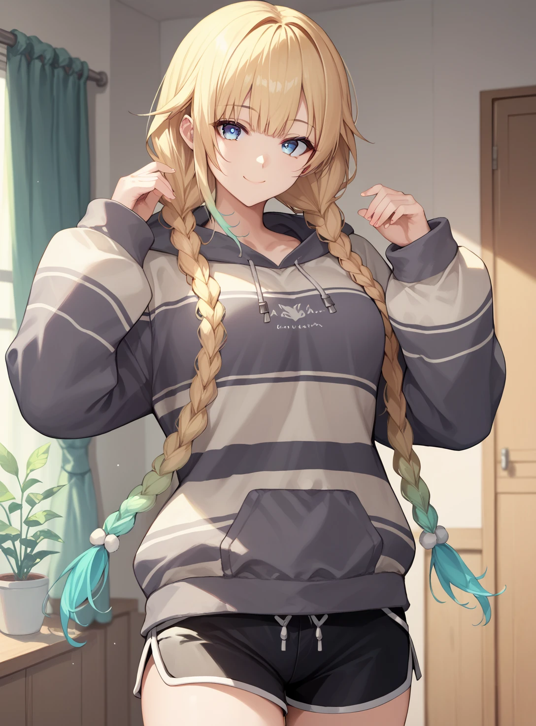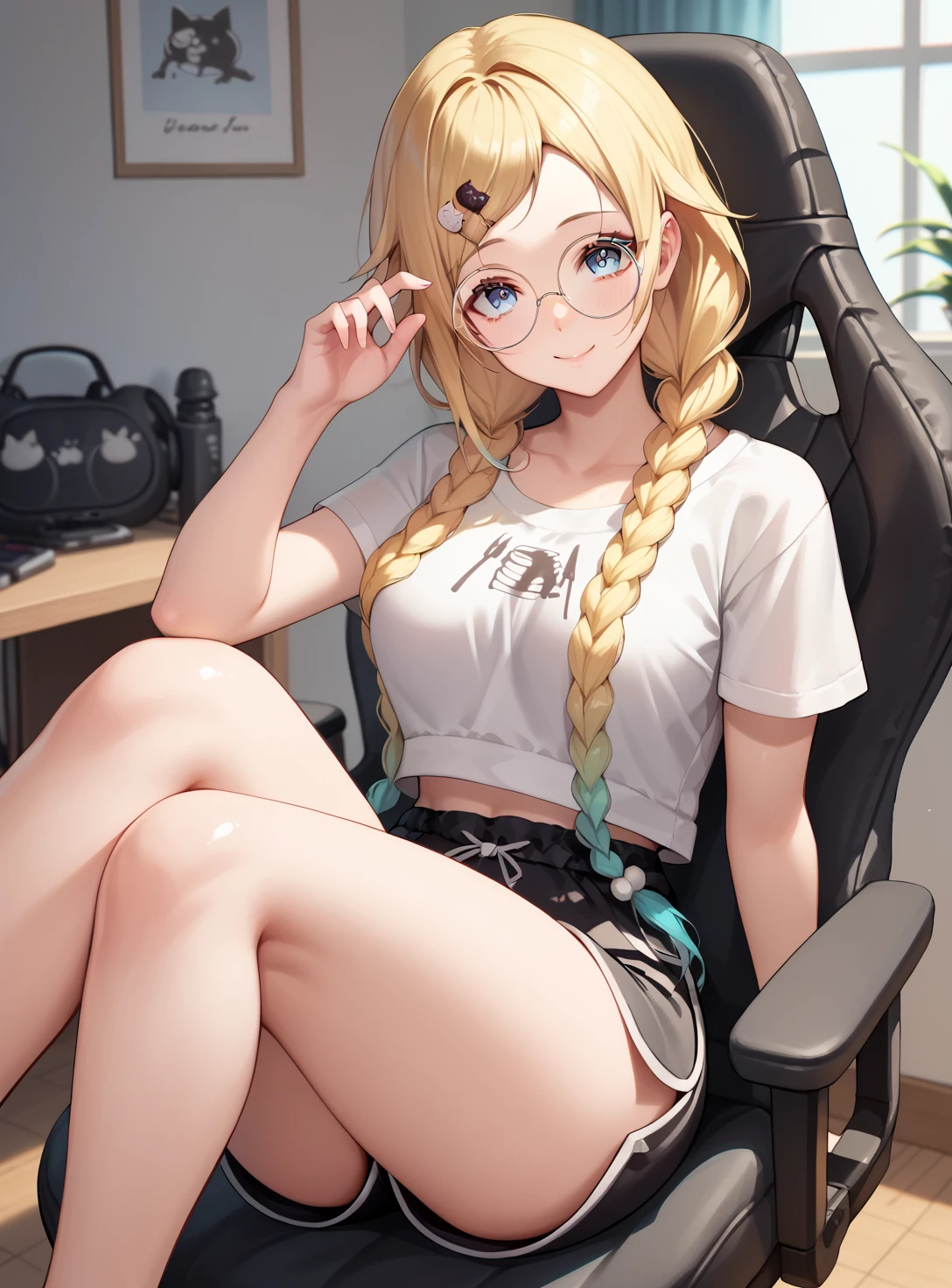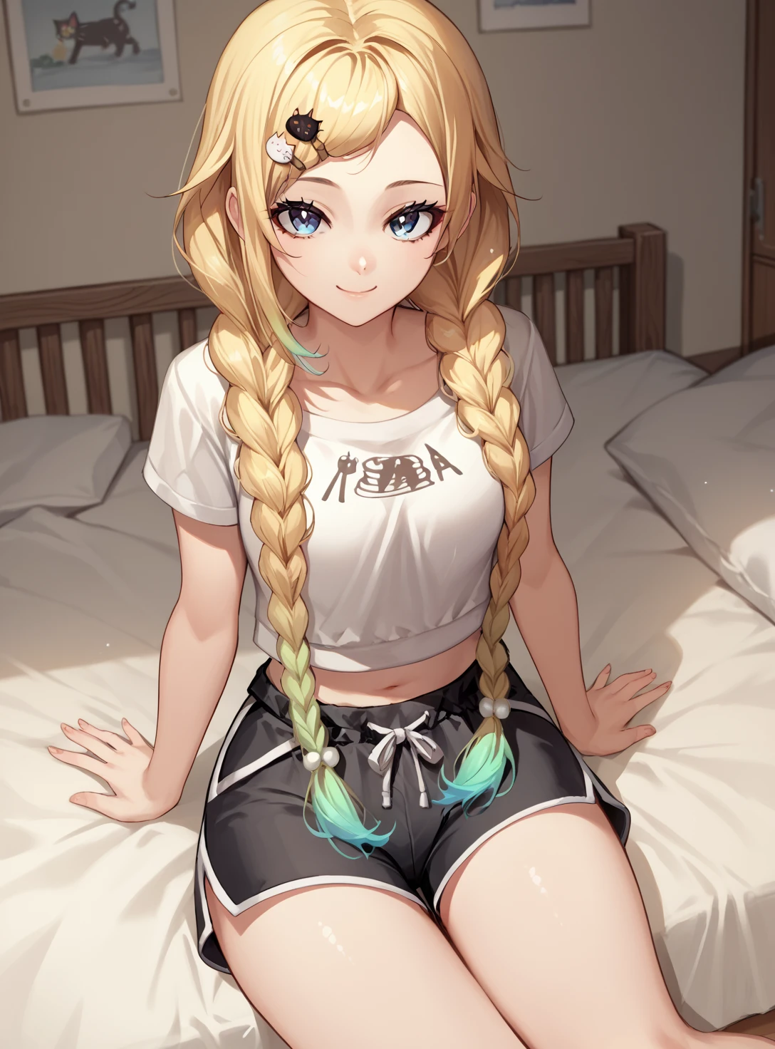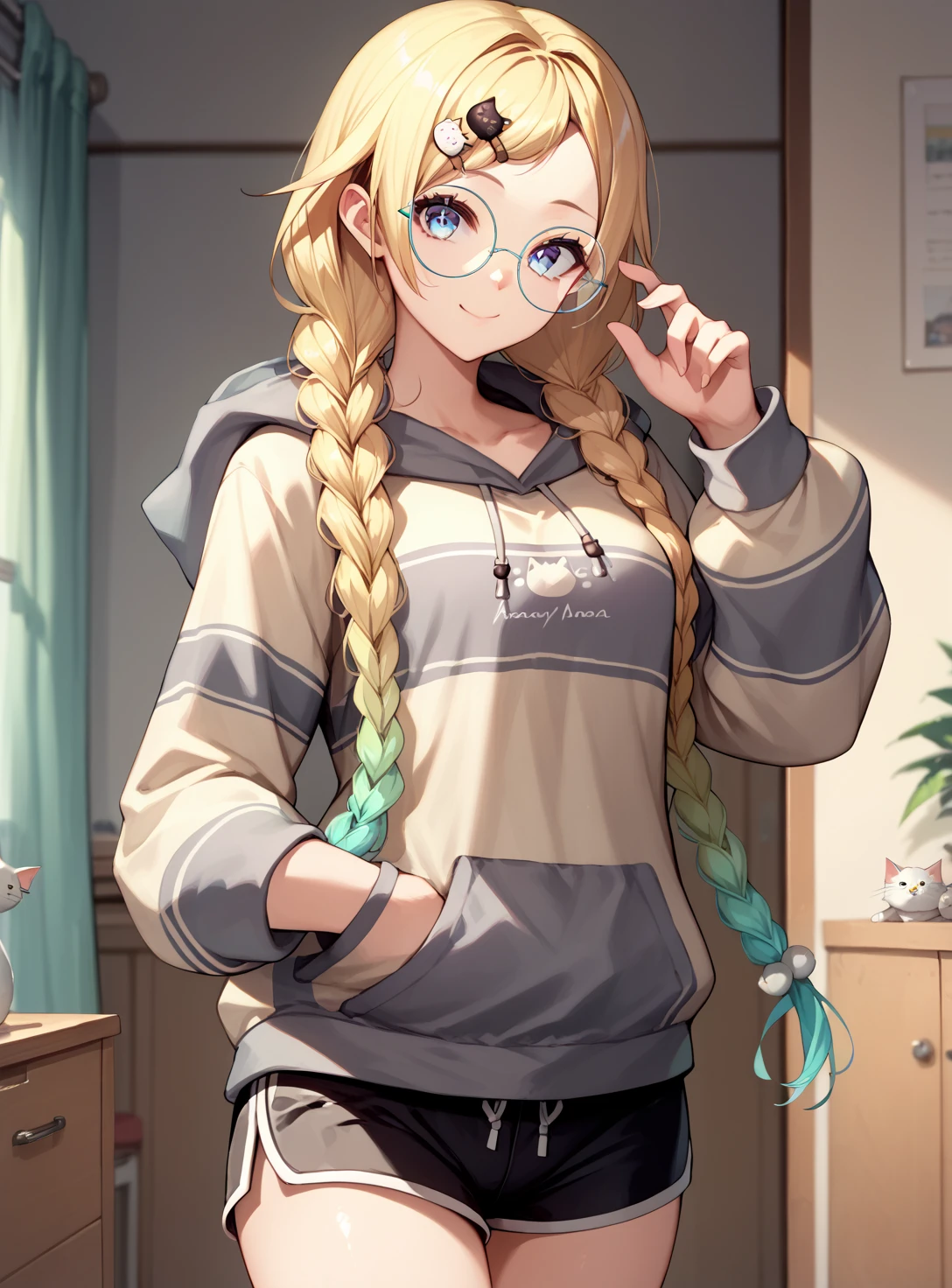 hairstyle:"blonde hair, twin braids, gradient hair," or “blonde hair, twin braids, gradient hair,cat hair ornament, parted bangs,”