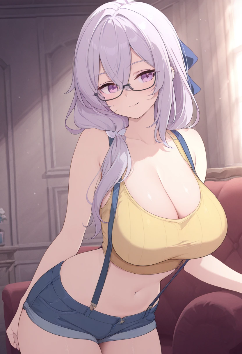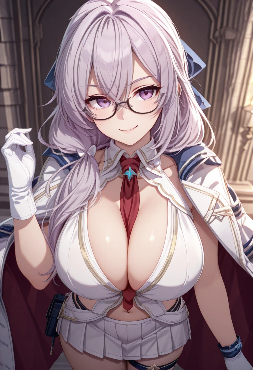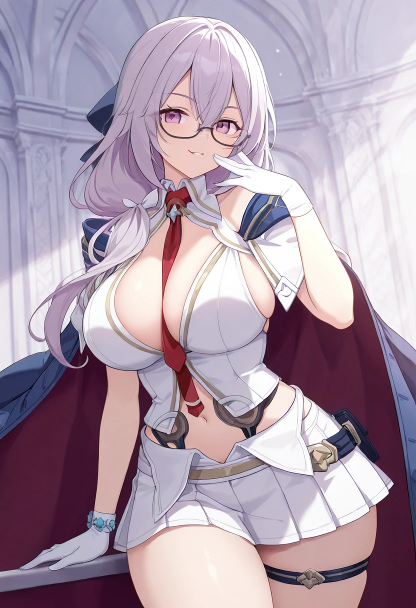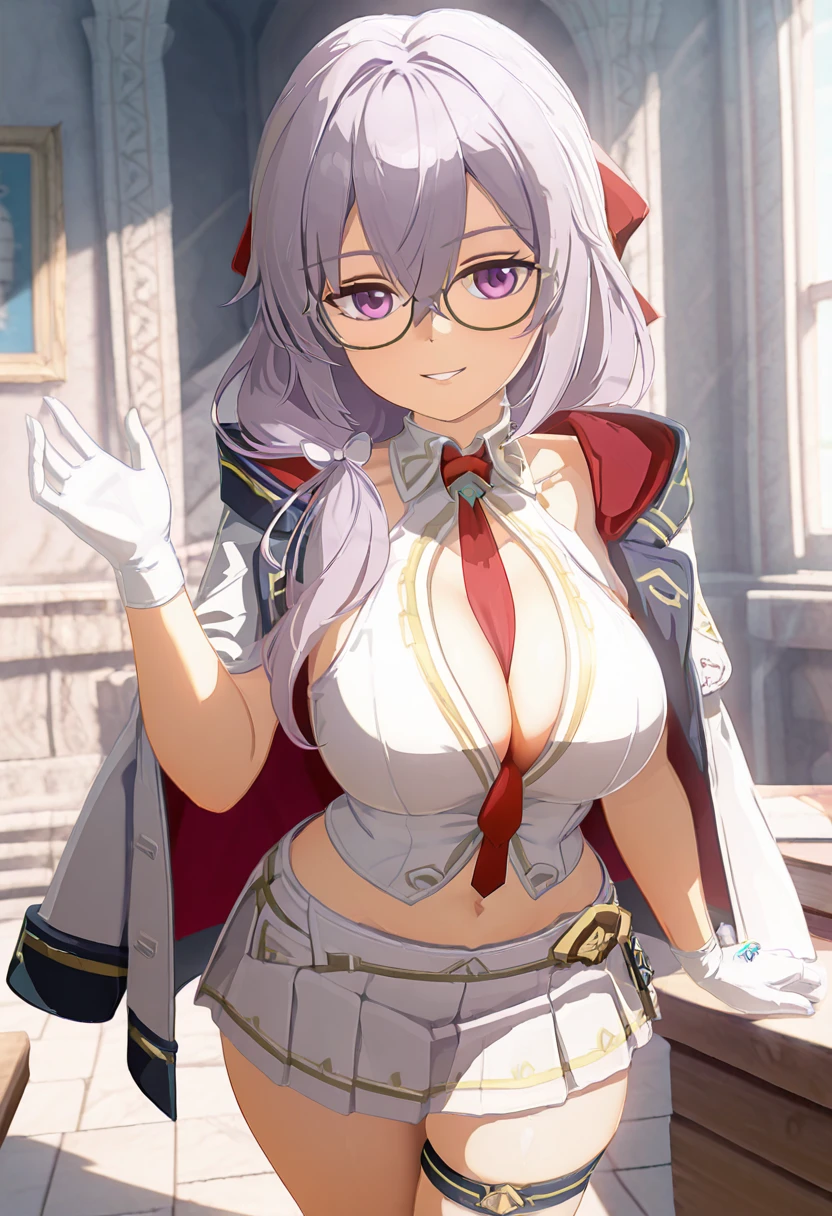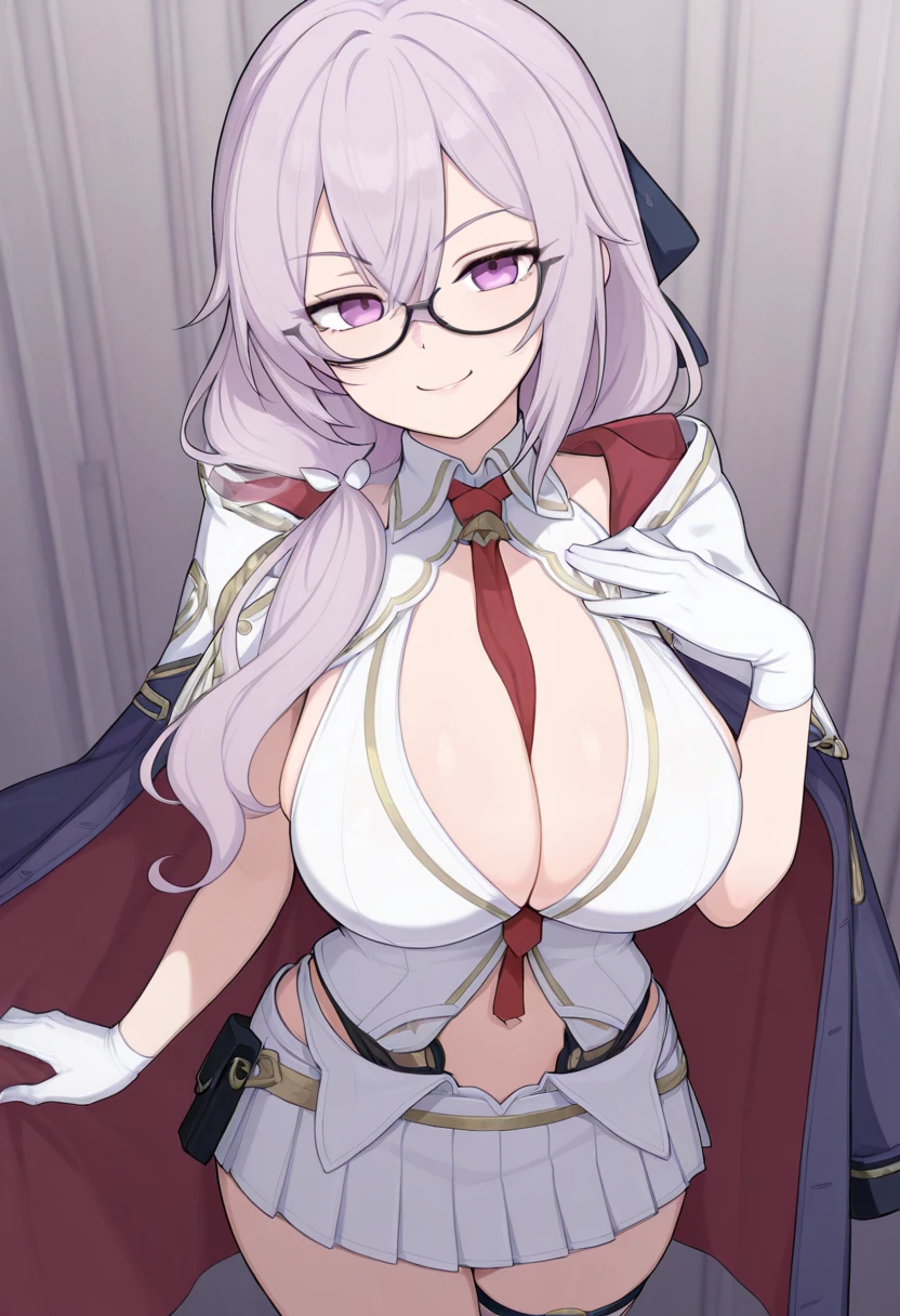 zzCanace, purple eyes, grey hair, purple hair, long hair, semi-rimless eyewear, navel, cleavage, jacket, white gloves, thigh strap, cleavage cutout, necktie between breasts, red necktie, minishirt,