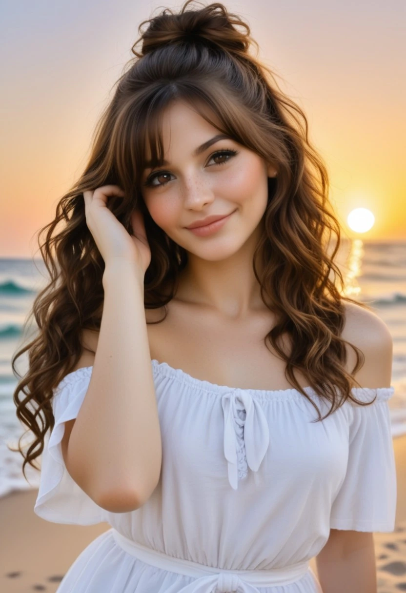 Skin: Warm olive tone with subtle freckles across the nose and cheeks, smooth and luminous