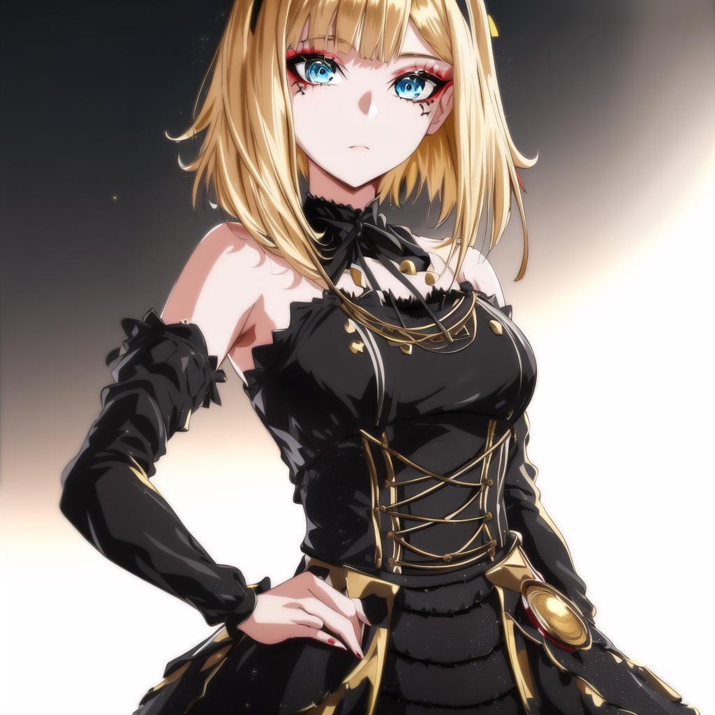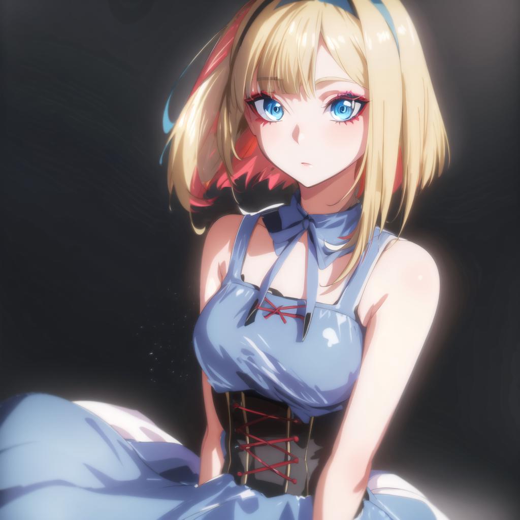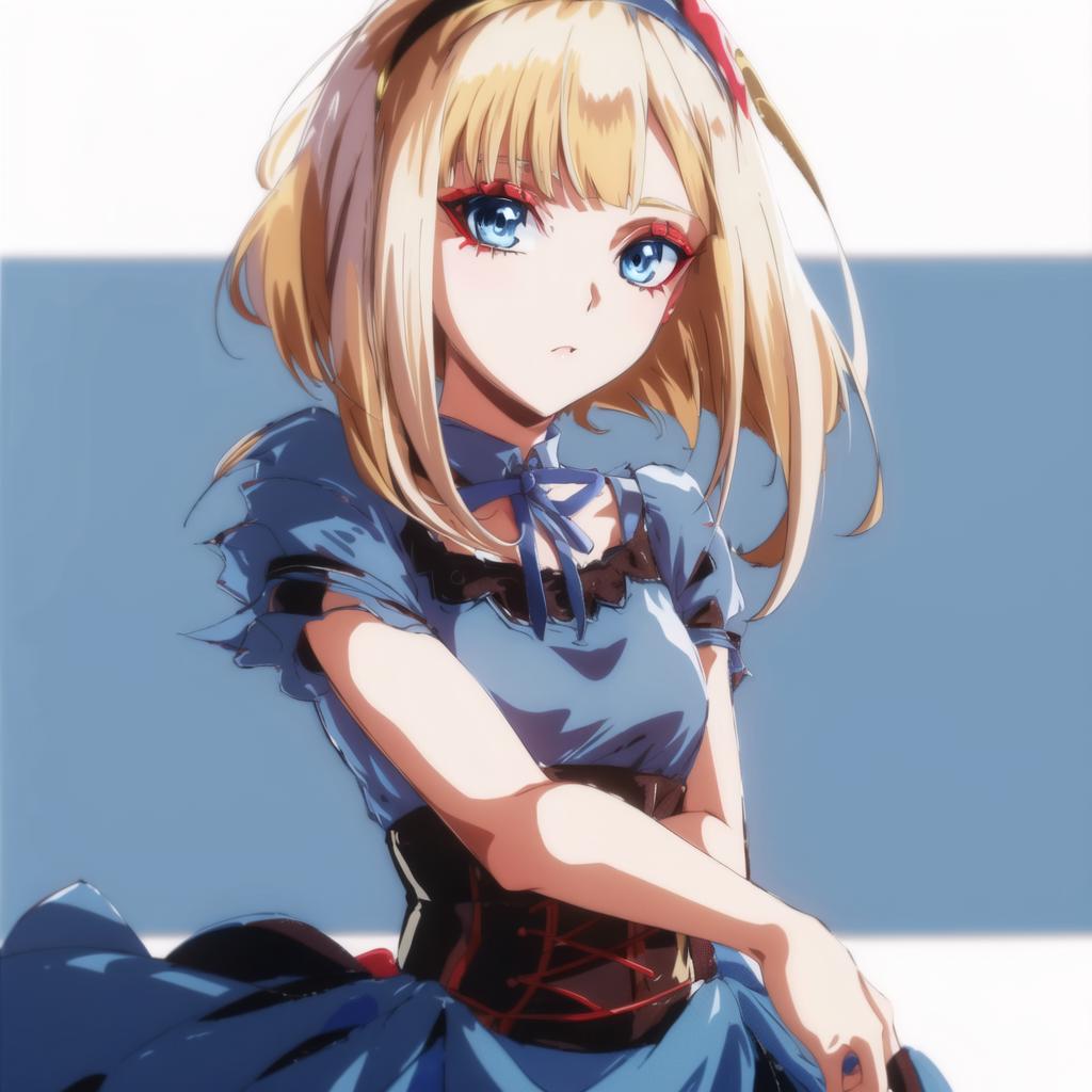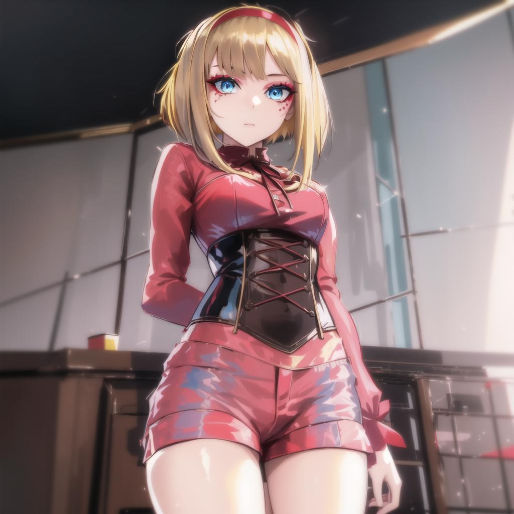 Cosette/Destiny :<lora:DestinyV1:0.65>,cosette schneider, Destiny,blonde hair, solo, blue eyes, hairband, red hairband, makeup, bangs, eyeshadow, ribbon,neck ribbon, medium hair, short hair