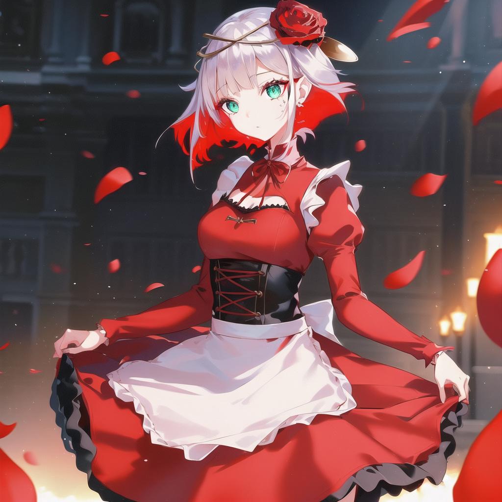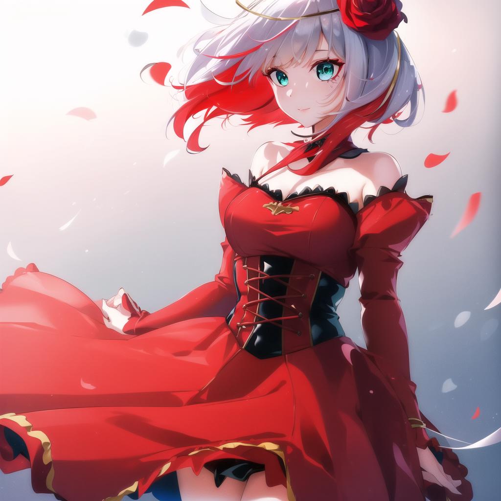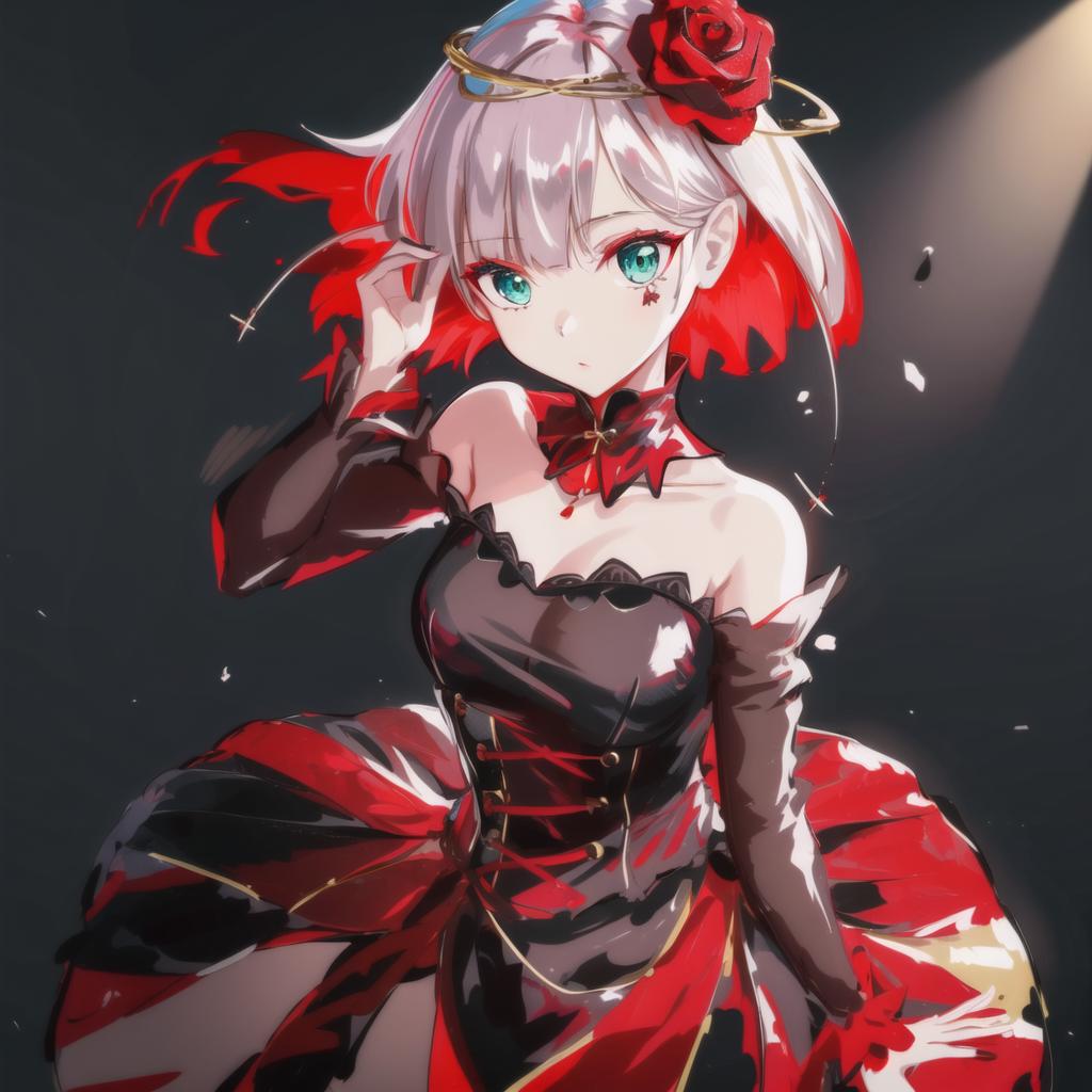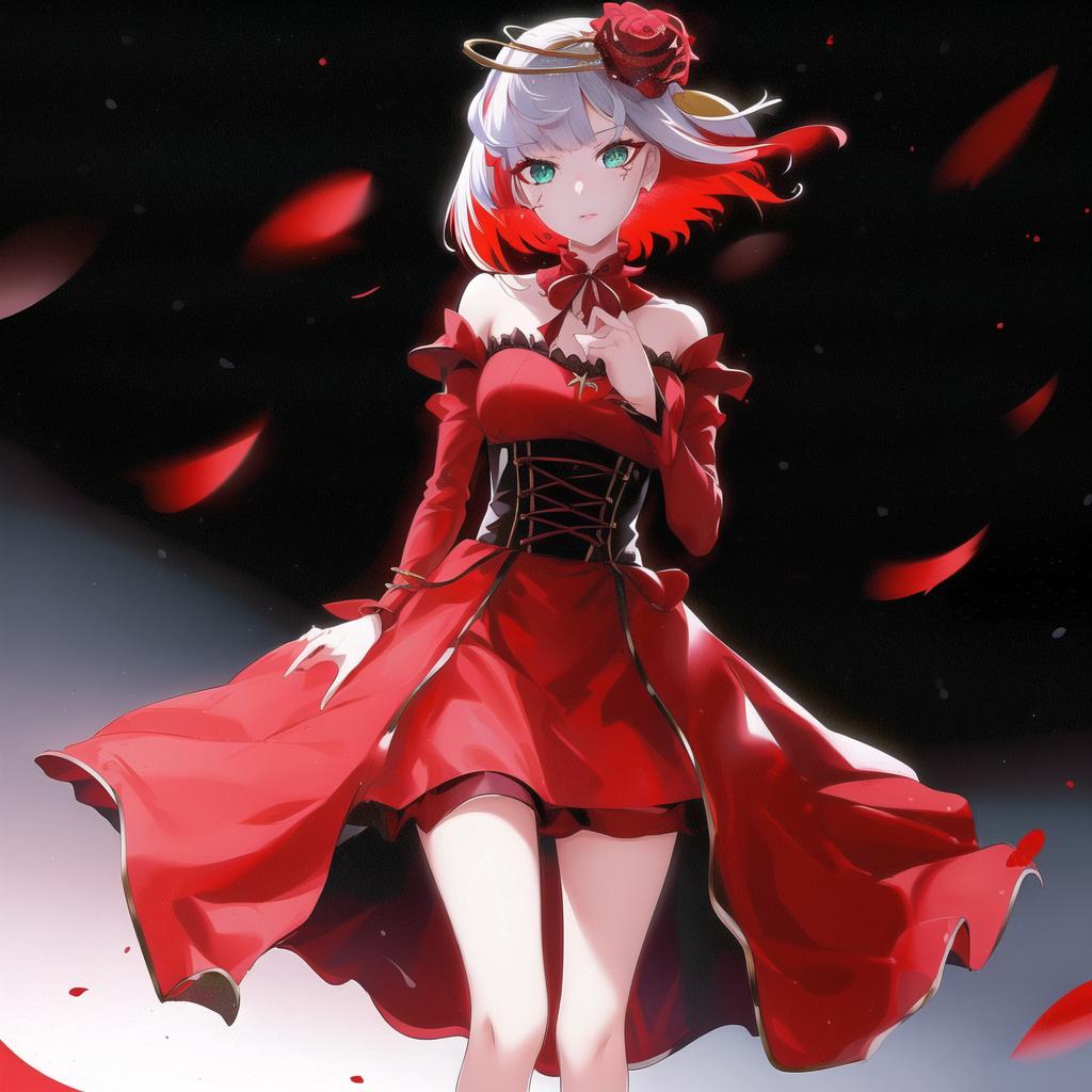 <lora:DestinyV1:0.6>,1girl,cosette schneider, Destiny, flower, solo, dress, red dress, red flower, hair ornament, red rose, hair flower, short hair, green eyes, standing, corset, red footwear, multicolored hair,
