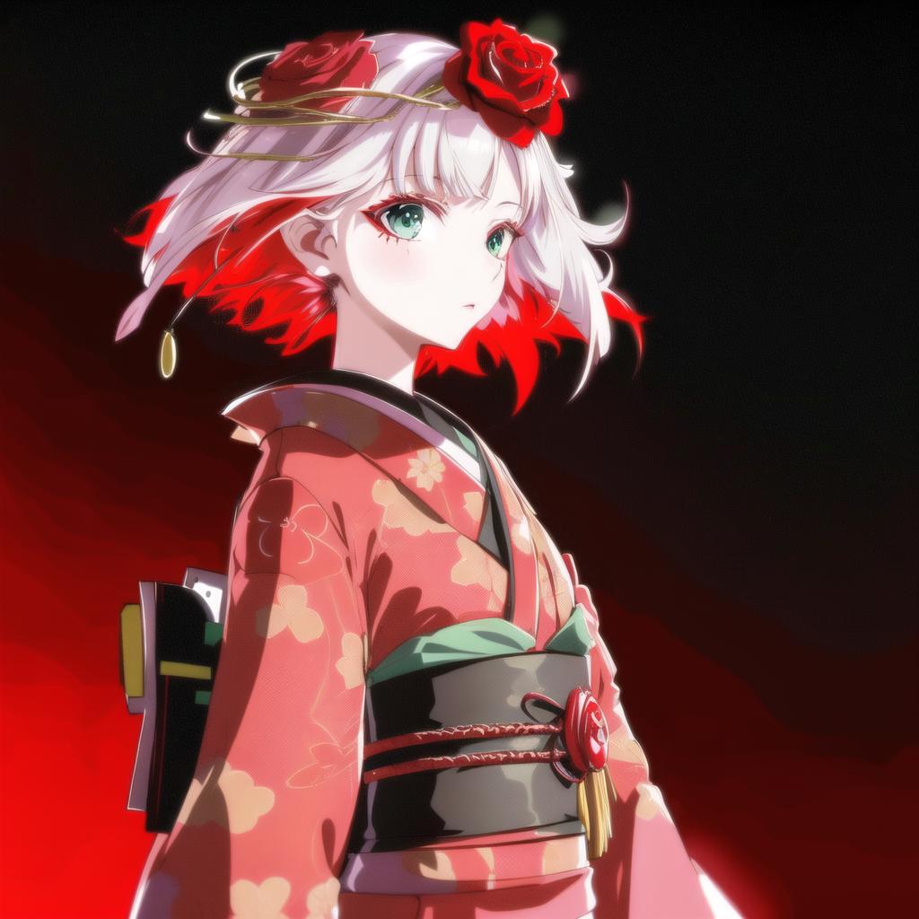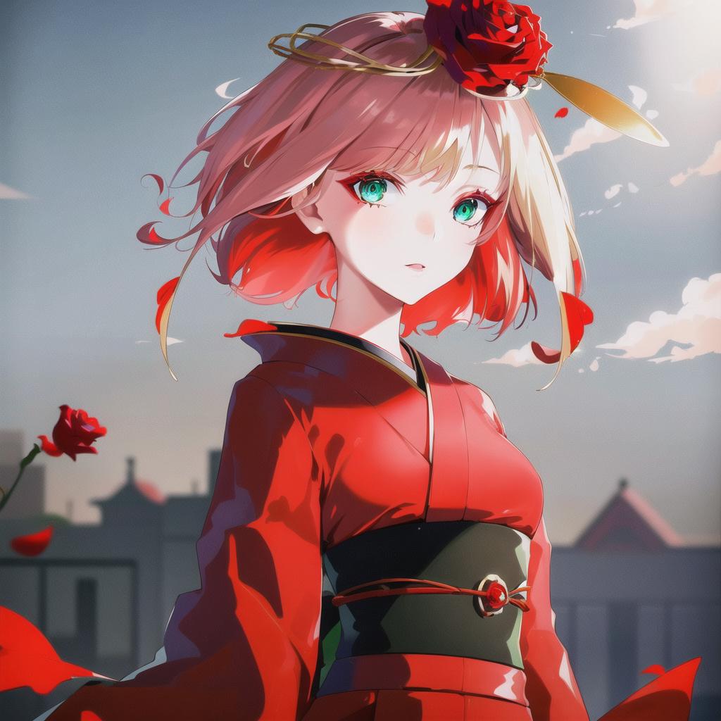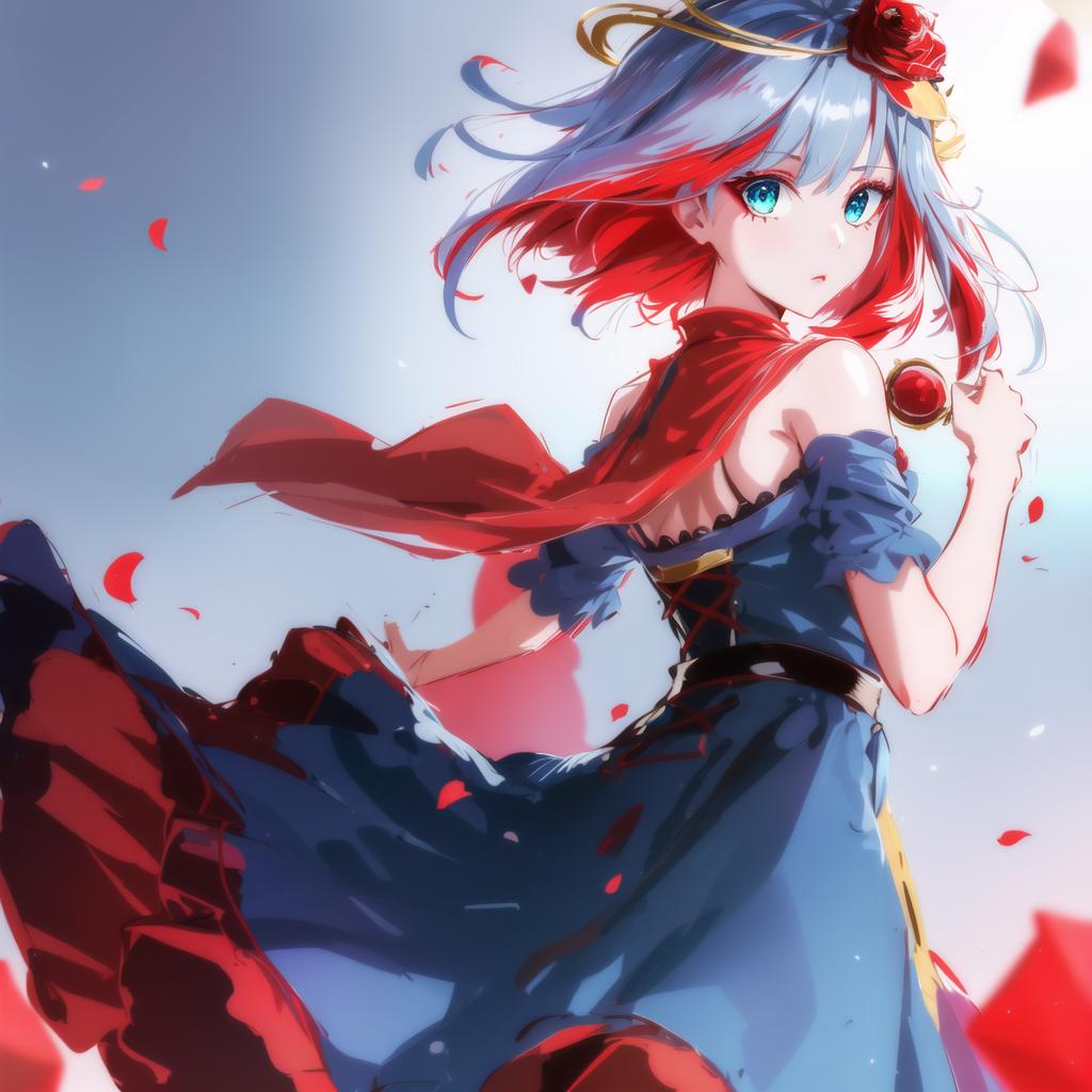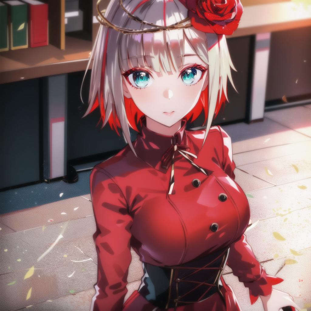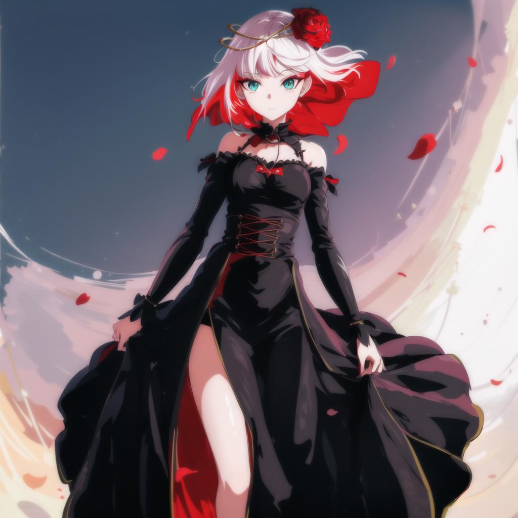 <lora:DestinyV1:0.6>,1girl,cosette schneider, Destiny, flower, solo, dress, red dress, red flower, hair ornament, red rose, hair flower, short hair, green eyes, standing, corset, red footwear, multicolored hair,