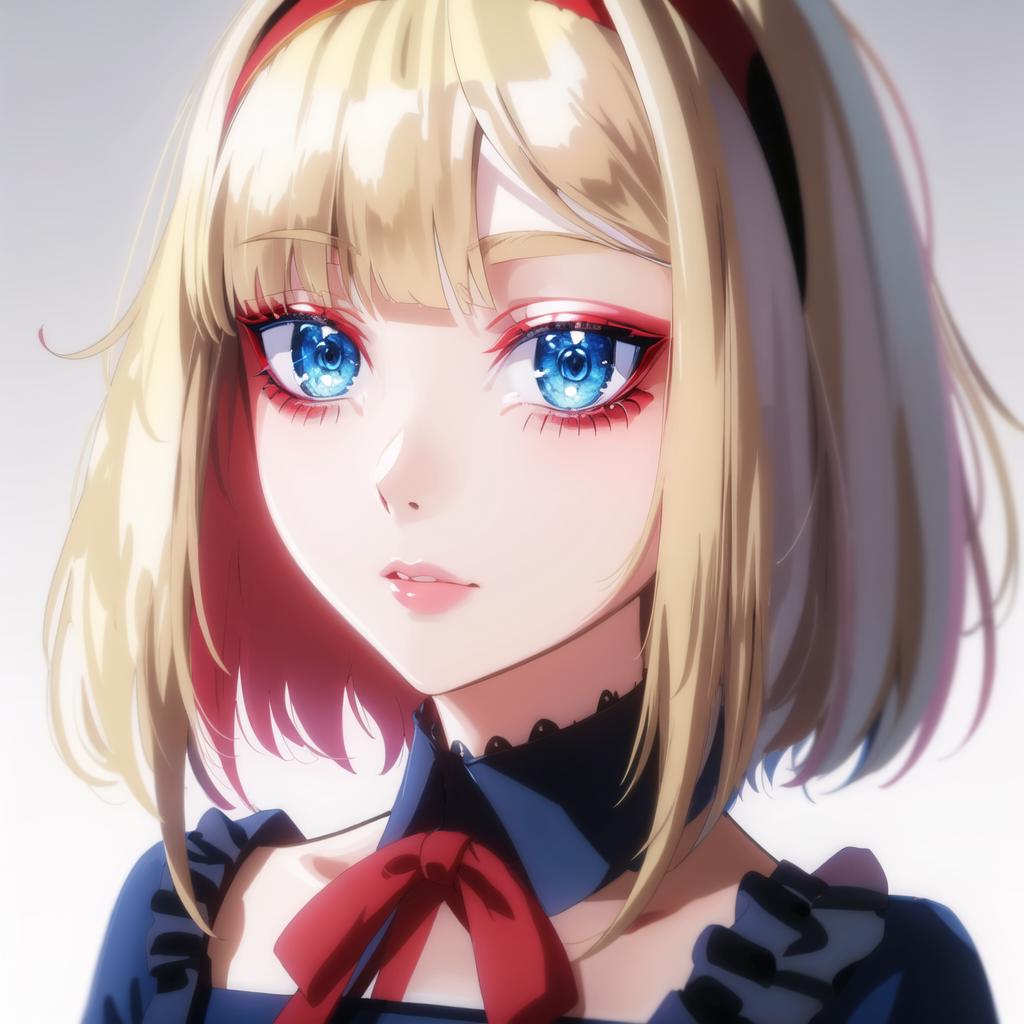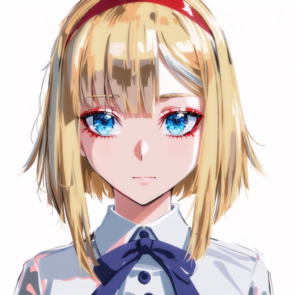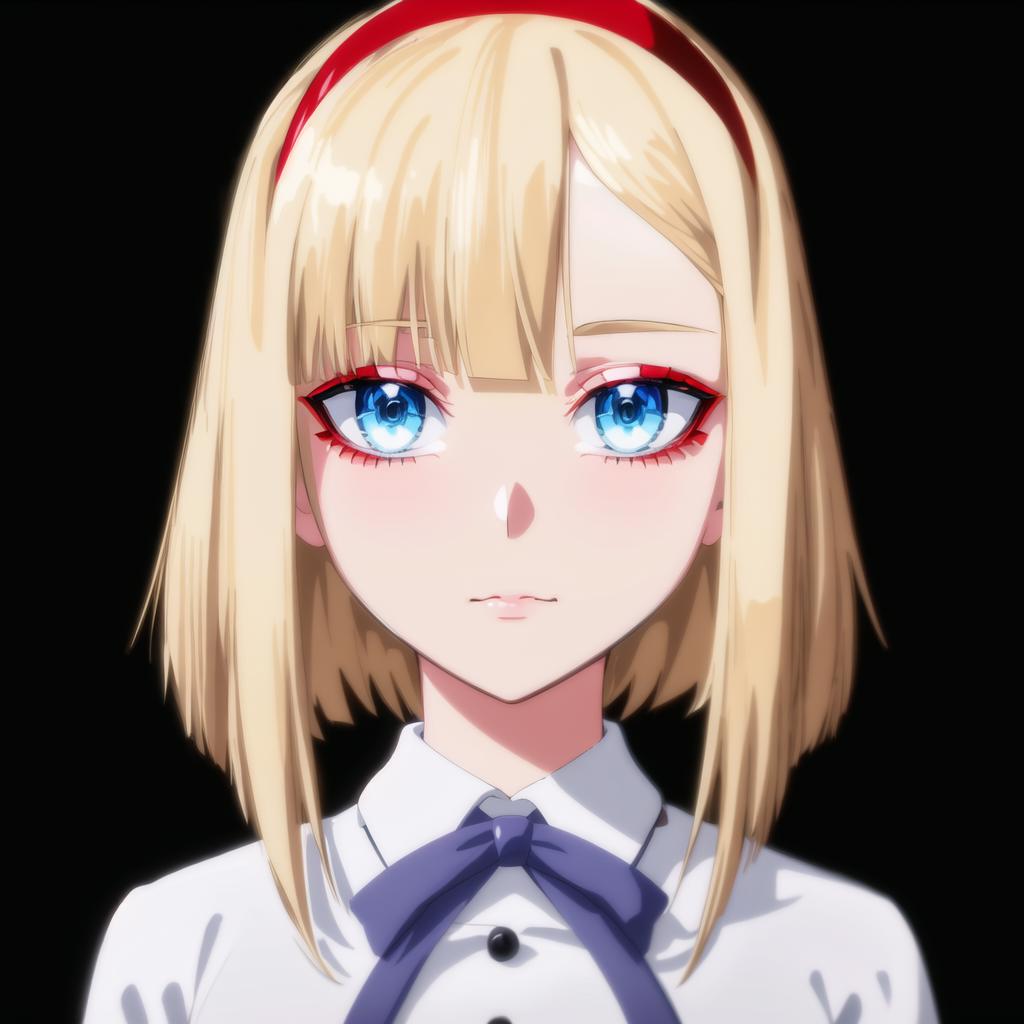 <lora:DestinyV1:0.65>,cosette schneider, Destiny,blonde hair, solo, blue eyes, hairband, red hairband, makeup, bangs, eyeshadow, ribbon,neck ribbon, medium hair, short hair