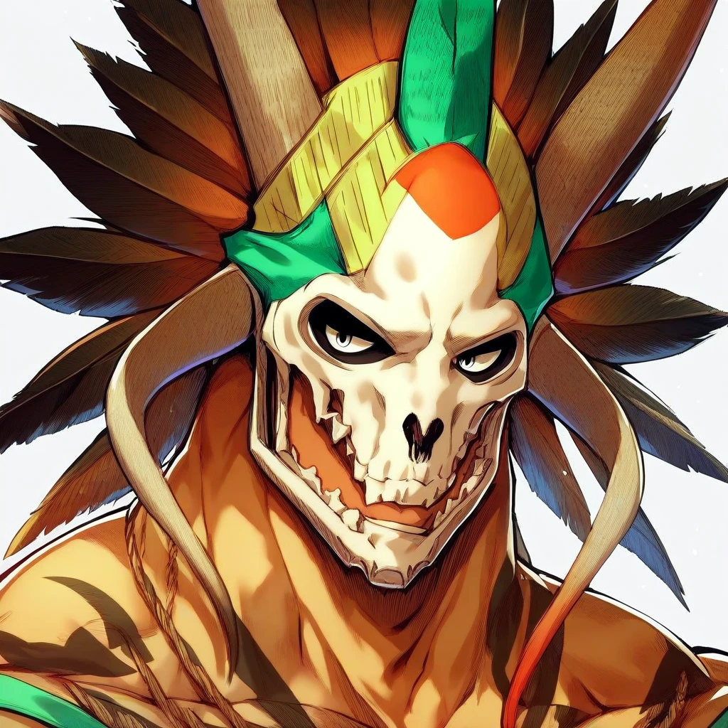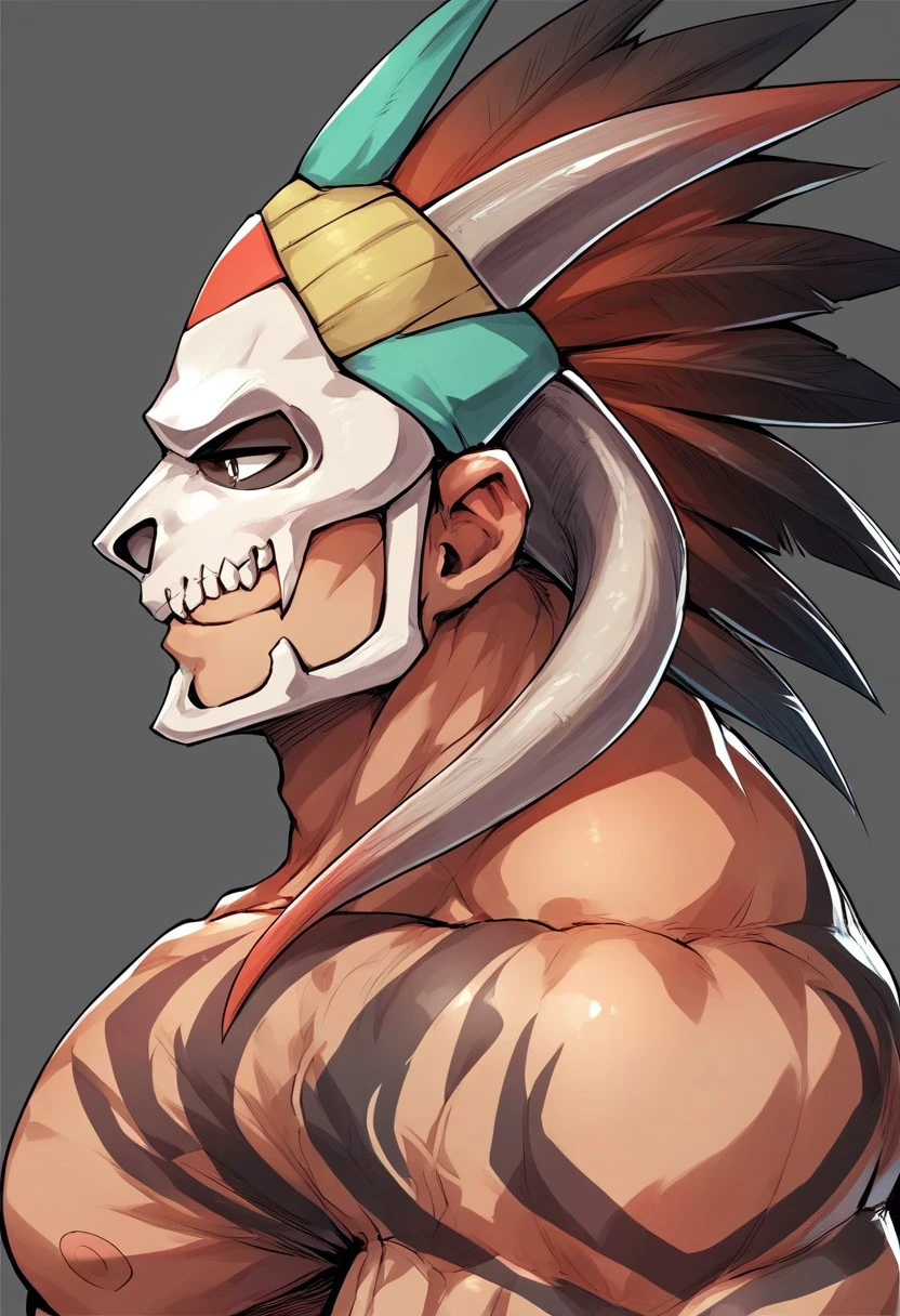 1boy, ae_g@mela, tribal skull mask, tattooed body, tribal armor, loincloth, boots, muscular,