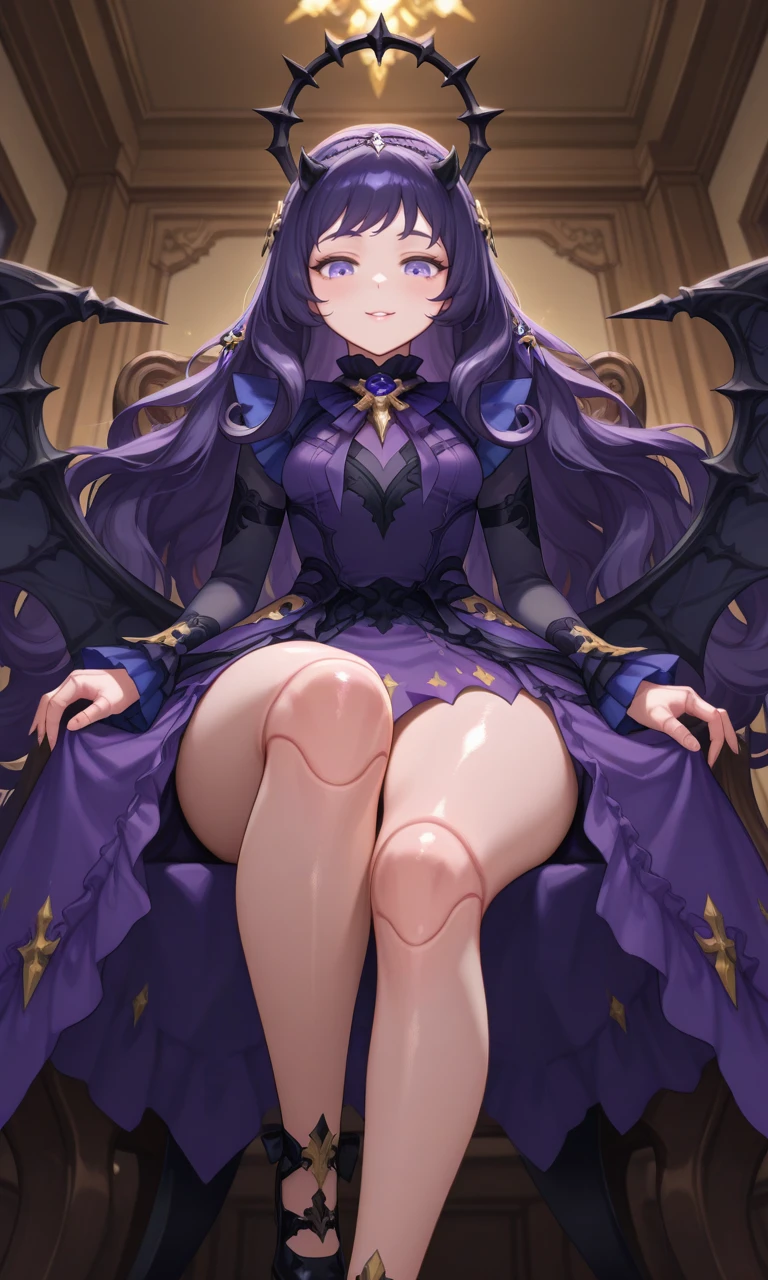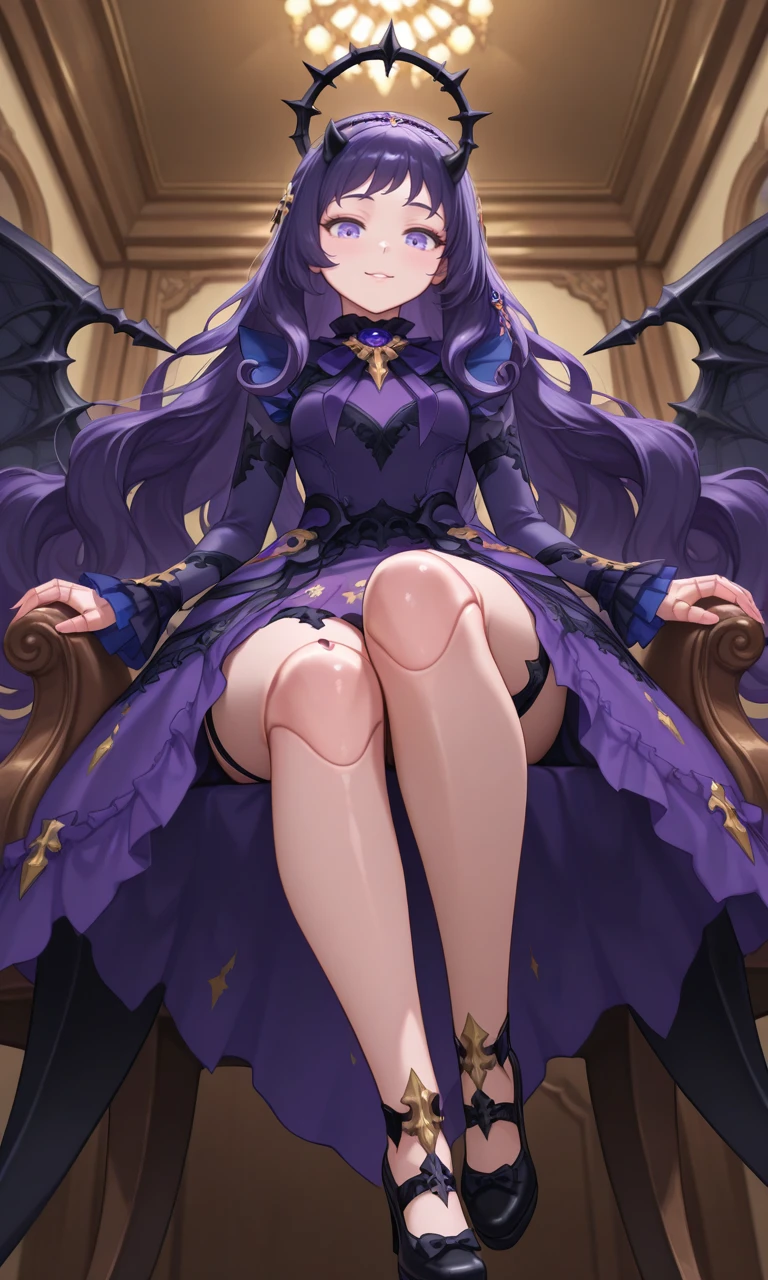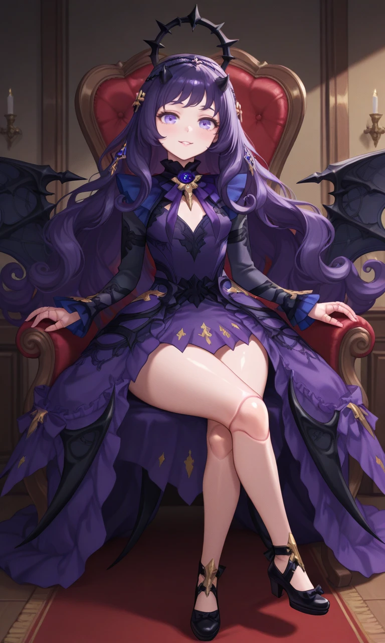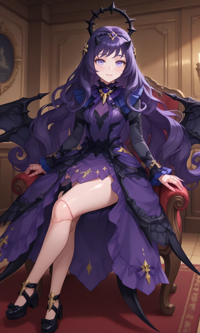 Eve(Doll), doll joints, dark purple hair, wavy hair, roll hair, front hair, Mild Violet eyes, black accessories, Very small horns, black horns, purple dress, decorations, black heels, black wings,