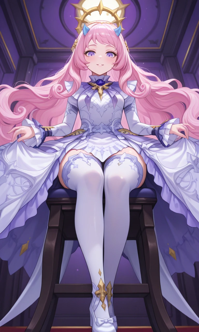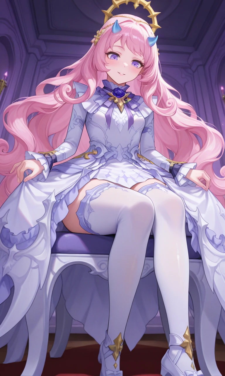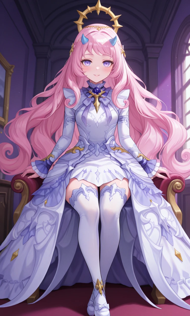 Eve(SK), pink hair, wavy hair, roll hair, front hair, Mild Violet eyes, gold accessories, Very small horns, blue horns, white dress, purple decorations, white stocking, white heels, white wings,