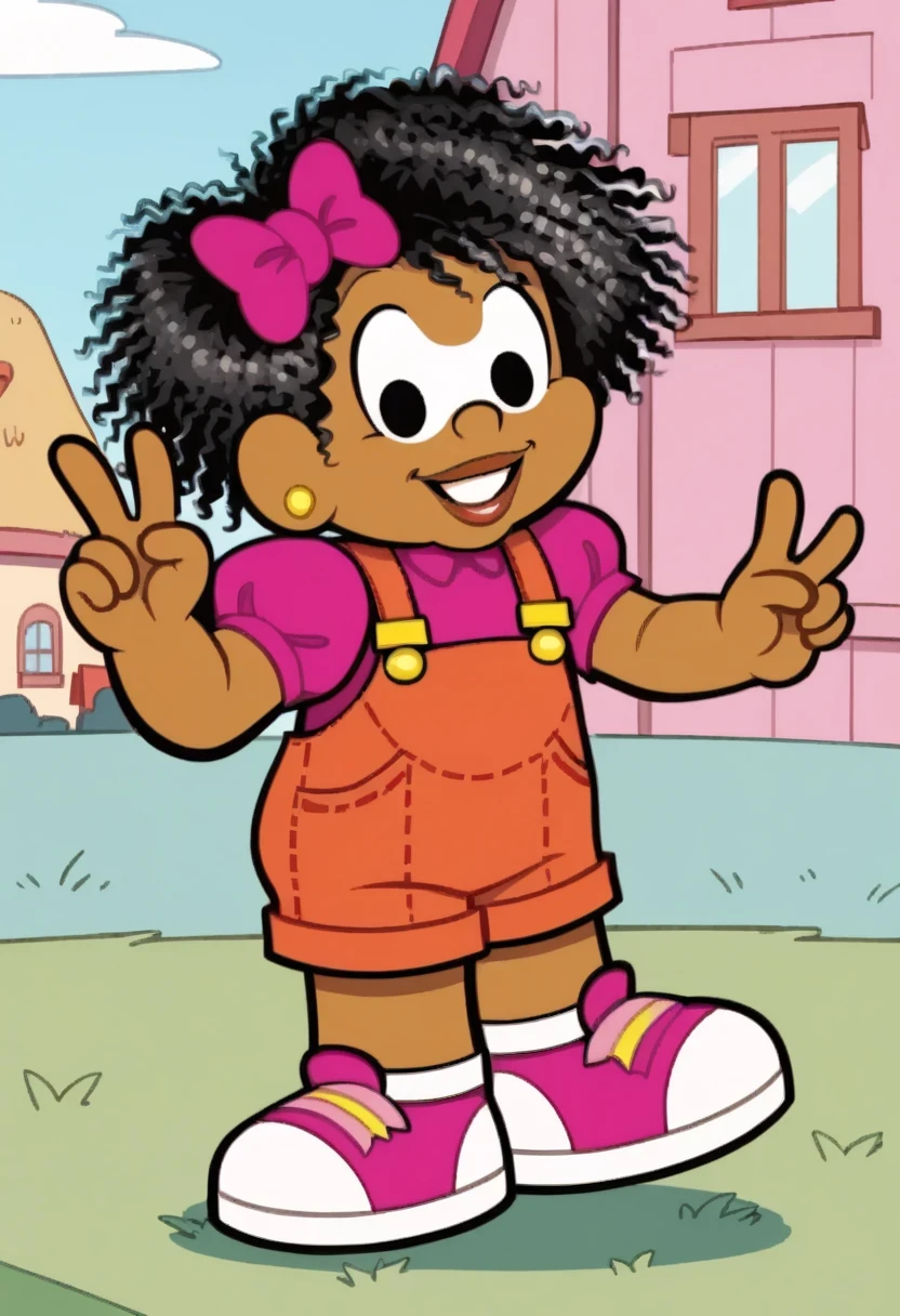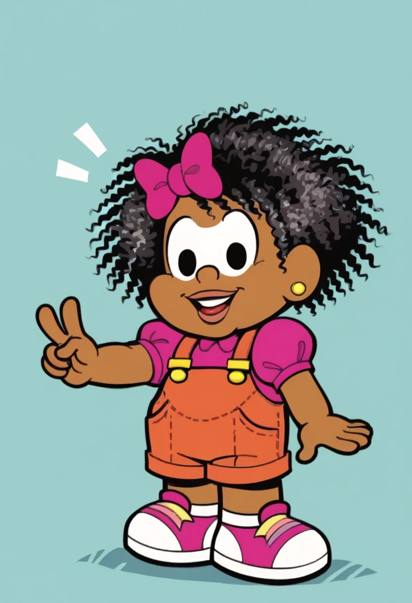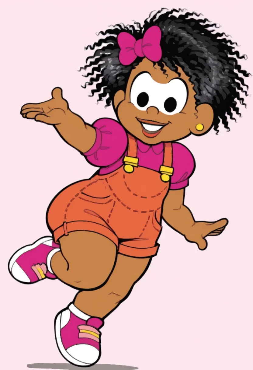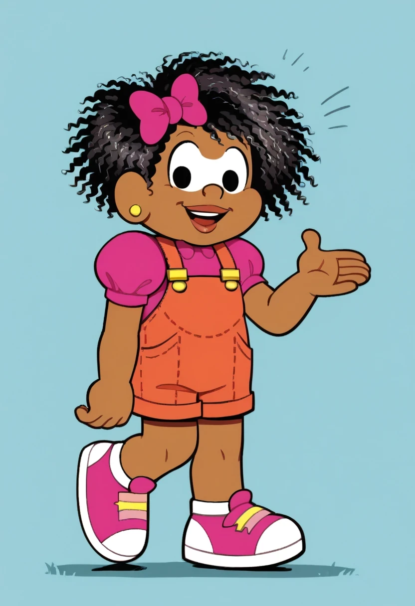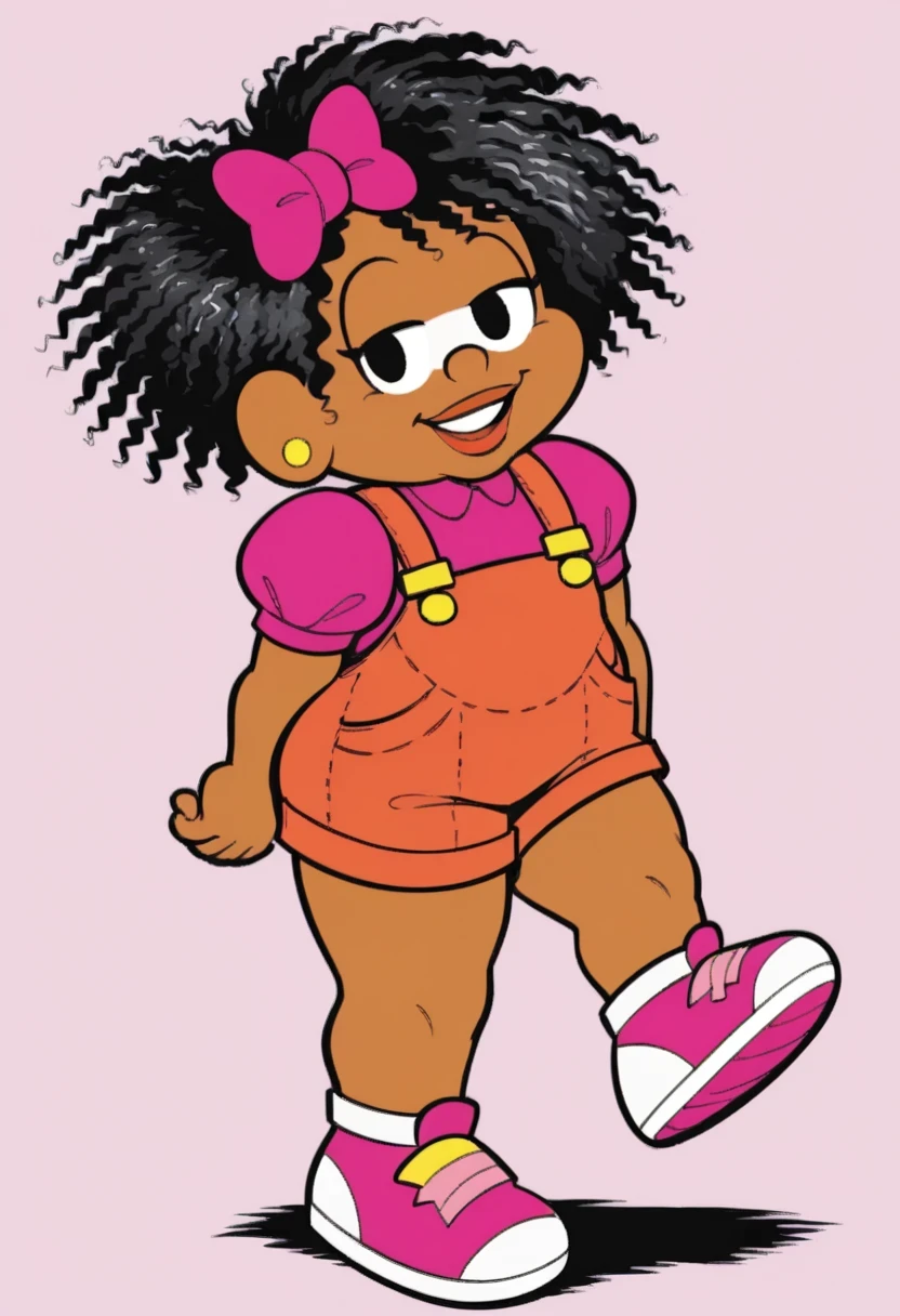 MilenaTDM, 1girl, dark skinned female, frizzy curly black hair, yellow earrings, pink hairbow, puff-sleeved pink shirt, short orange overalls, pink shoes with colorful laces, black eyes, big lips, short,