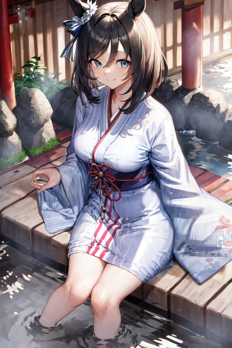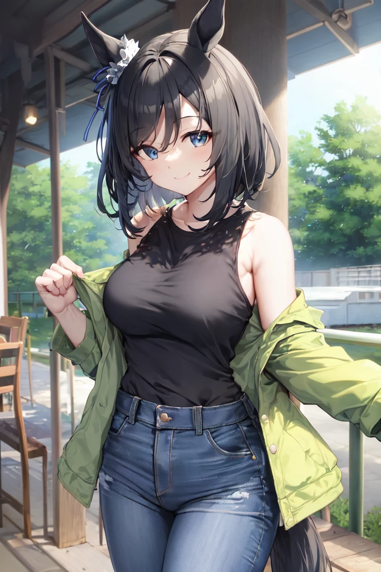 1girl, short hair, simple background, brown hair, blue eyes, tail through clothes, horse tail, horse girl, aqua eyes, purple hair, horse ears, purple eyes, hair between eyes, bangs, black hair, solo, animal ears, medium hair, bob cut, blue hair, swept bangs