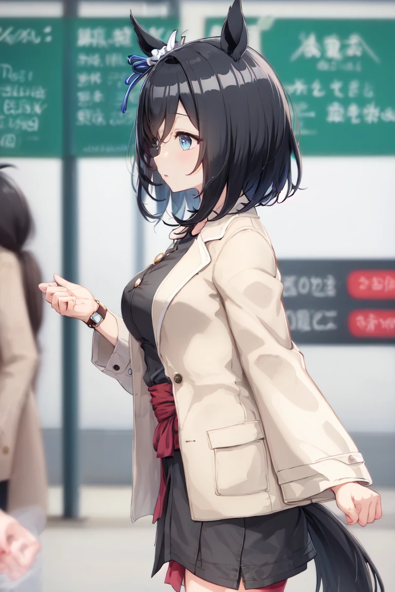 casual, hair ornament, ear ribbon, white scrunchie, wide sleeves, long sleeves, brown jacket, open clothes, open jacket, sash, buttons, black dress