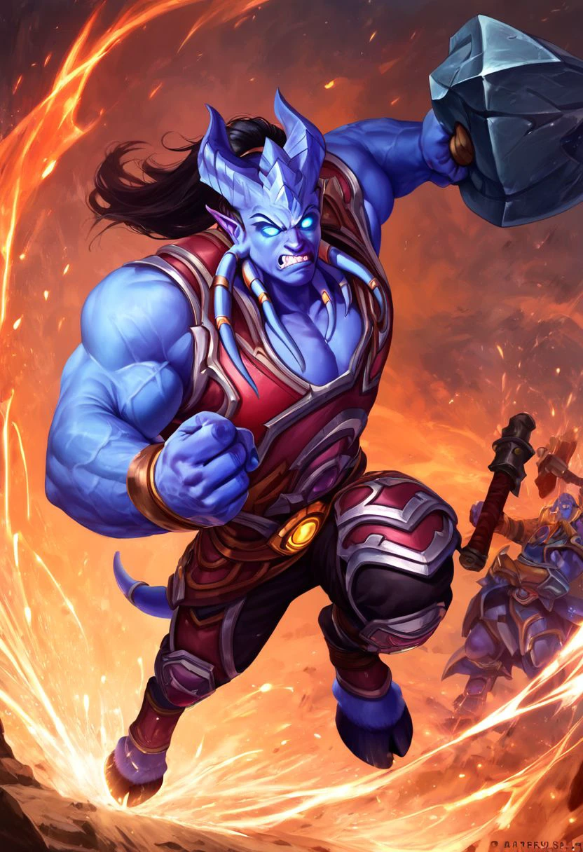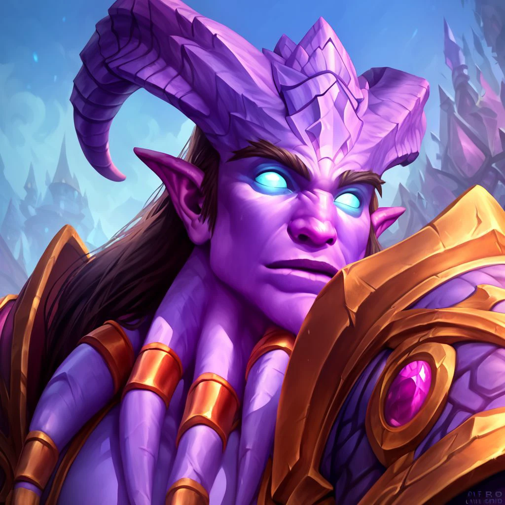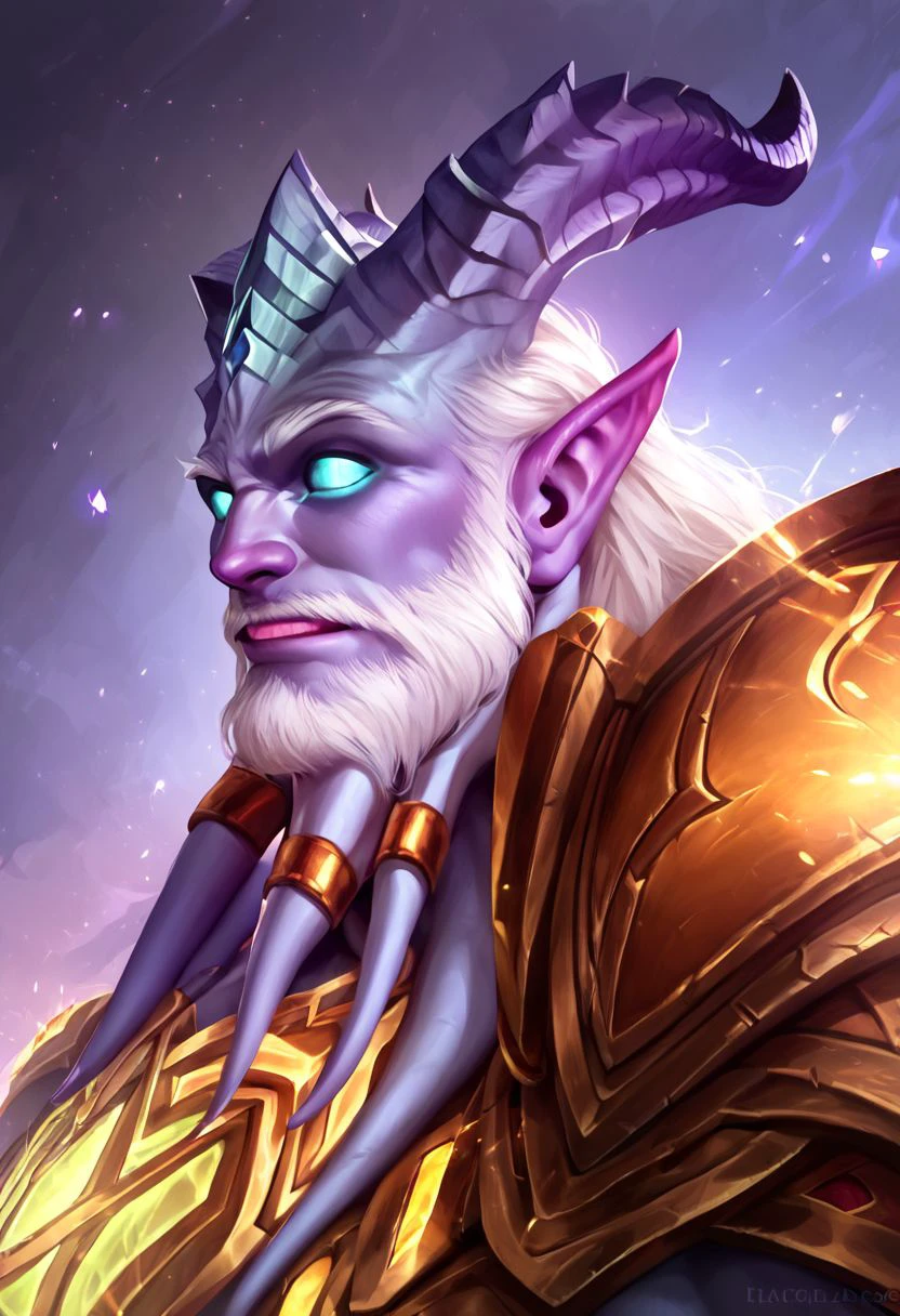1boy, Mdraenei, horns, pointy ears, glow colored eyes, colored skin,