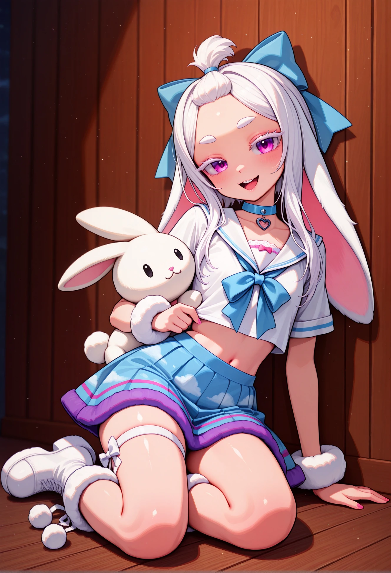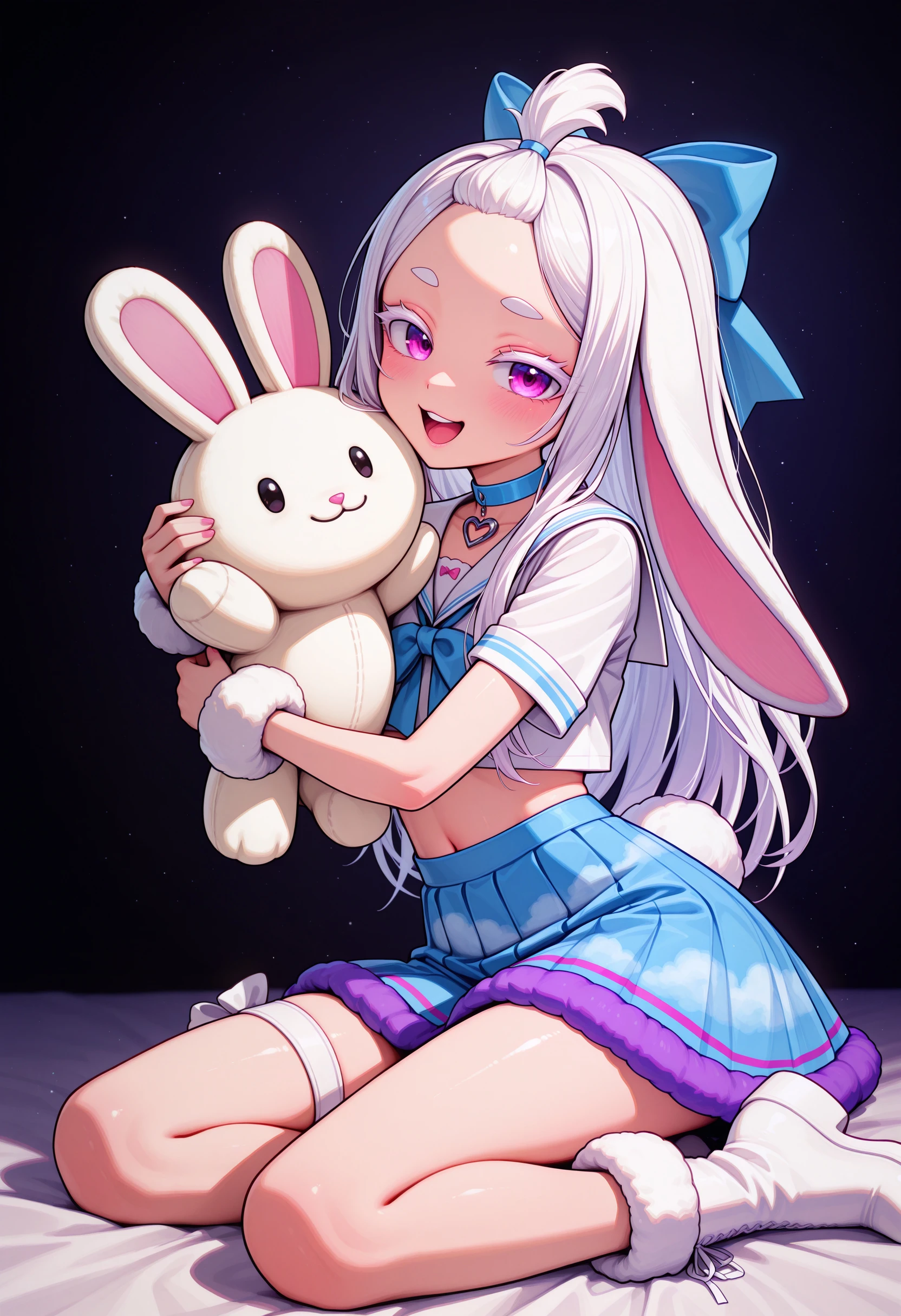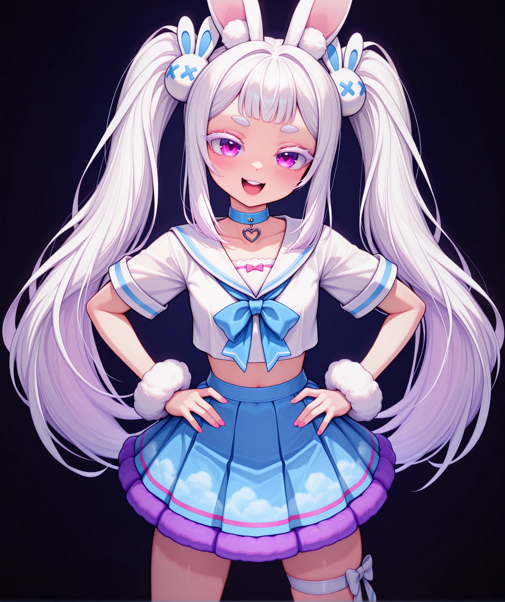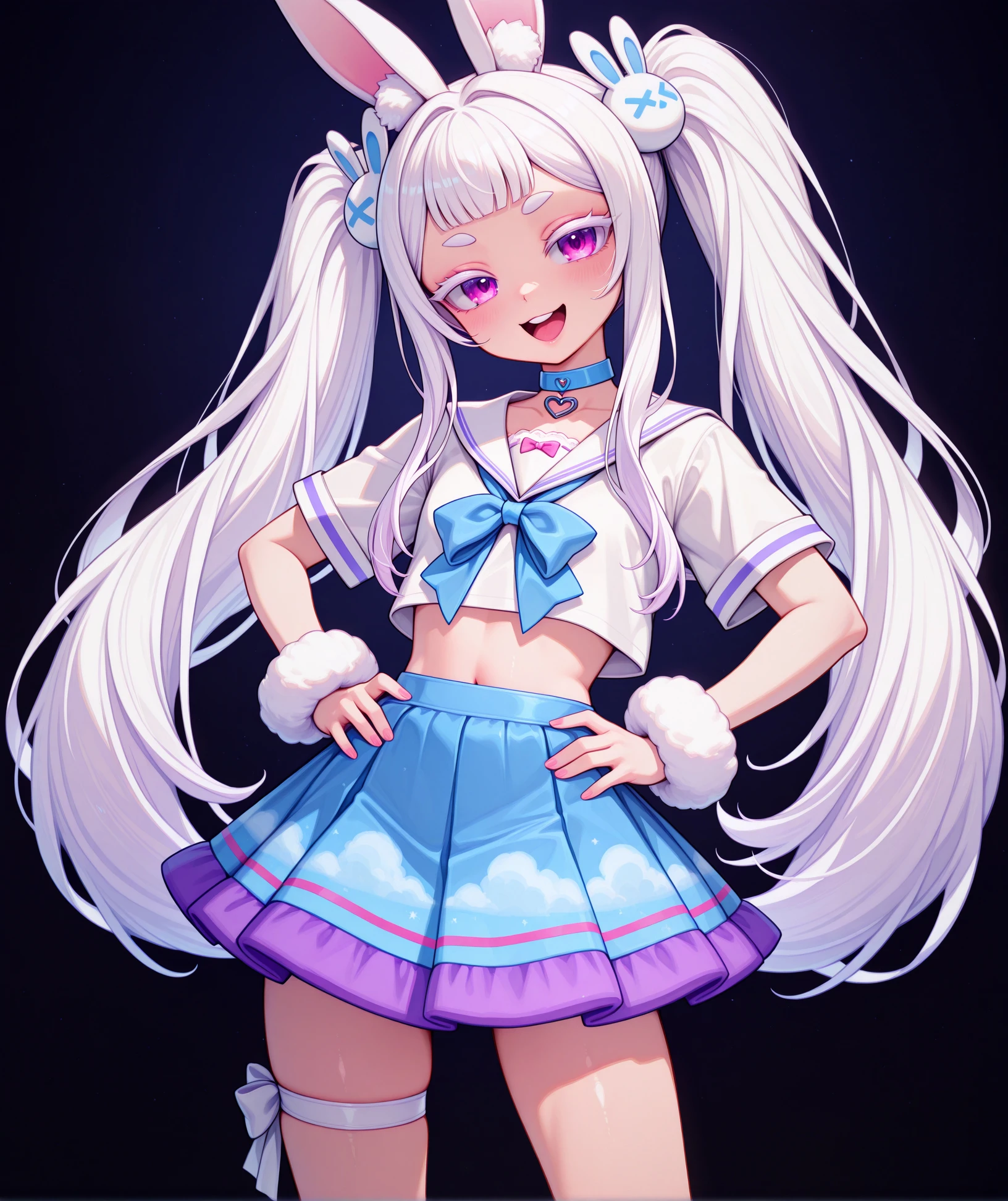 blue choker, heart choker, sailor shirt, flat chest, midriff, fur wrist cuffs, blue skirt, cloud print skirt, purple trim, fur trim, white thigh strap, white thigh bow, white boots, fur-trimmed boots, pom pom (clothes), rabbit tailmwpdef, rabbit girl, rabbit ears, center-flap bangs, double-parted bangs, twintails, white hair, rabbit hair ornament, white eyelashes, short eyebrows, thick eyebrows,