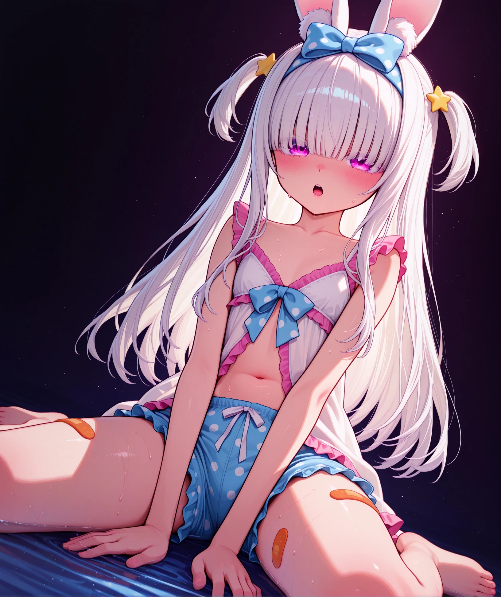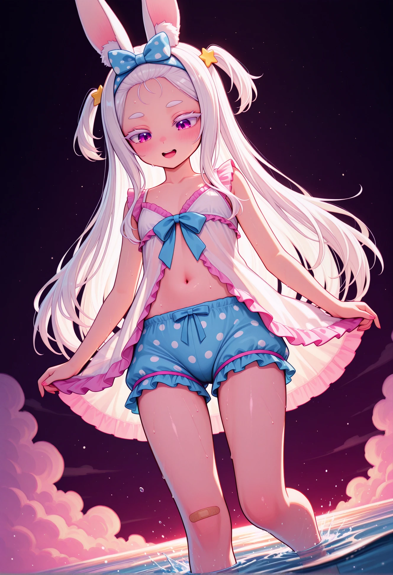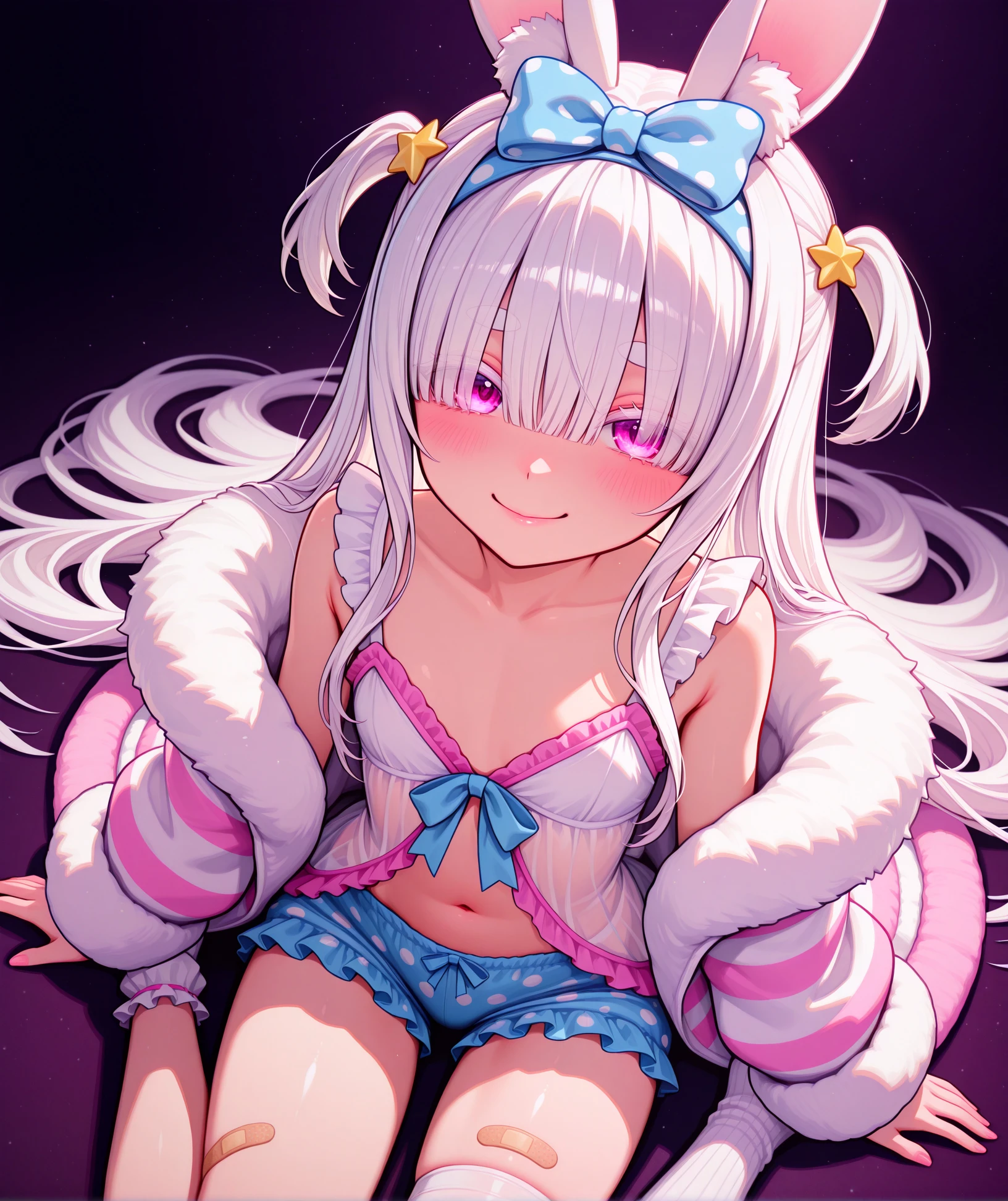 mwpd25, rabbit girl, rabbit ears, white hair, star hair ornament, two side up, bow hairband, blue hairband, polka dot hairband, forehead, hair pulled back, thick eyebrows, short eyebrows, white eyelashes,