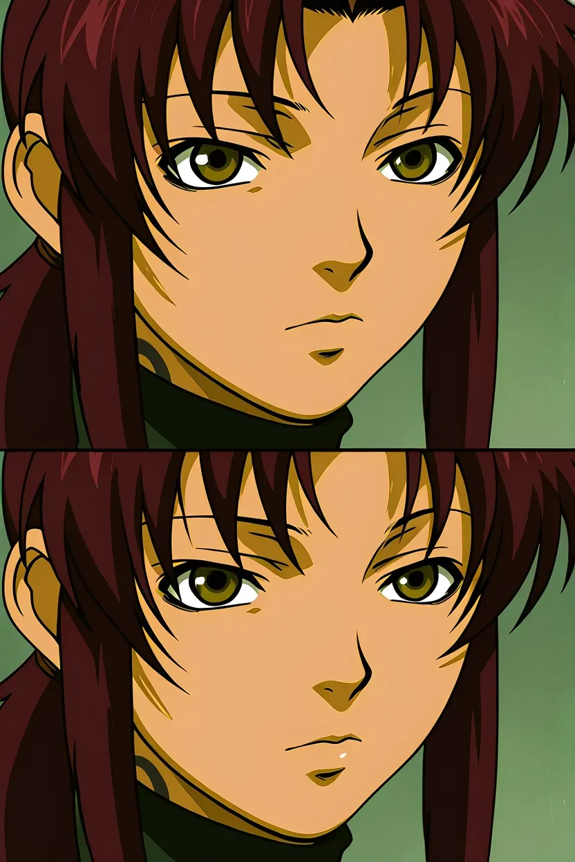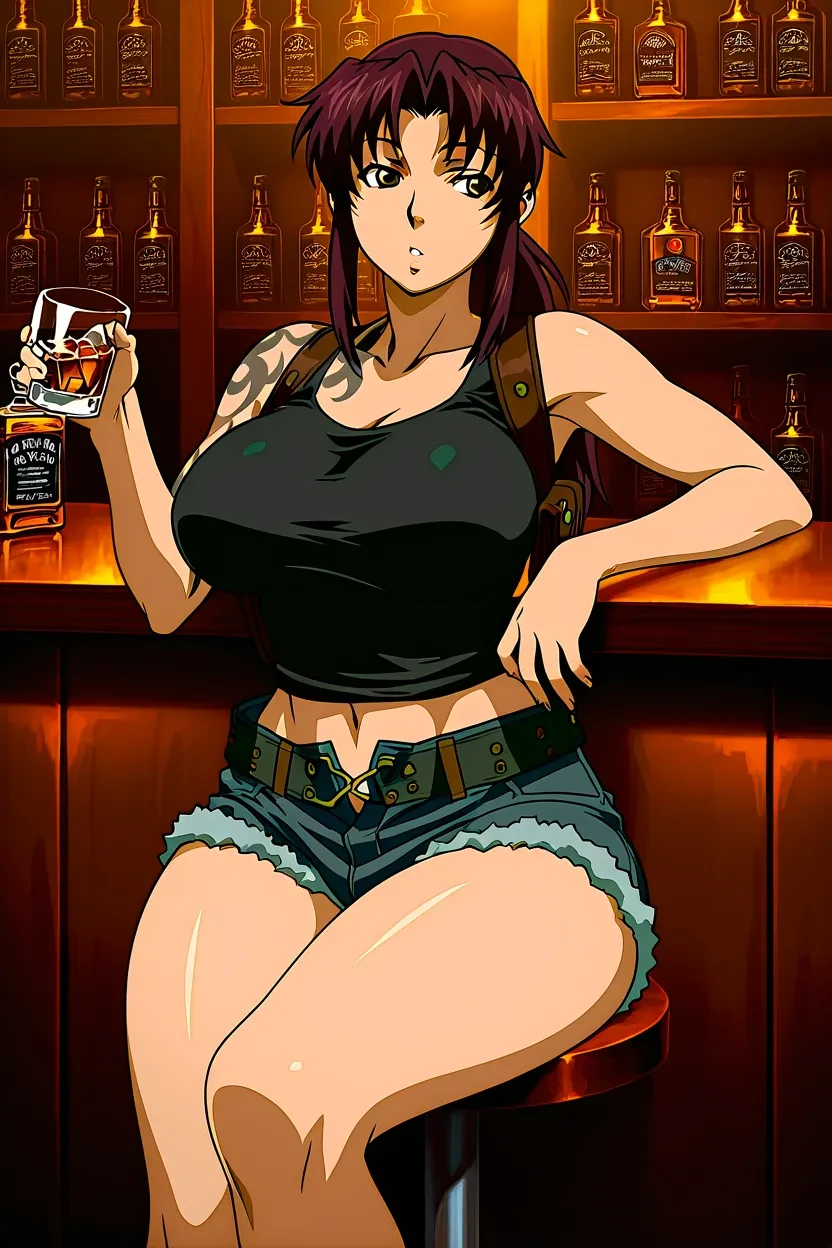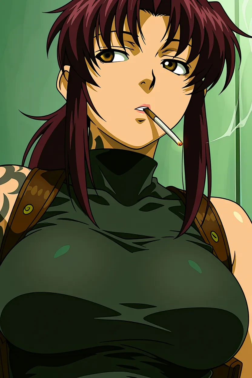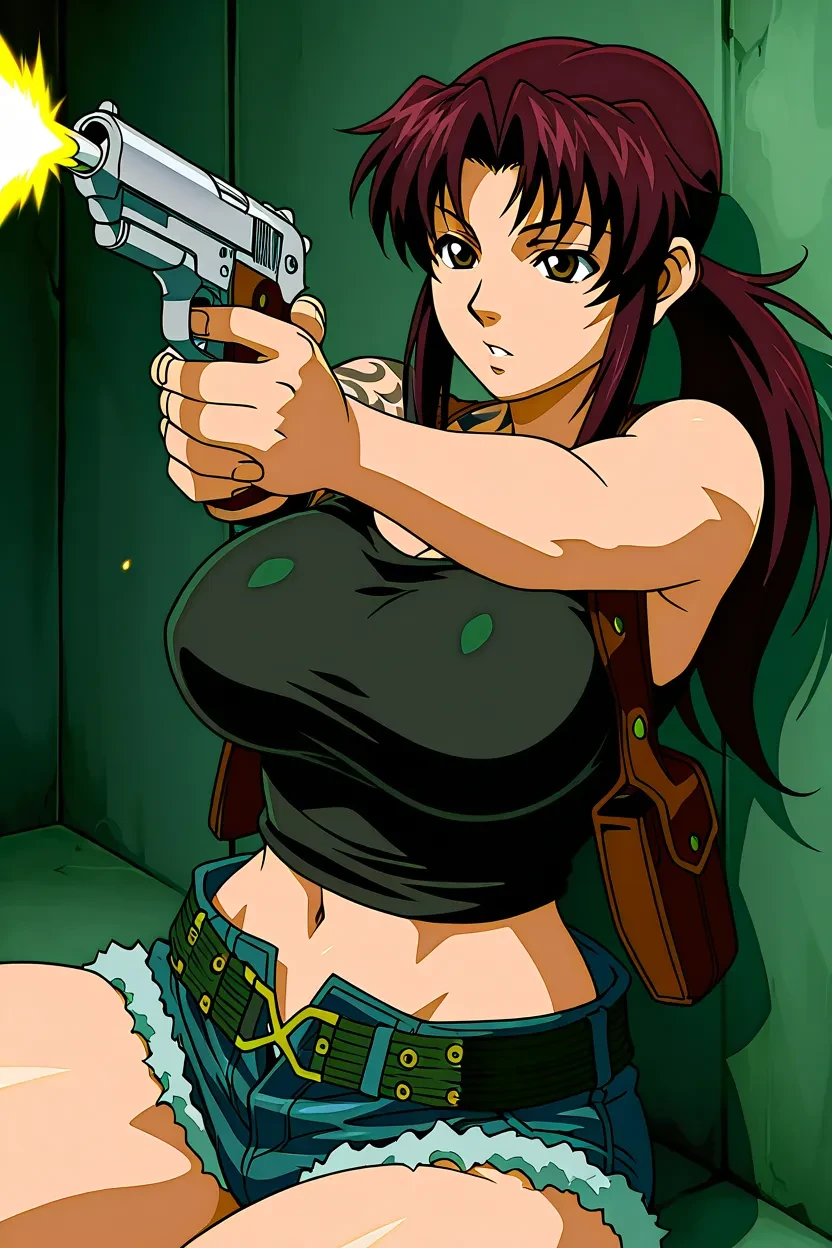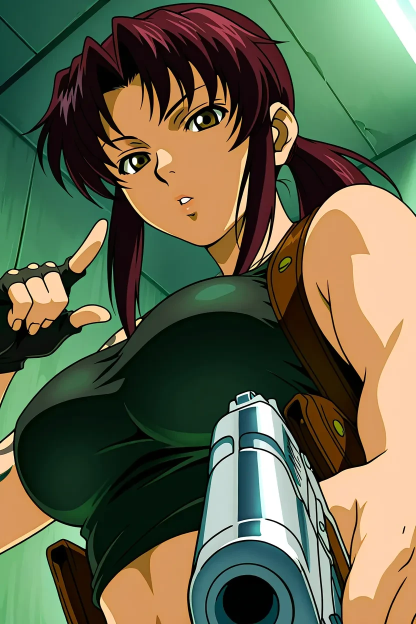 1girl, Revy (Black Lagoon), brown hair, long hair, brown eyes, ponytail, thick lips, glossy lips, huge breasts , black_lagoon_art_style, HD, high-resolution, 4k, superb quality, clean animation