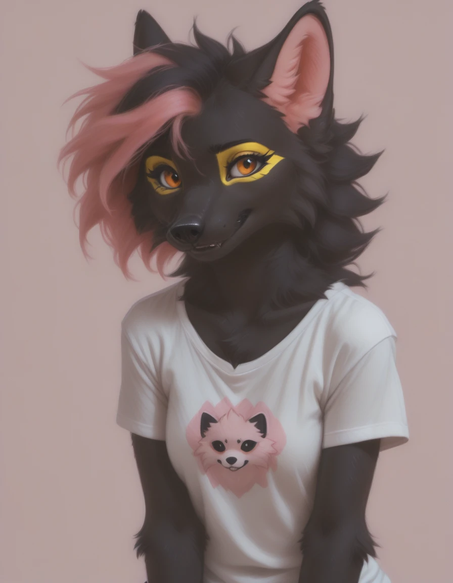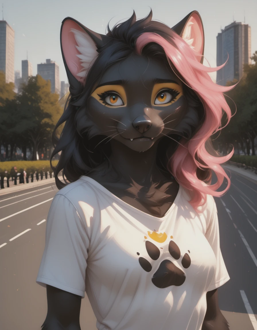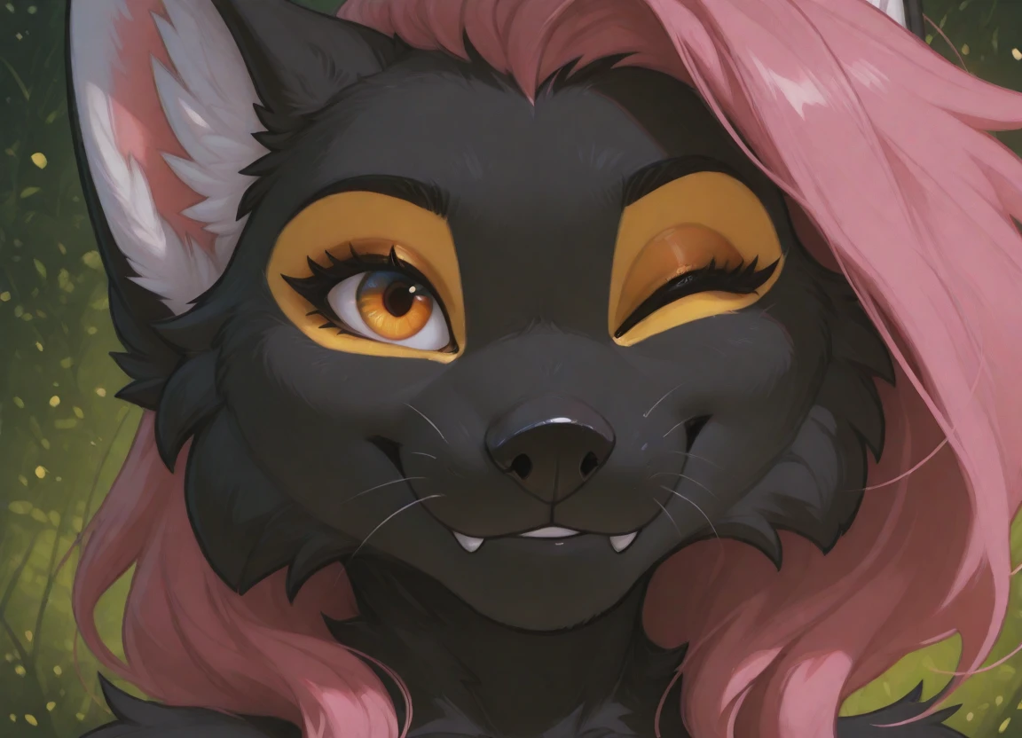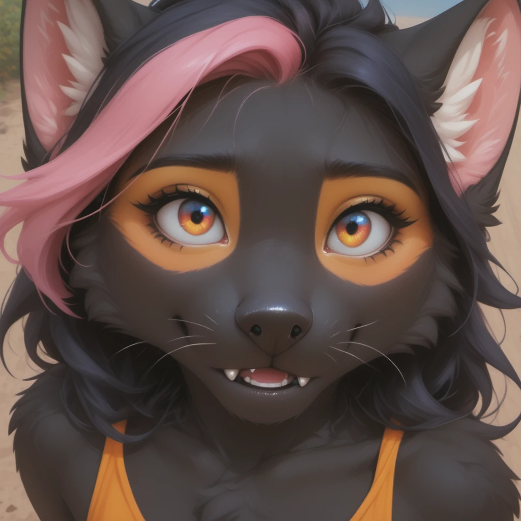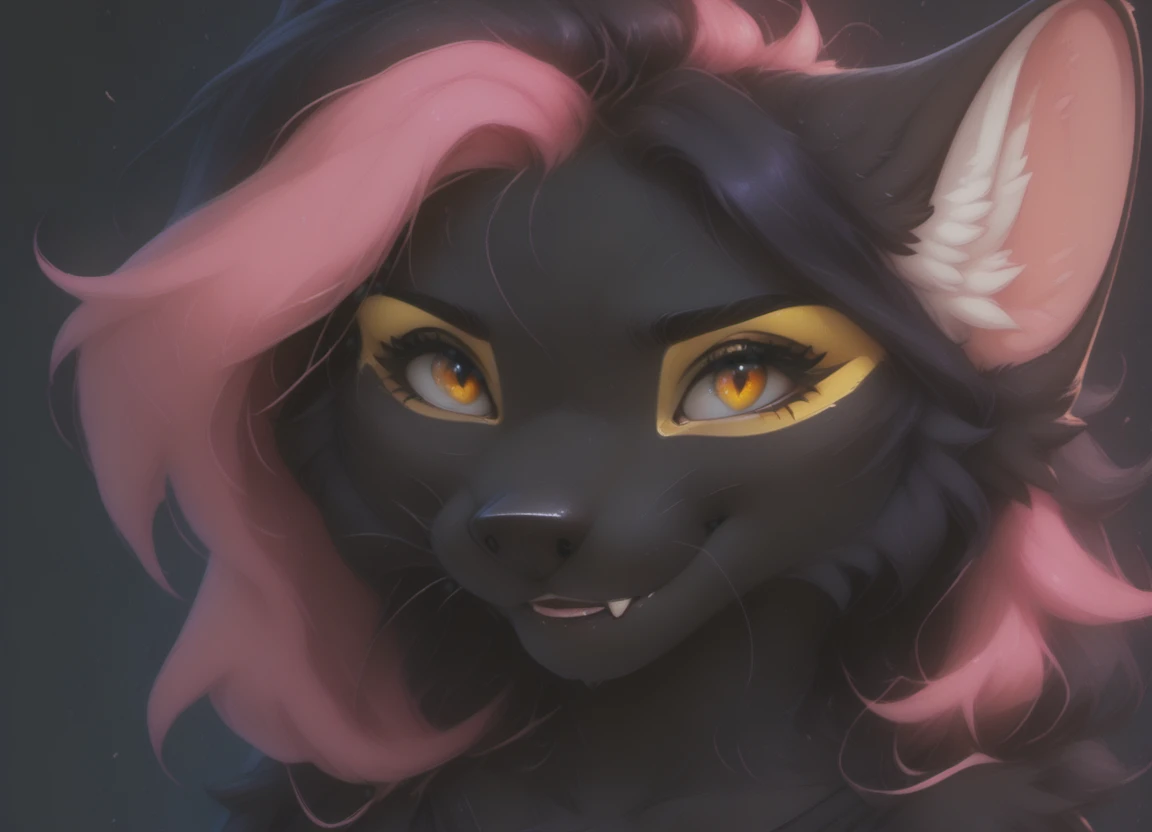 Original form: anthro, female, marten, black nose, bright amber eyes, sharp white claws, original yellow eye makeup, pink hair bang, and her upper fangs have grown a bit too big so often can be seen even when she's not smiling, her body fur is completely uniform black, except the inner ear white fluff, and the makeup / painted areas, ??????? are black, breasts are small.