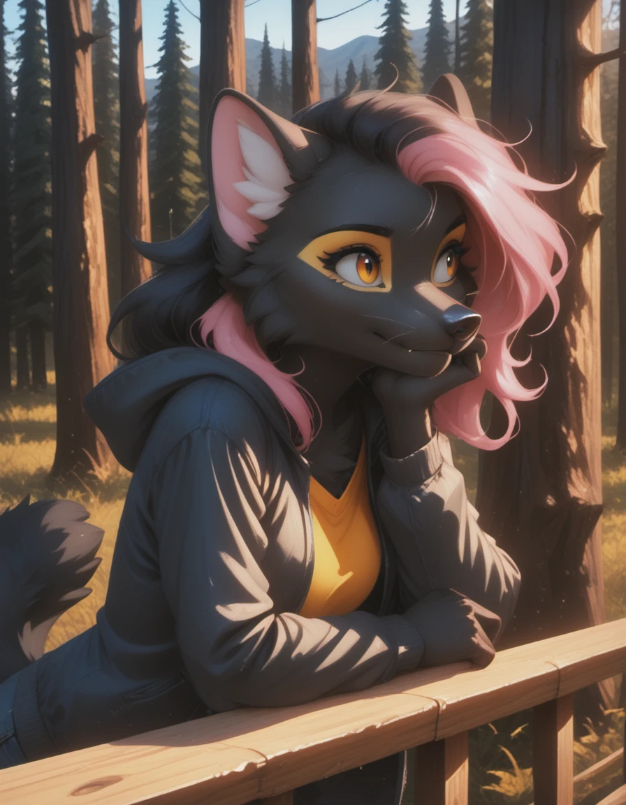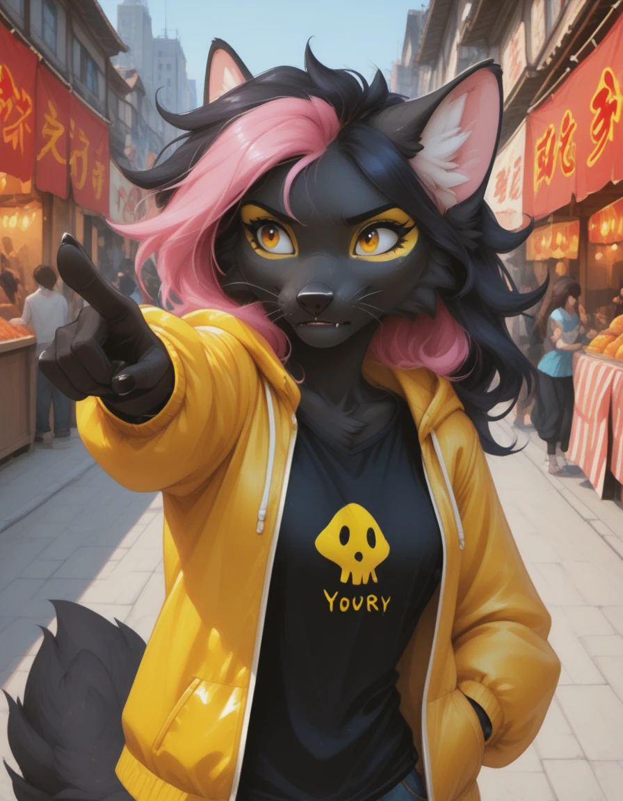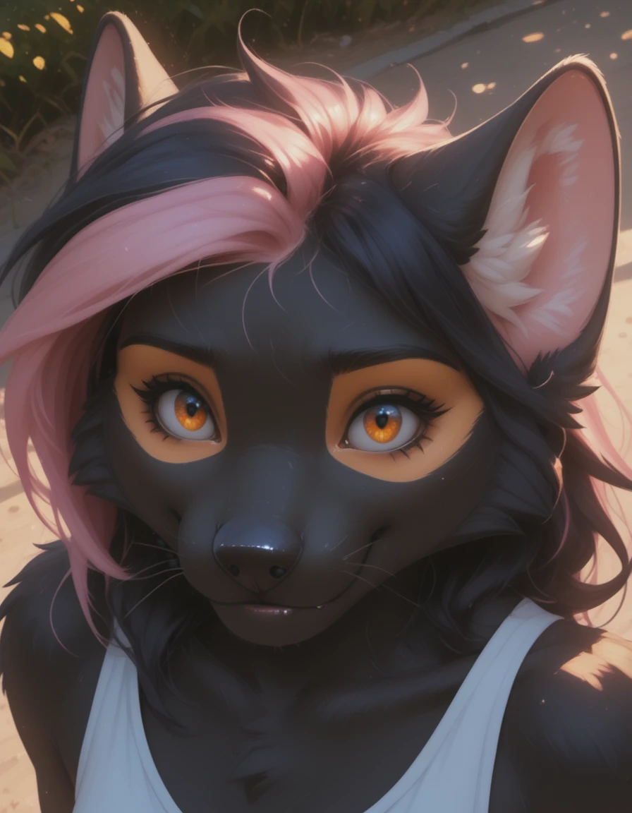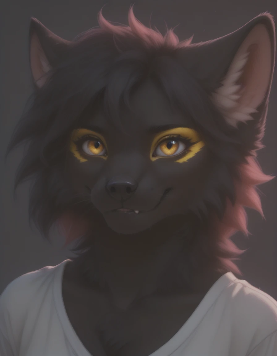 Original form: anthro, female, marten, black nose, bright amber eyes, sharp white claws, original yellow eye makeup, pink hair bang, and her upper fangs have grown a bit too big so often can be seen even when she's not smiling, her body fur is completely uniform black, except the inner ear white fluff, and the makeup / painted areas, ??????? are black, breasts are small.