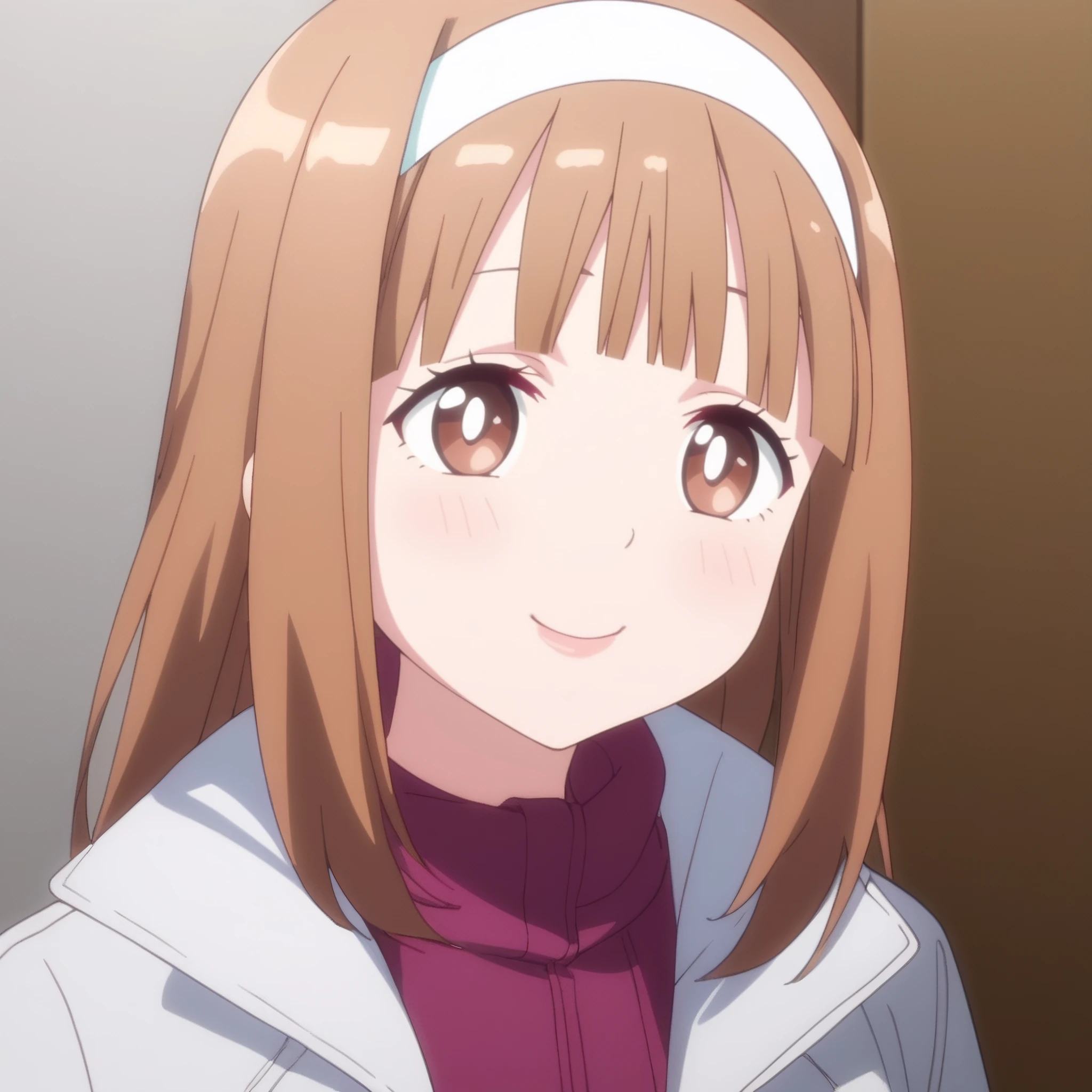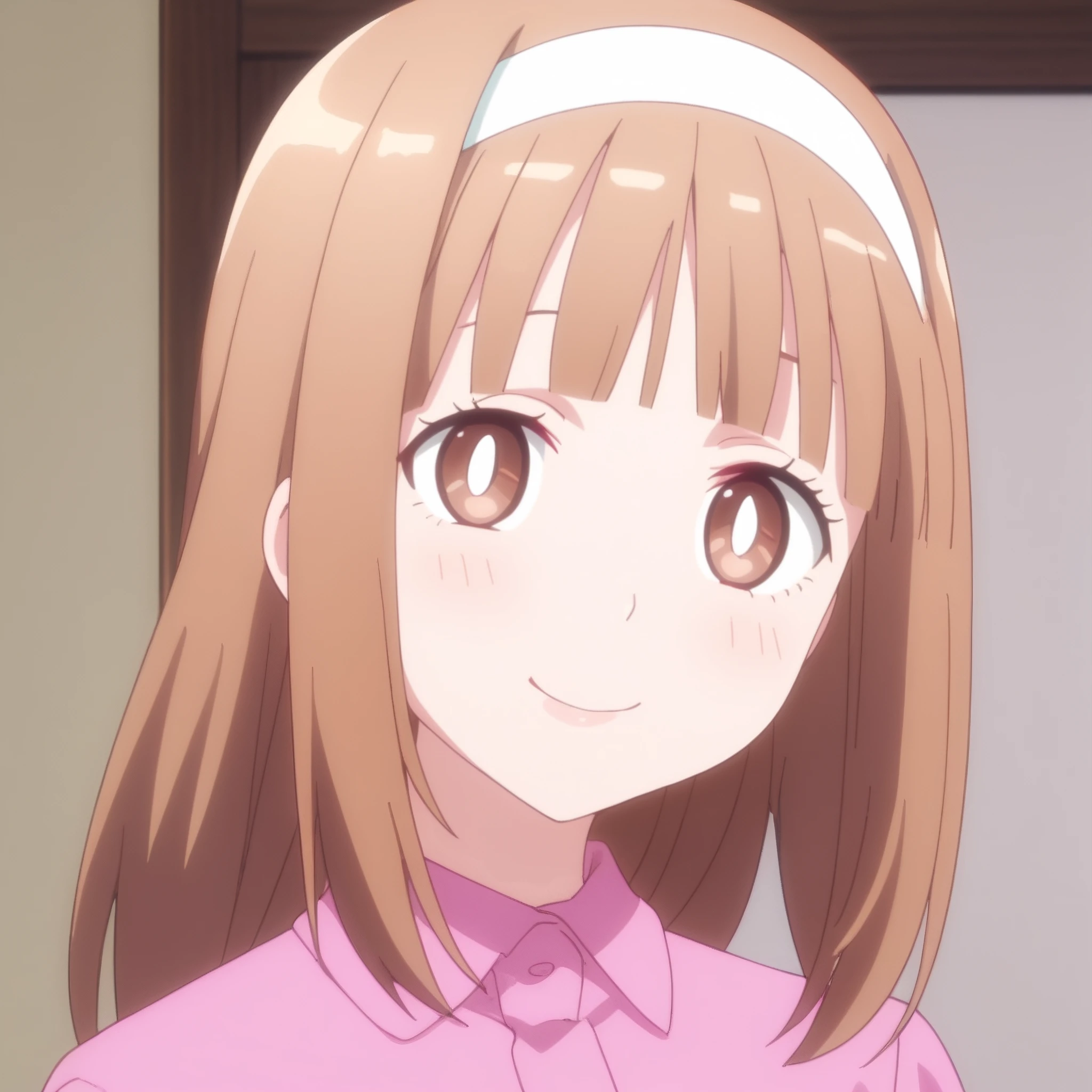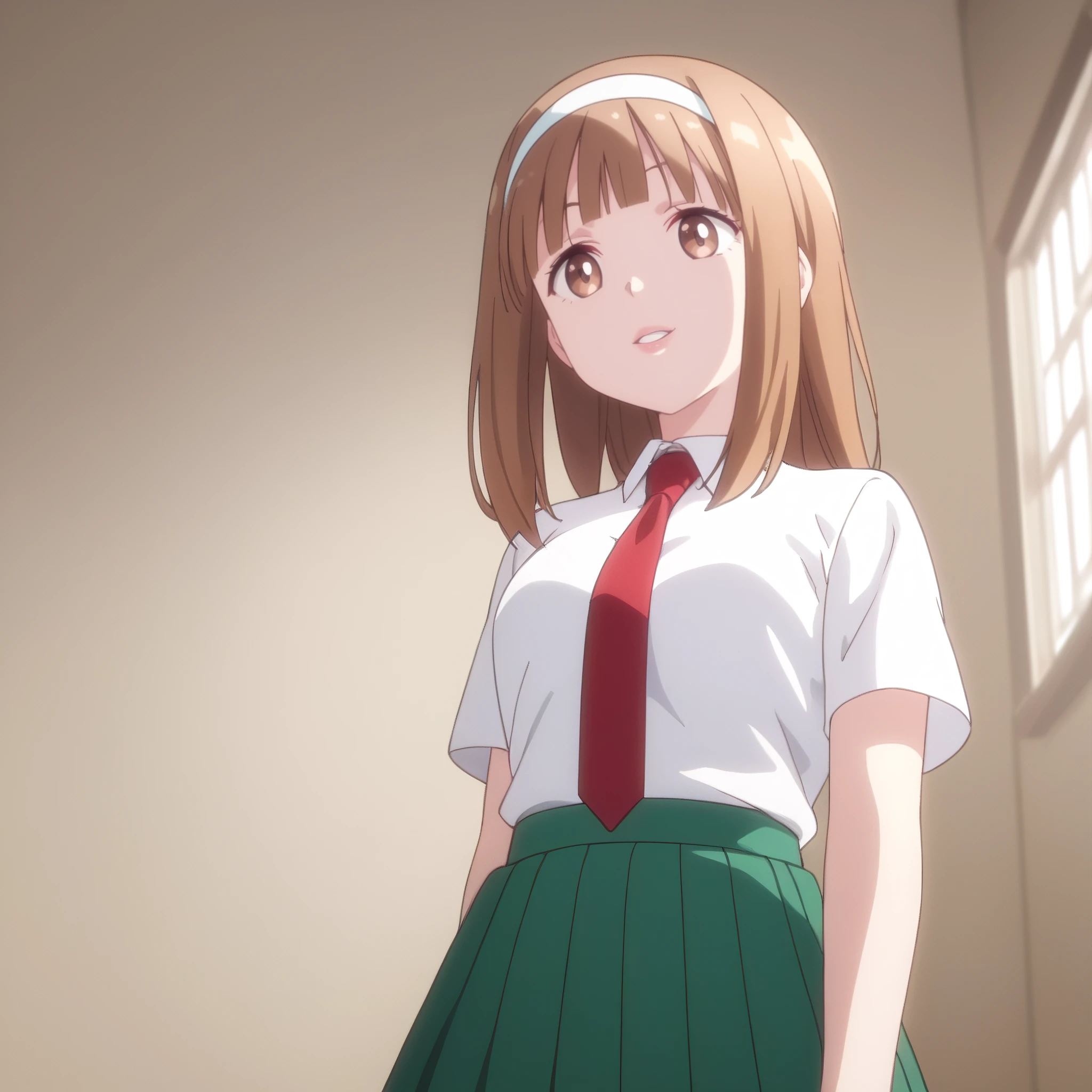 ANAAiko, brown hair, long hair, hairband, bangs, white hairband, blunt bangs, brown eyes, eyebrows visible through hair, medium hair, headband,