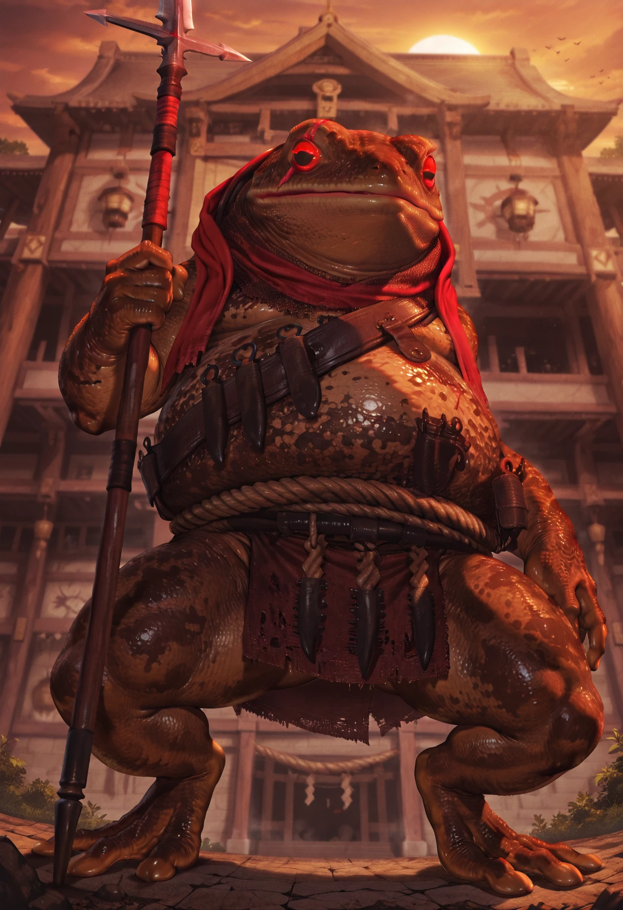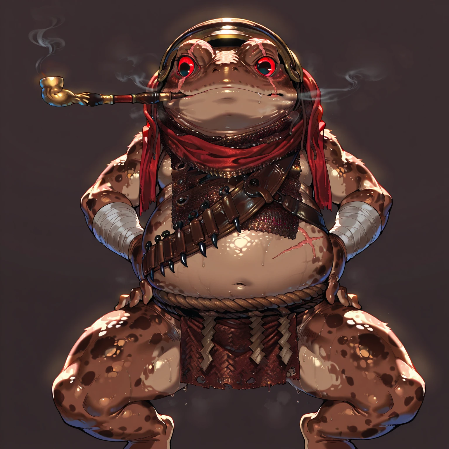 Tags: semi-anthro, amphibian, monster, brown skin, spotted pattern, chainmail, bandolier, red scarf, red sclera, black eyes, rope loincloth, eye scar