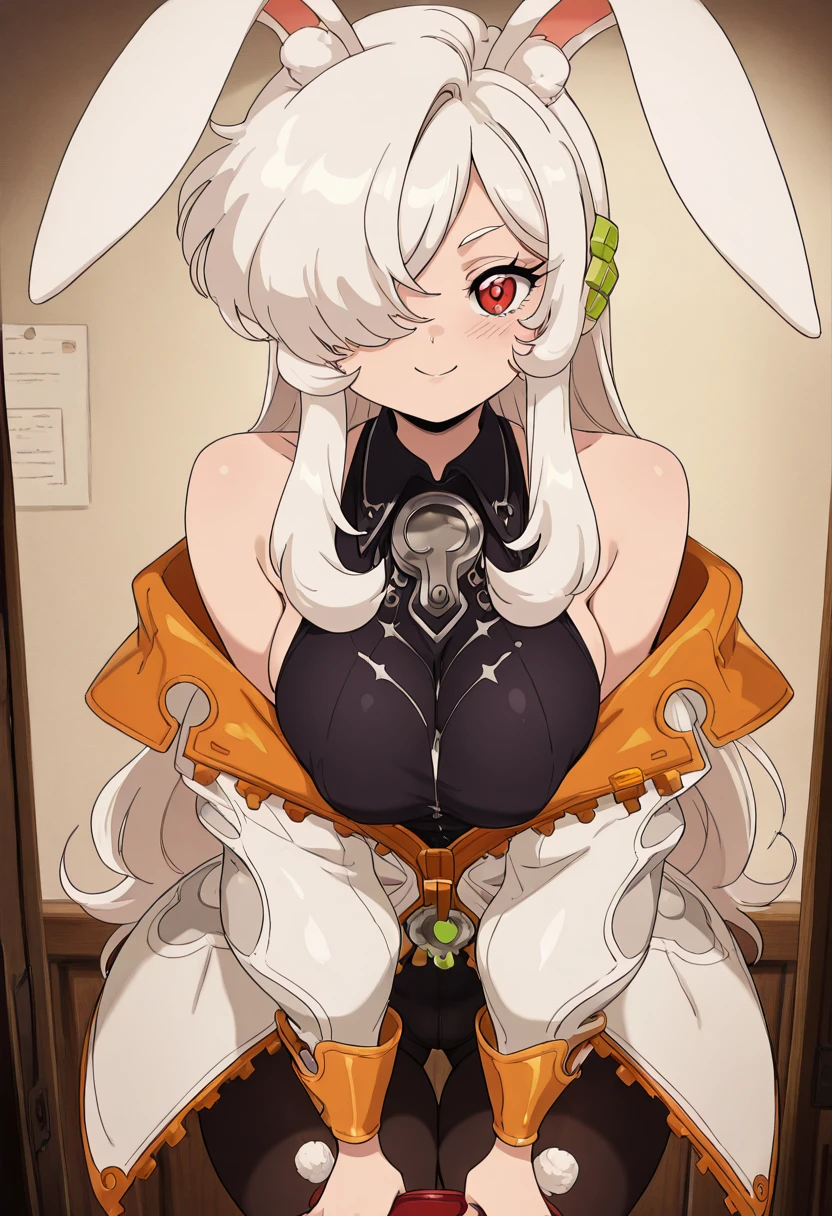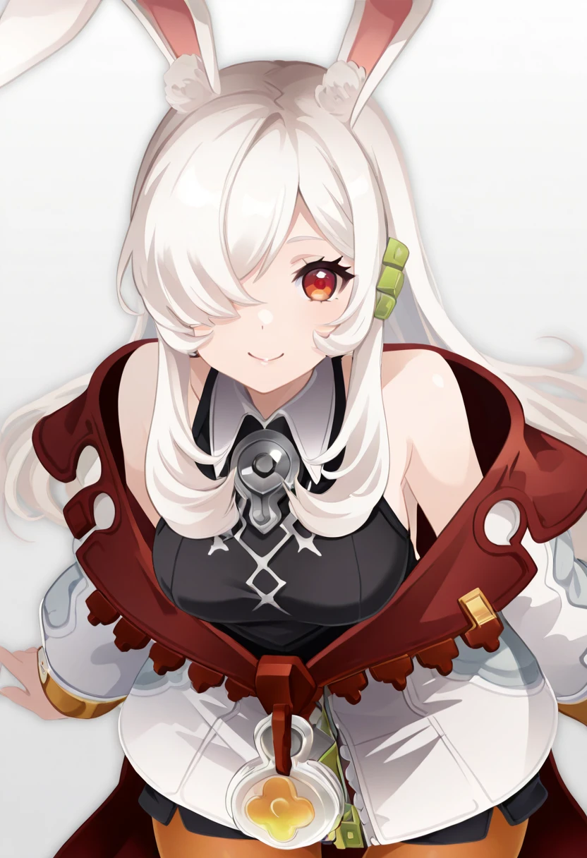 zzKira, red eyes, hair over one eye, white hair, long hair, rabbit ears, bare shoulders, collared shirt, off shoulder, black shirt, sleeveless shirt, white jacket, pantyhose,