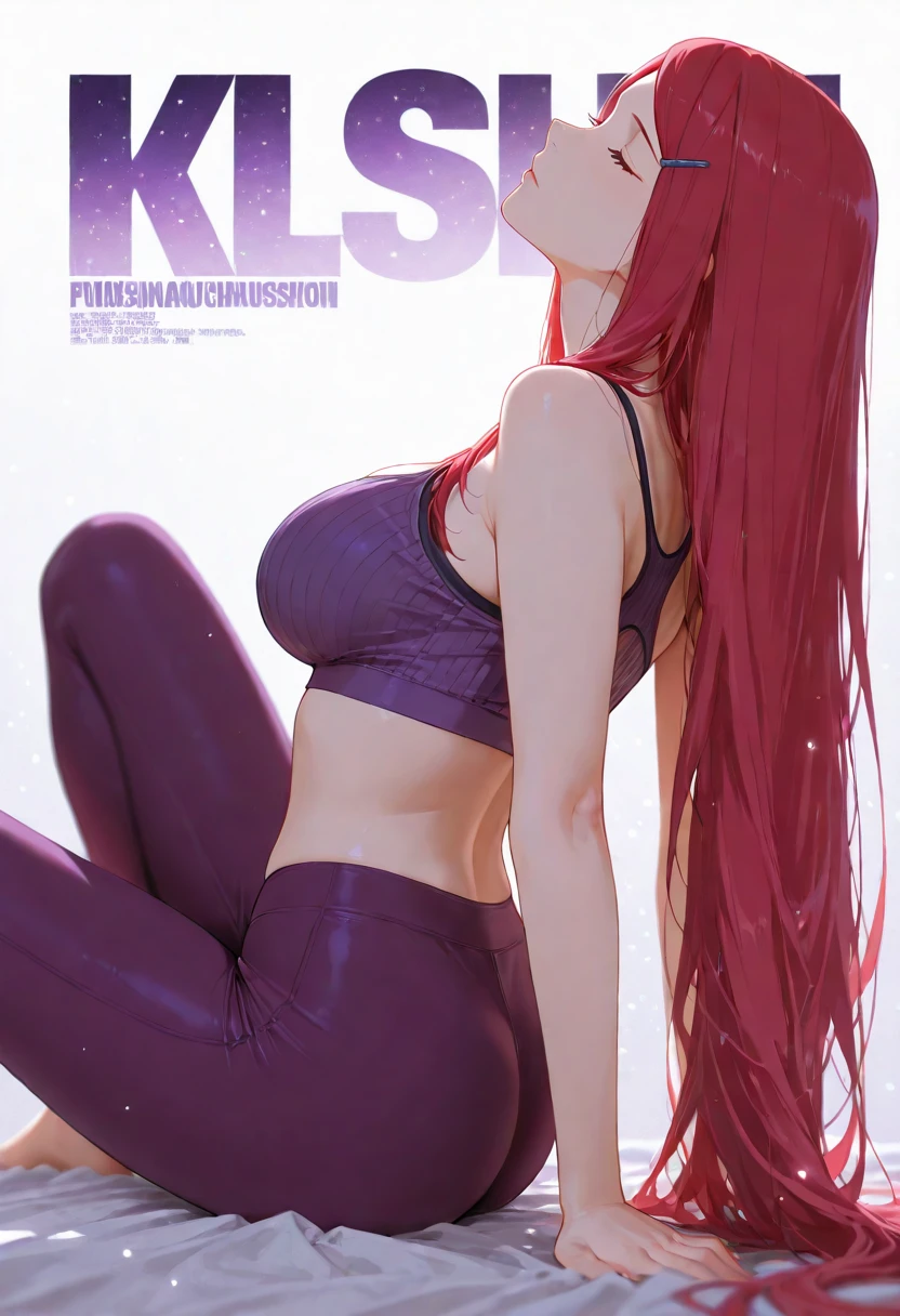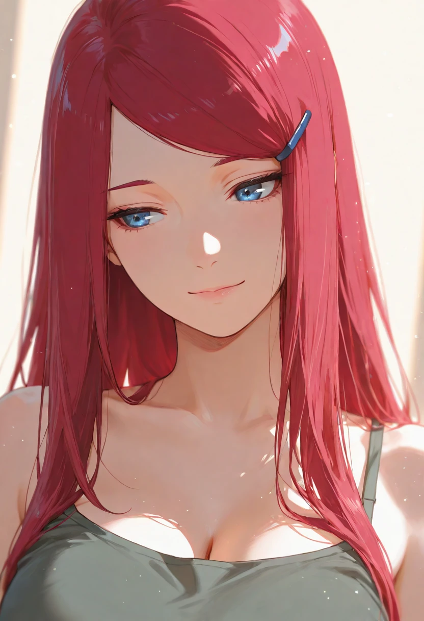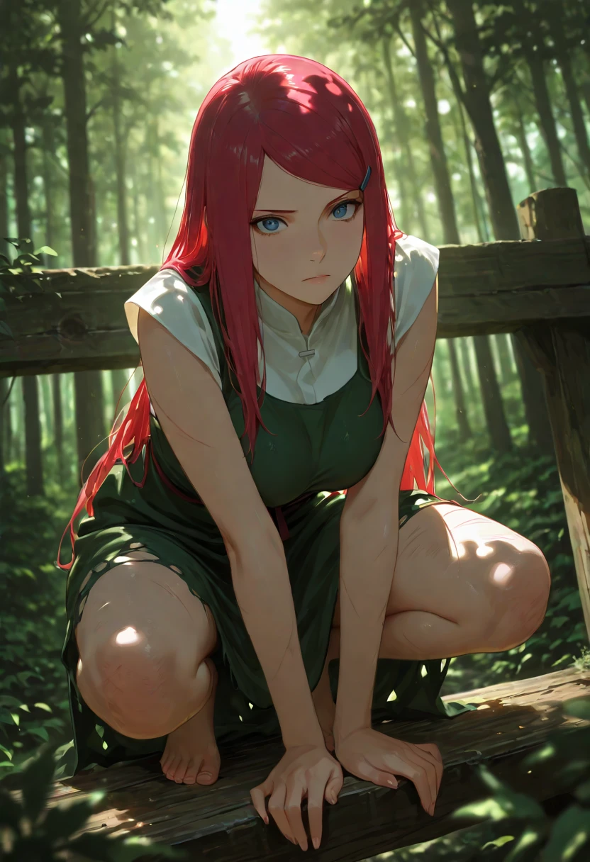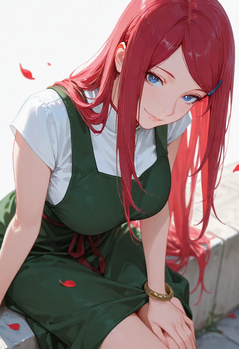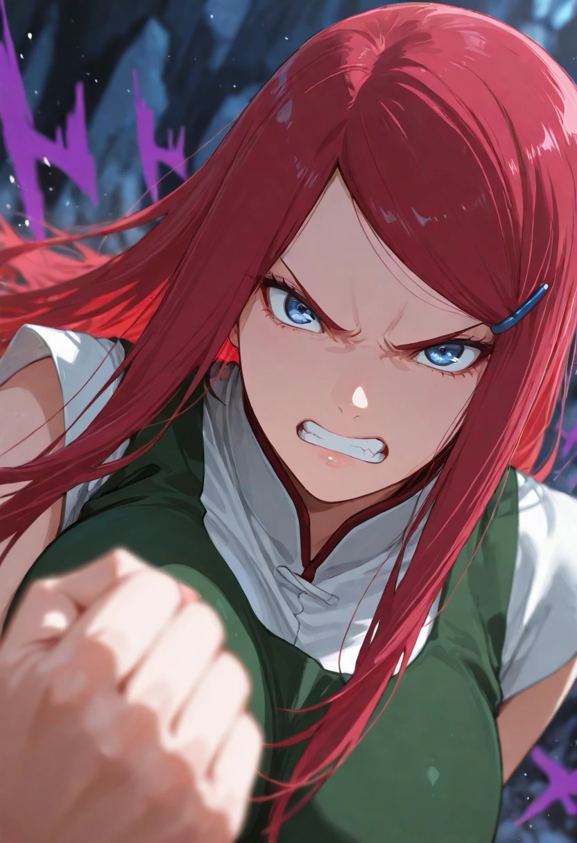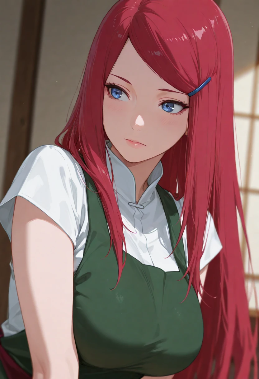 kushinauzumaki, kushina, 1girl, solo, red hair, very long hair, blue eyes, hairclip, apron,