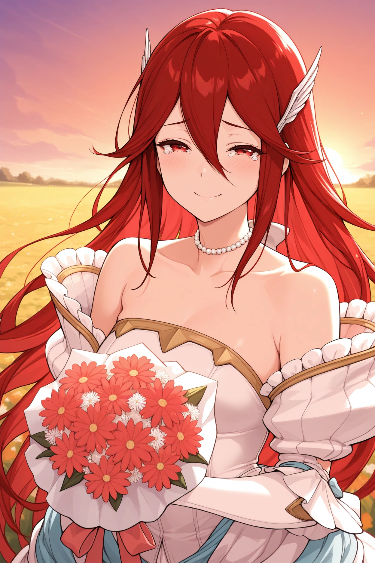 Add "bricor, red hair, long hair, red eyes, wing hair ornament, pearl choker, wedding dress, strapless, bridal gauntlets" for Bridal Cordelia.