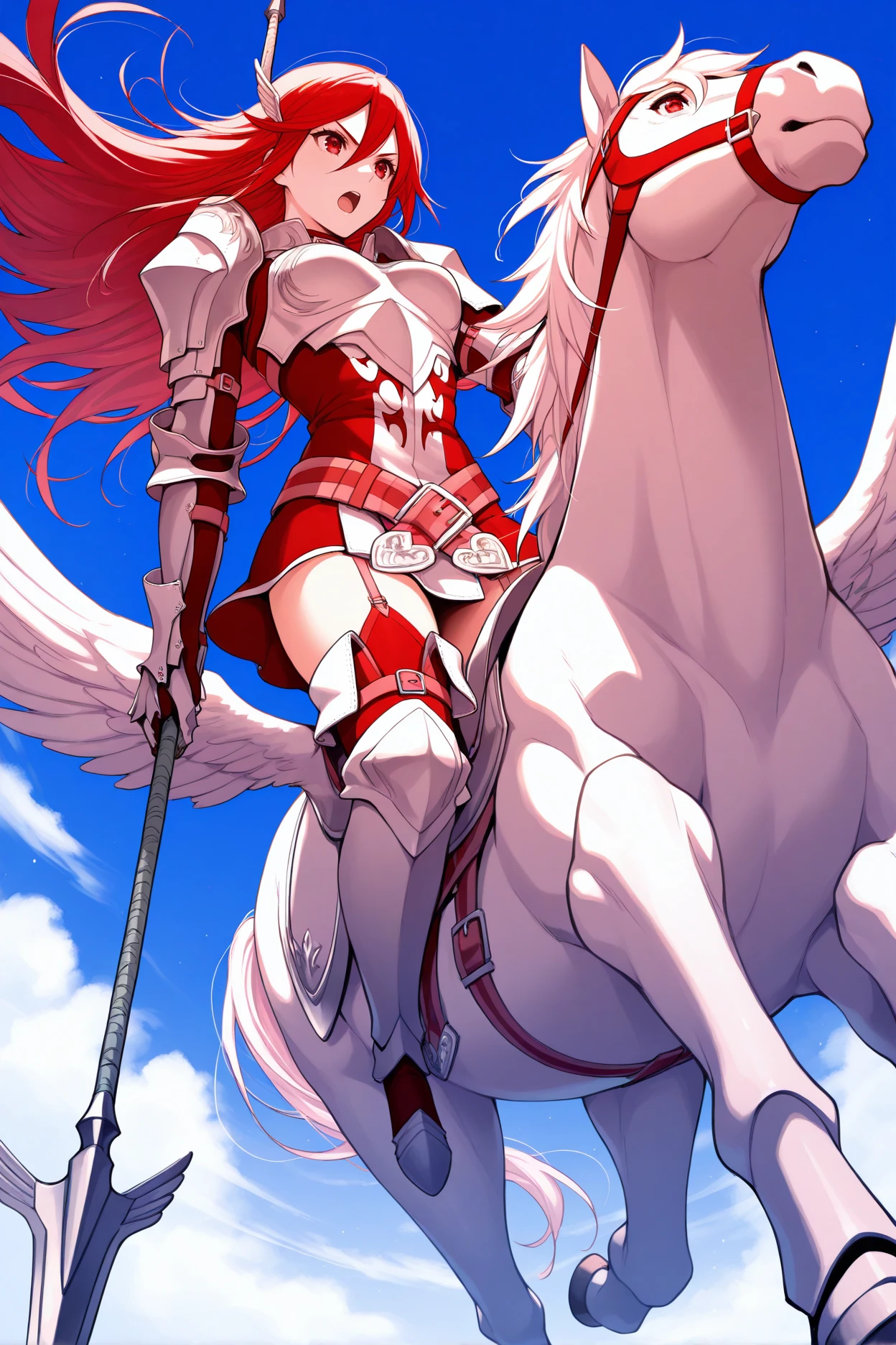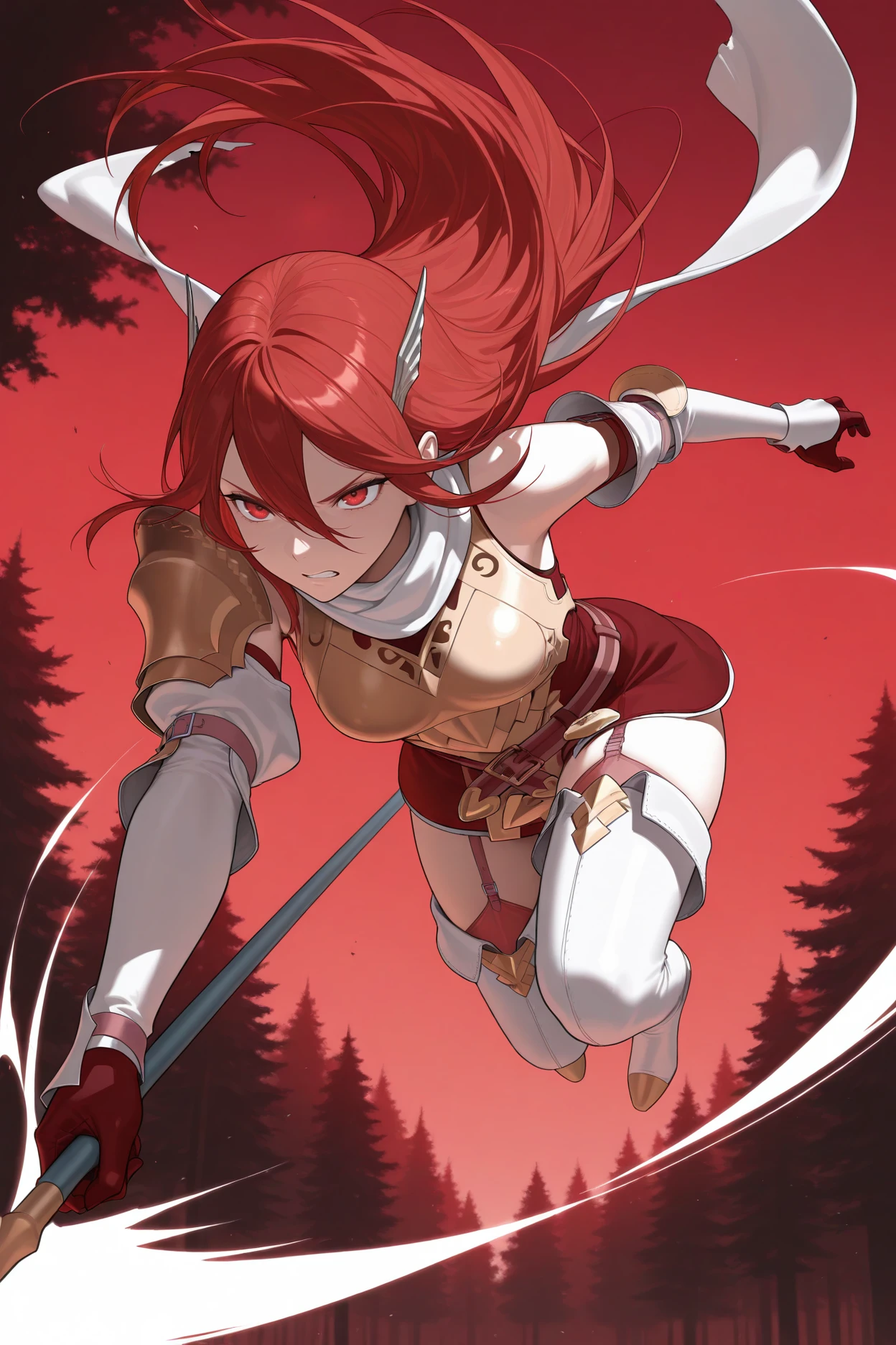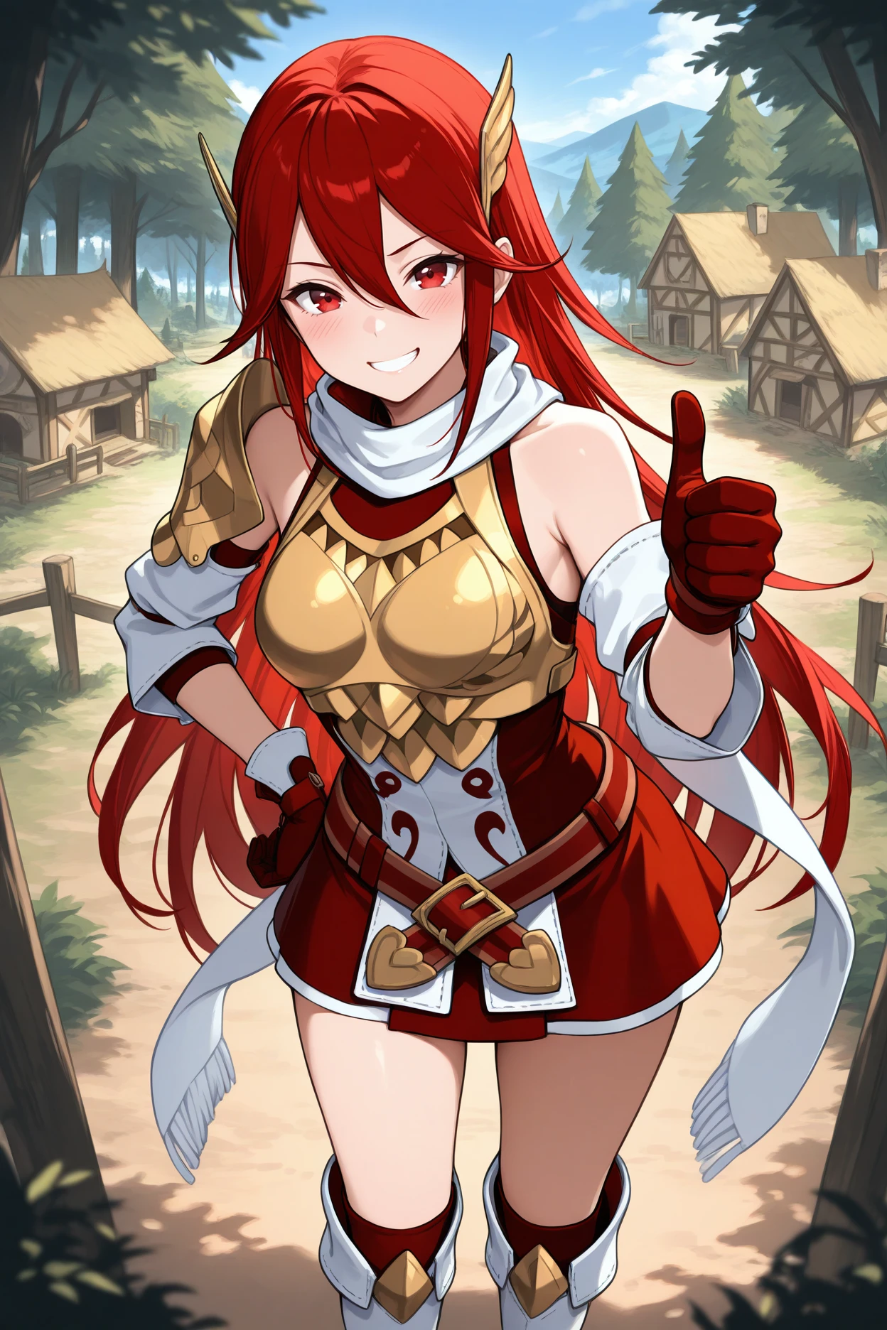 Add "respcor, red hair, long hair, red eyes, wing hair ornament, red dress, short dress, belt, white scarf, single shoulder armor, bronze breastplate, detached sleeves, red gloves, garter straps, thigh boots, white boots" for Resplendent Cordelia.