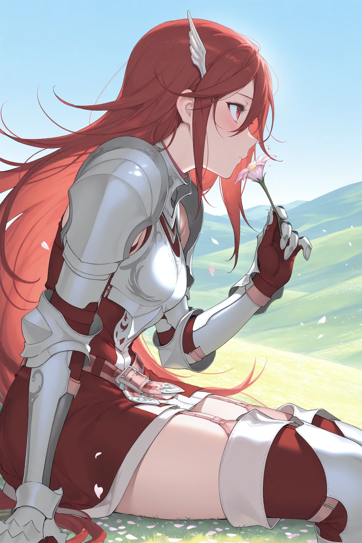 Add "basecor, red hair, long hair, red eyes, wing hair ornament, red dress, short dress, armored dress, belt, gauntlets, garter straps, thigh boots" for her regular appearance.