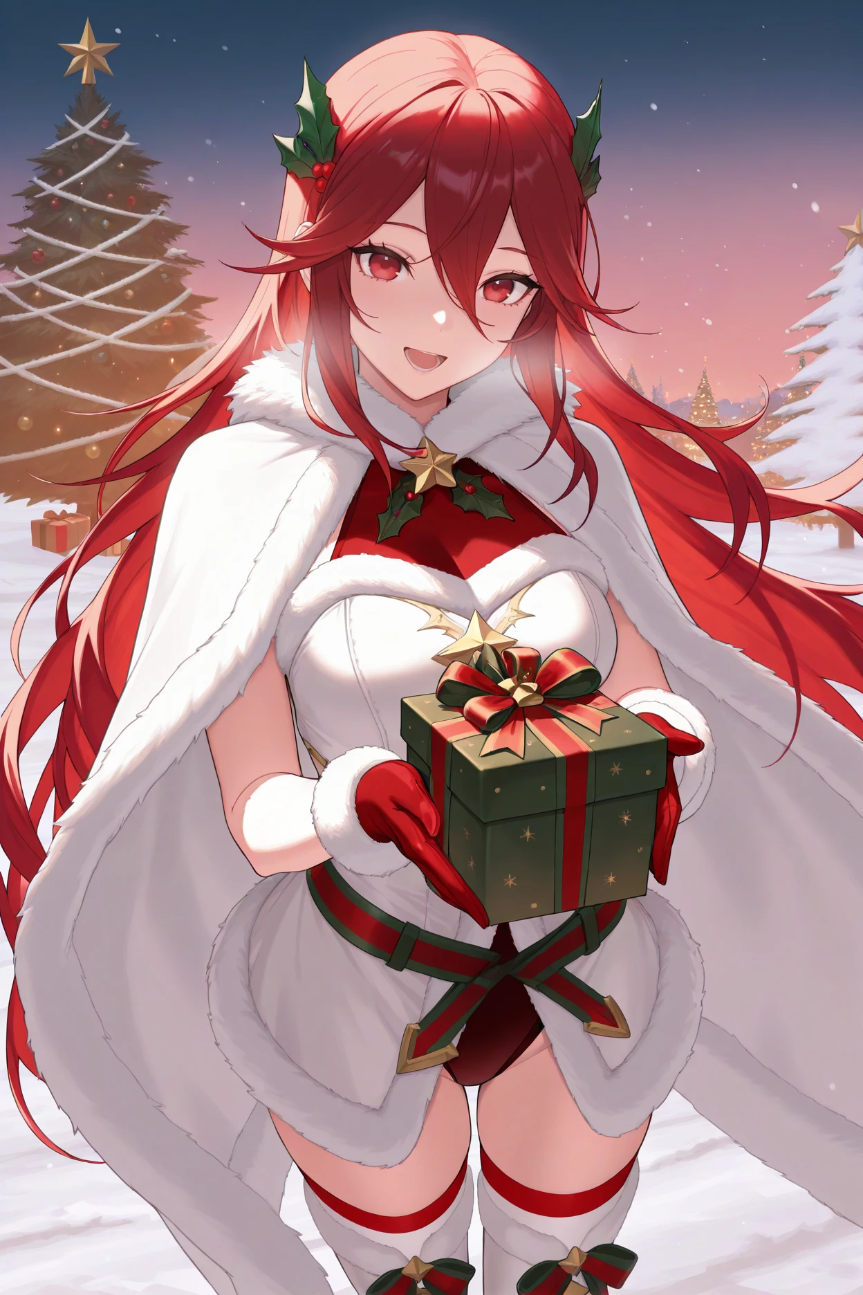Add "wtrcor, red hair, long hair, red eyes, leaf hair ornament, white cape, fur trim, white dress, fur-trimmed dress, christmas, white thighhighs, red gloves" for Winter Cordelia.