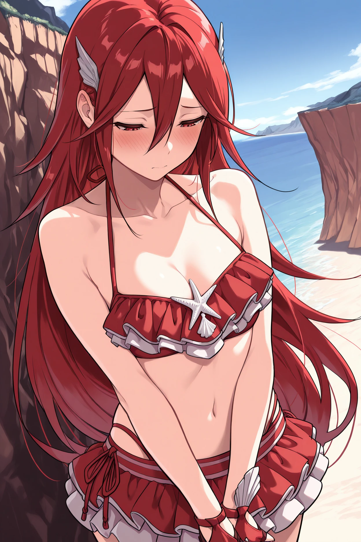 Add "sumrcor, red hair, long hair, red eyes, wing hair ornament, collarbone, red bikini, bare shoulders, frilled bikini, cleavage, bikini skirt, red gloves, fingerless gloves" for Summer Cordelia.