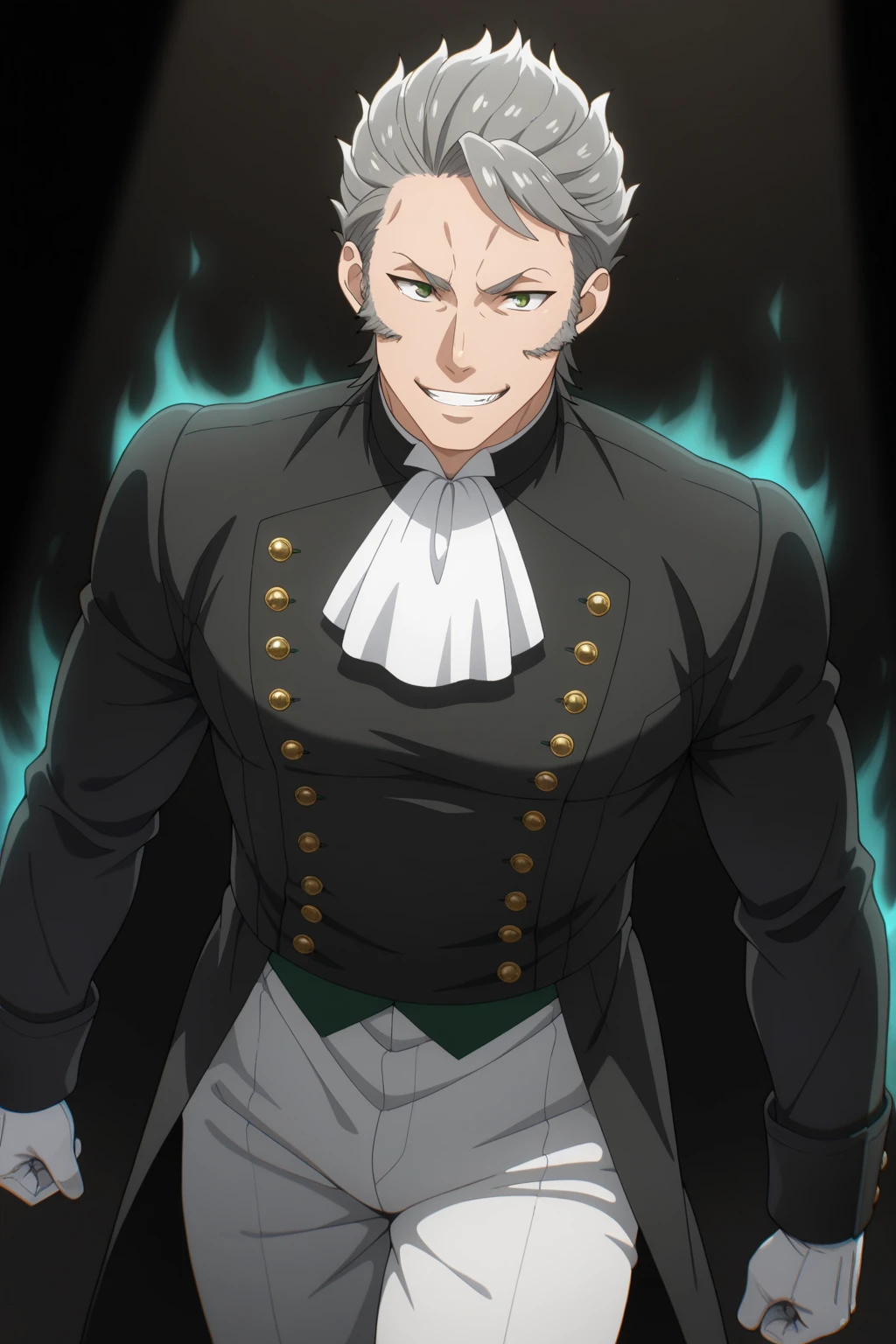 wolfram_gelzer,grey hair,facial hair,short hair,green eyes,uniform,white ascot,white pants,knee boots,white gloves,black jacket,coat,buttons,formal,