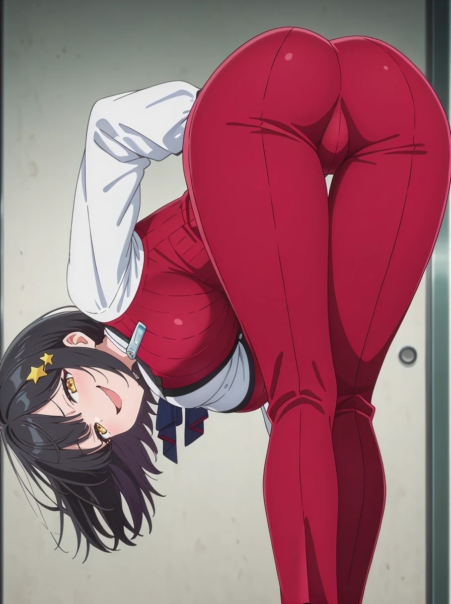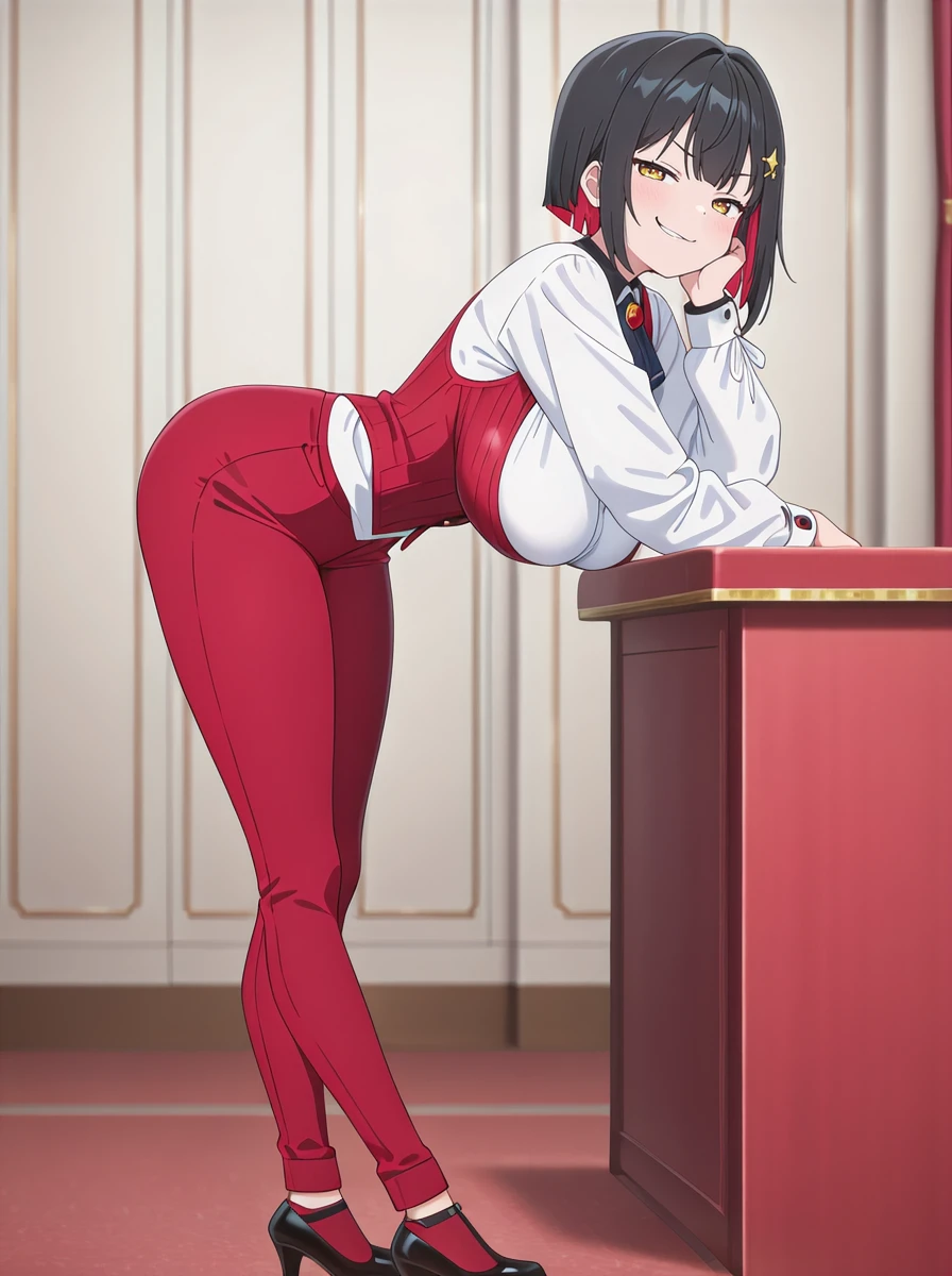 jackpot: rougenikkedef white_shirt, red pants hairclip, red vest, star hair ornament, high heels,