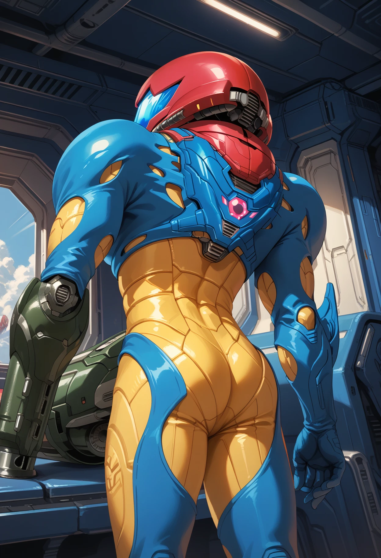 If genning without her helmet and using Pony's "samus aran" tag, use Regional Prompter to separate the "samus aran" tag and the Fusion Suit LoRA into separate regions. Otherwise the "samus aran, bodysuit" combination just gens Zero Suit Samus.