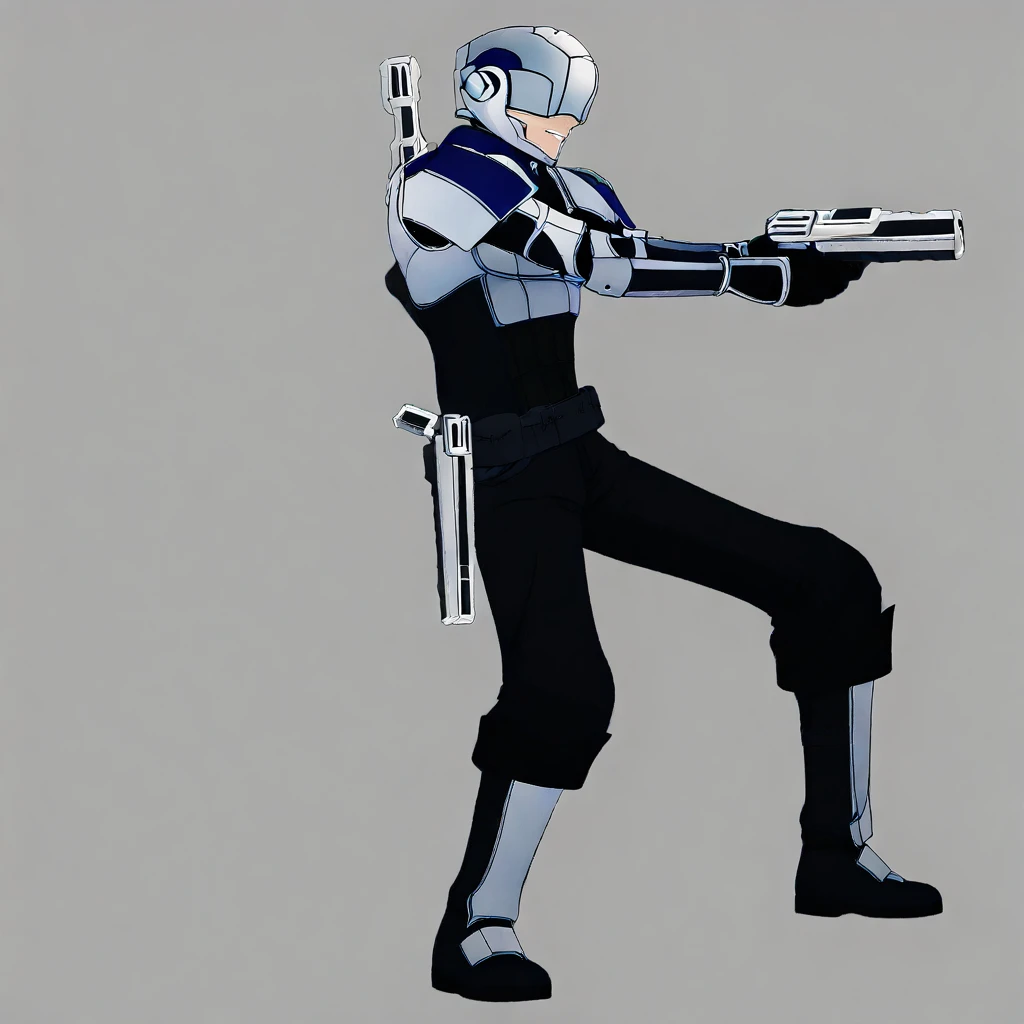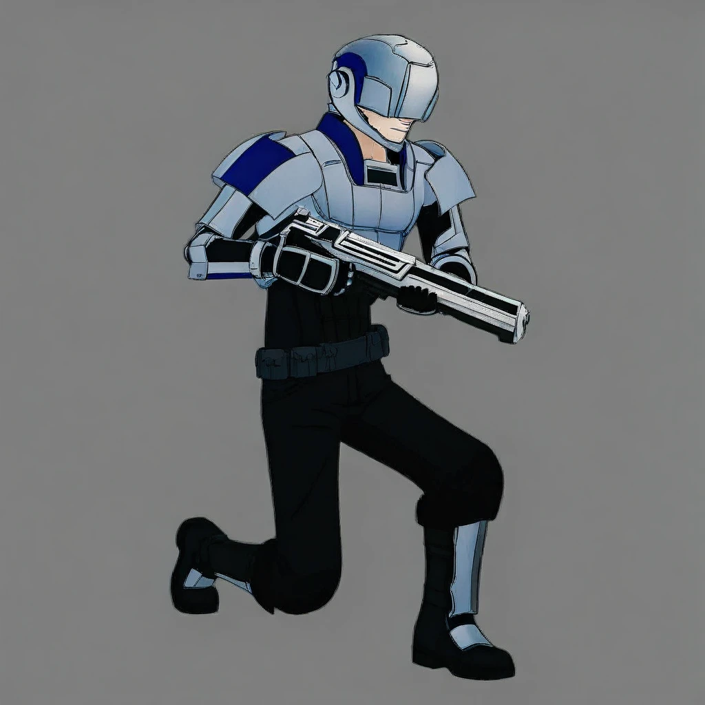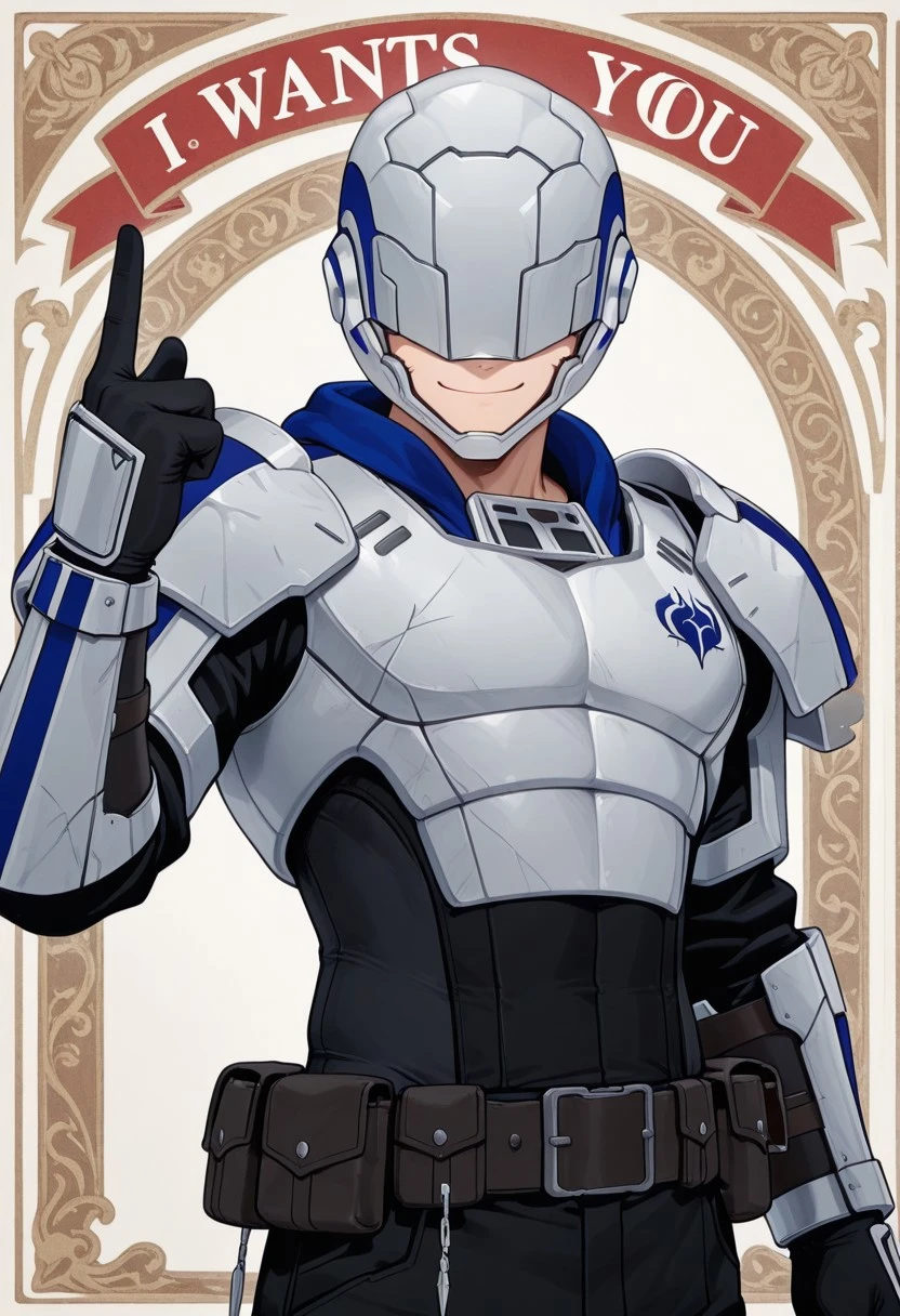 RAS_RWBY, helmet, helmet over eyes, white armor, chestplate, pauldrons, gauntlets, black clothes, black gloves, belts with pouches, black boots, metal foot guards,