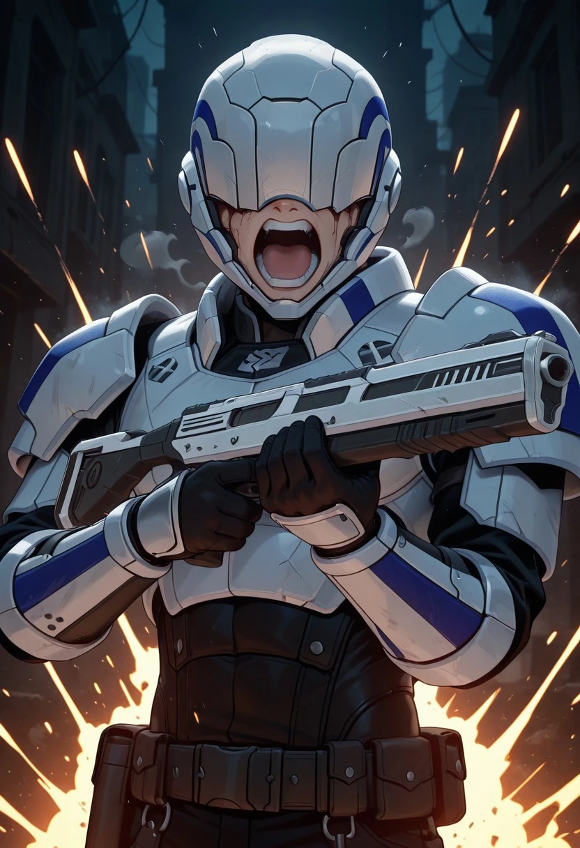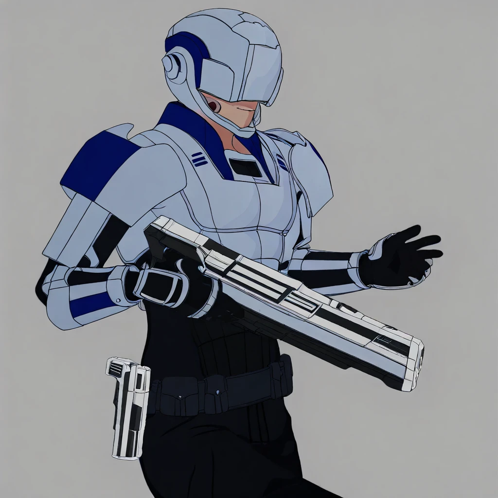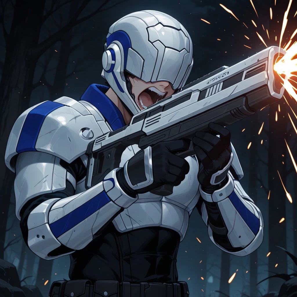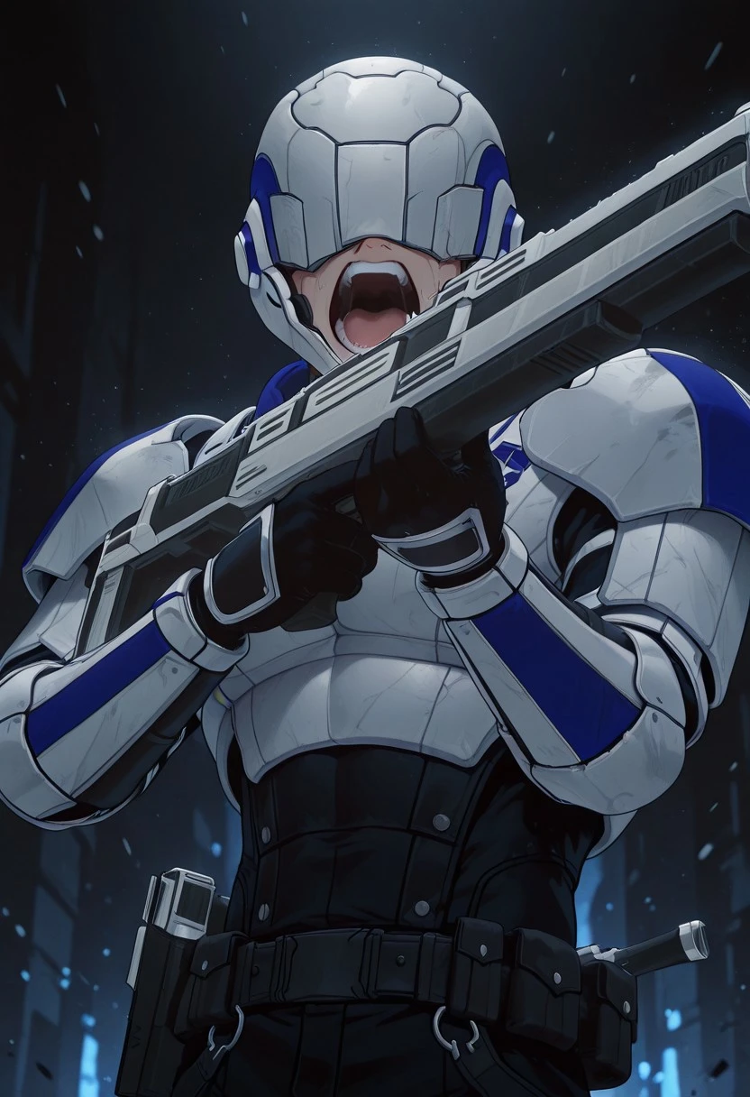 RAS_RWBY, helmet, helmet over eyes, white armor, chestplate, pauldrons, gauntlets, black clothes, black gloves, belts with pouches, black boots, metal foot guards,