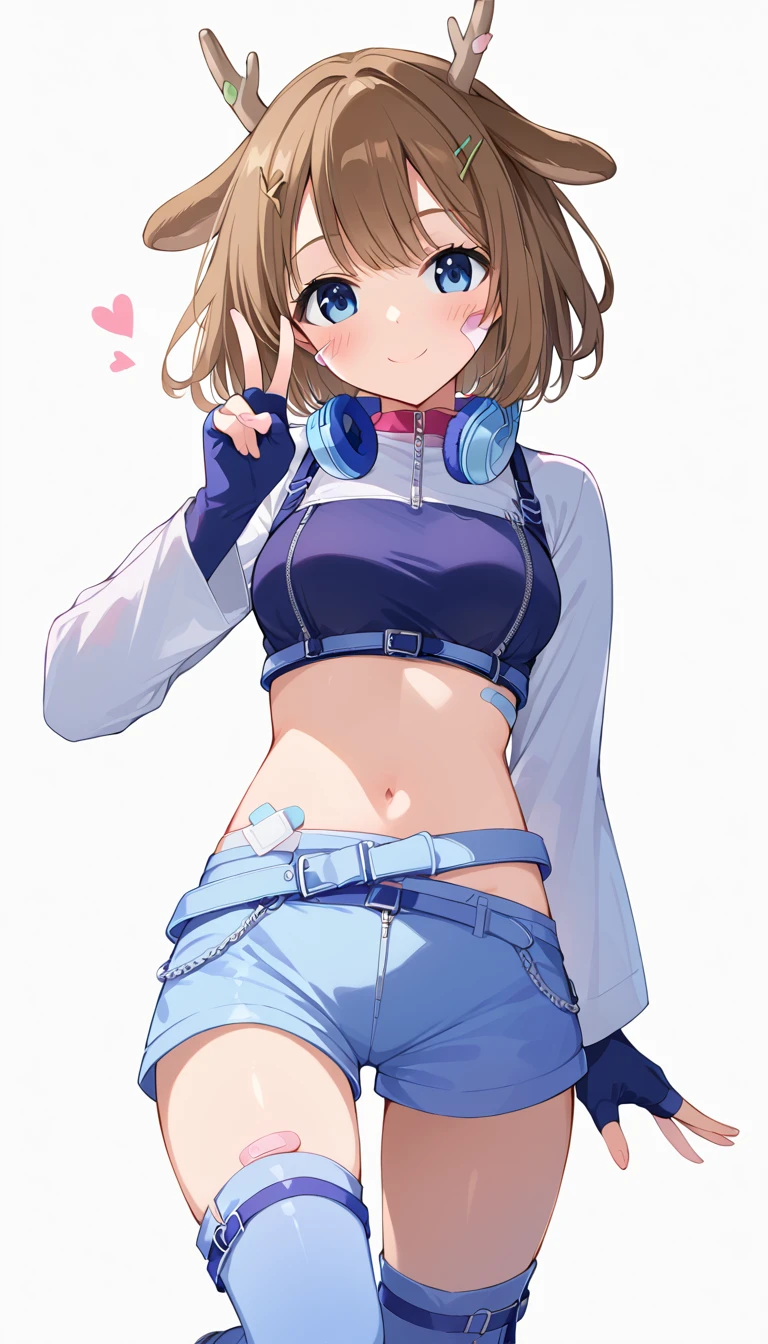 Kano_street,deer ears,1girl,brown hair,hair ornament,bandaid,bangs, blue eyes,crop top,shorts,hairclip,headphones,long sleeves,shirt,thighhighs,fingerless gloves,midriff,short hair,bandaid on face,navel,headphones around neck,shoes,short shorts,belt,antlers,