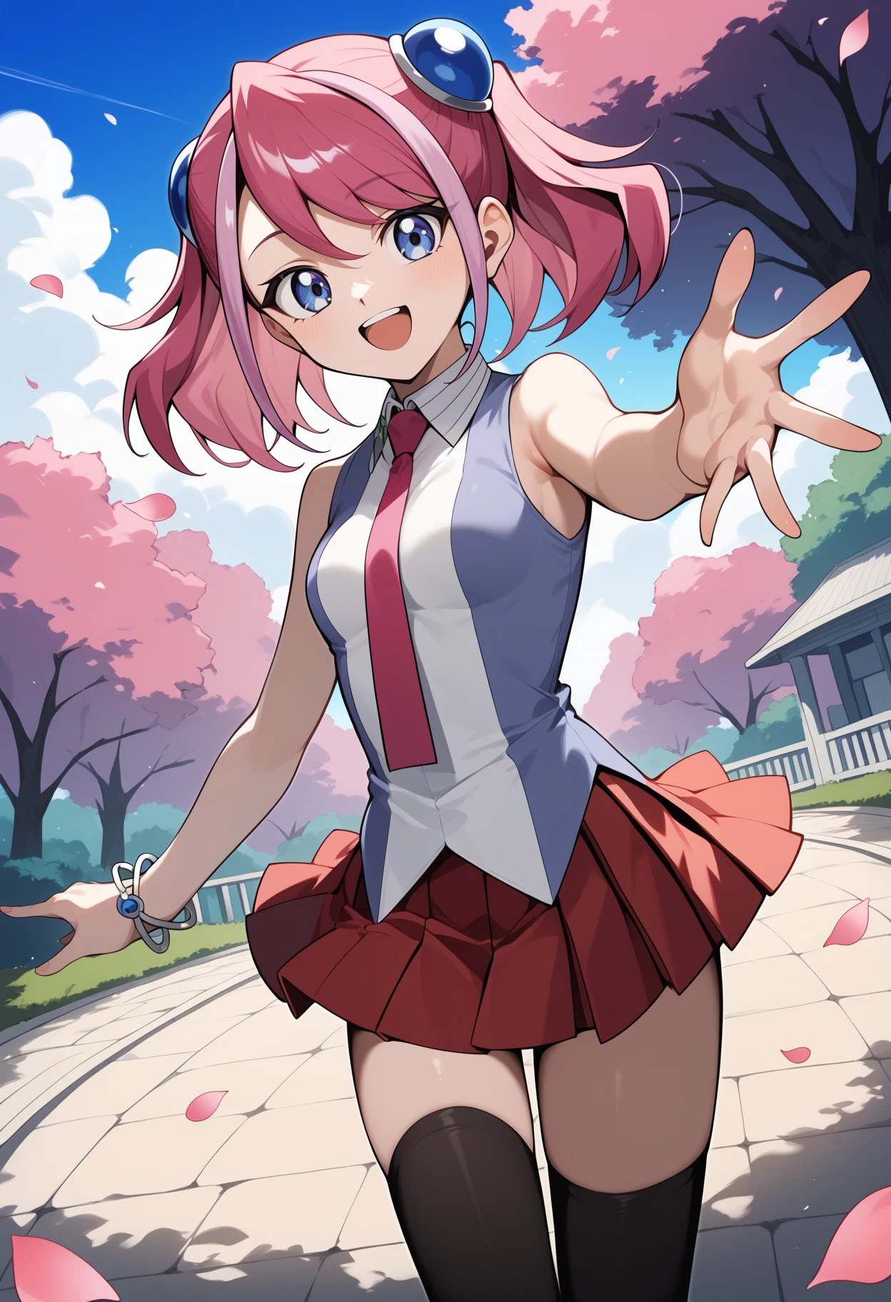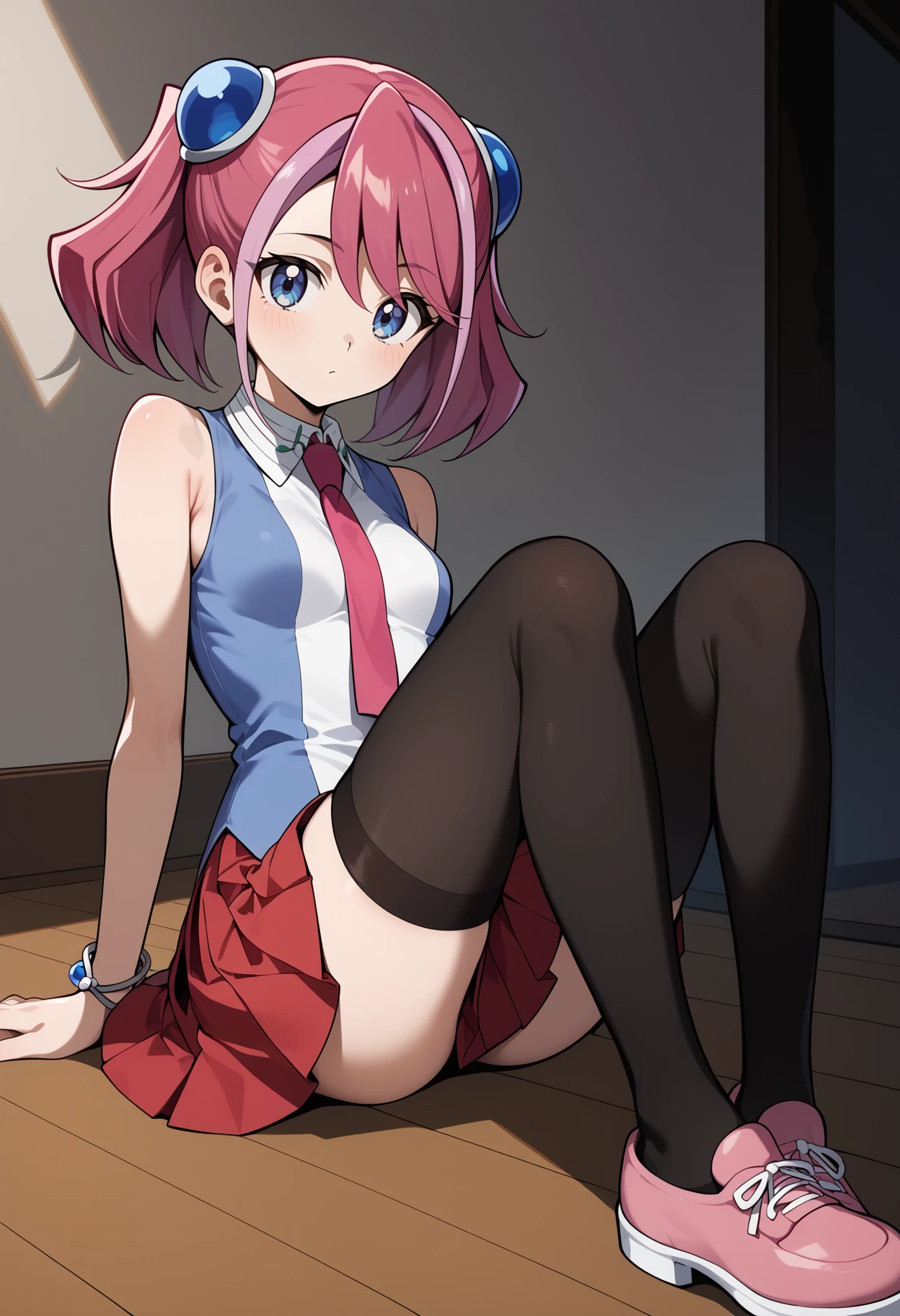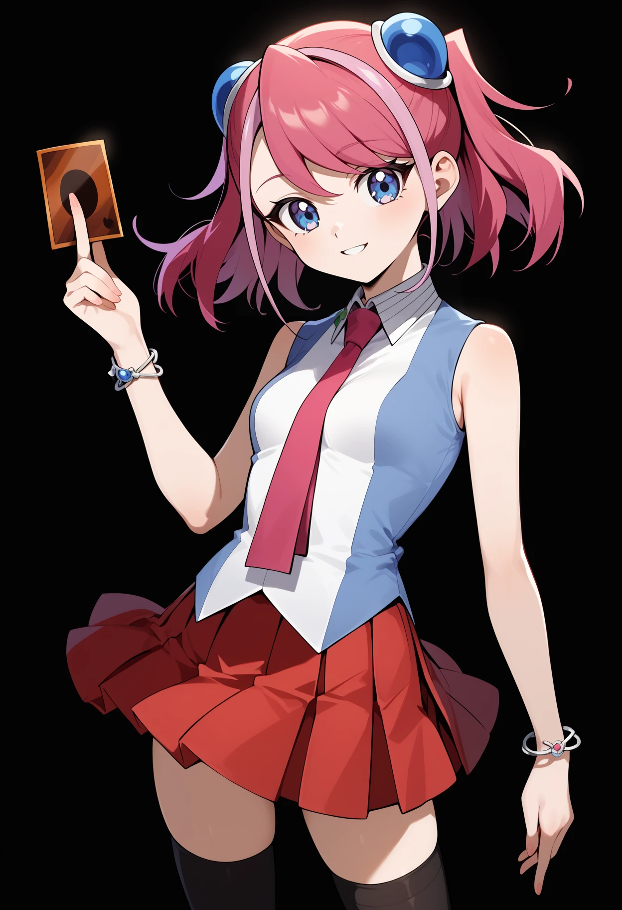 outfit1aayuzu, multicolored hair, pink hair, short twintails, hair ornament, blue eyes, small breasts, pink necktie, sleeveless shirt, multicolored shirt, bracelet, pleated skirt, red skirt, black thighhighs
