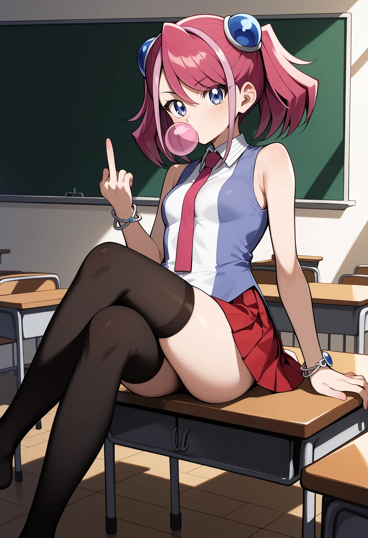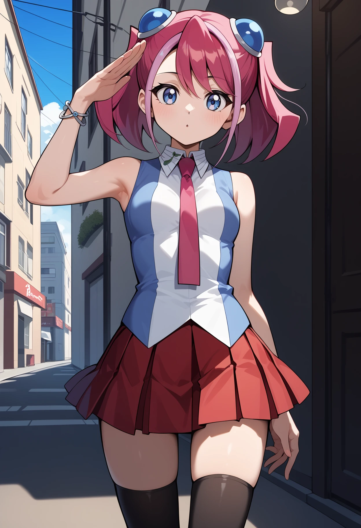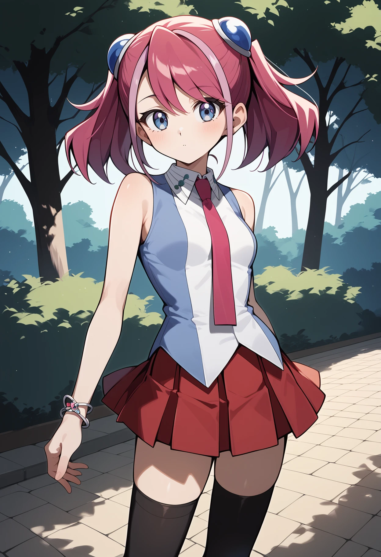 outfit1aayuzu, multicolored hair, pink hair, short twintails, hair ornament, blue eyes, small breasts, pink necktie, sleeveless shirt, multicolored shirt, bracelet, pleated skirt, red skirt, black thighhighs