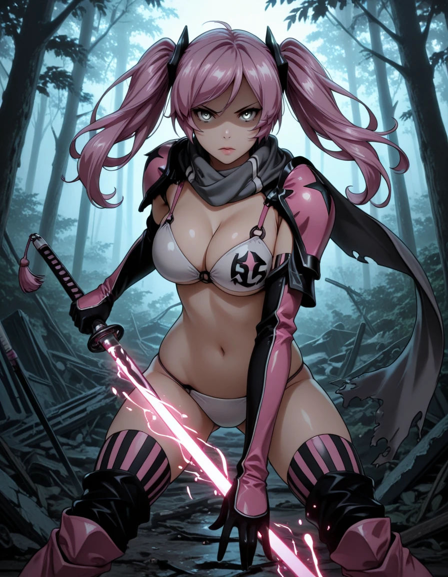 scarf, gloves, bikini armor, pink footwear, elbow gloves, pauldrons,