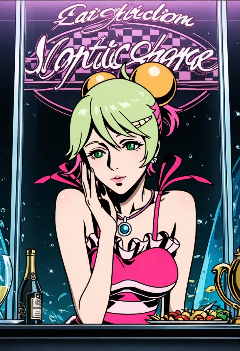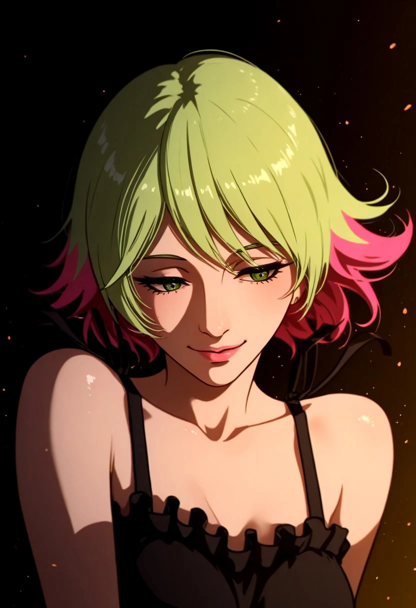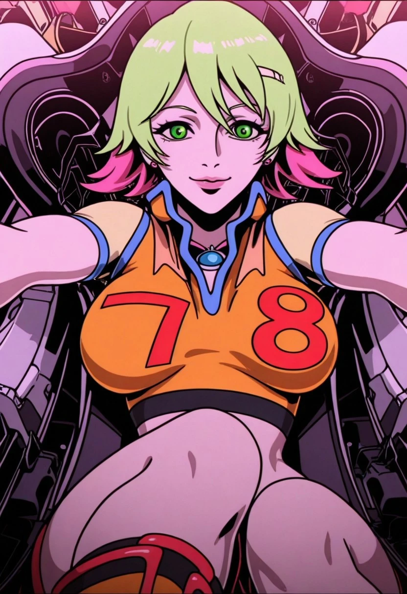 sonoshee_redline, 1girl, lime green hair, pink tips, green eyes, pink lips, fair skin, bob cut, short hair,