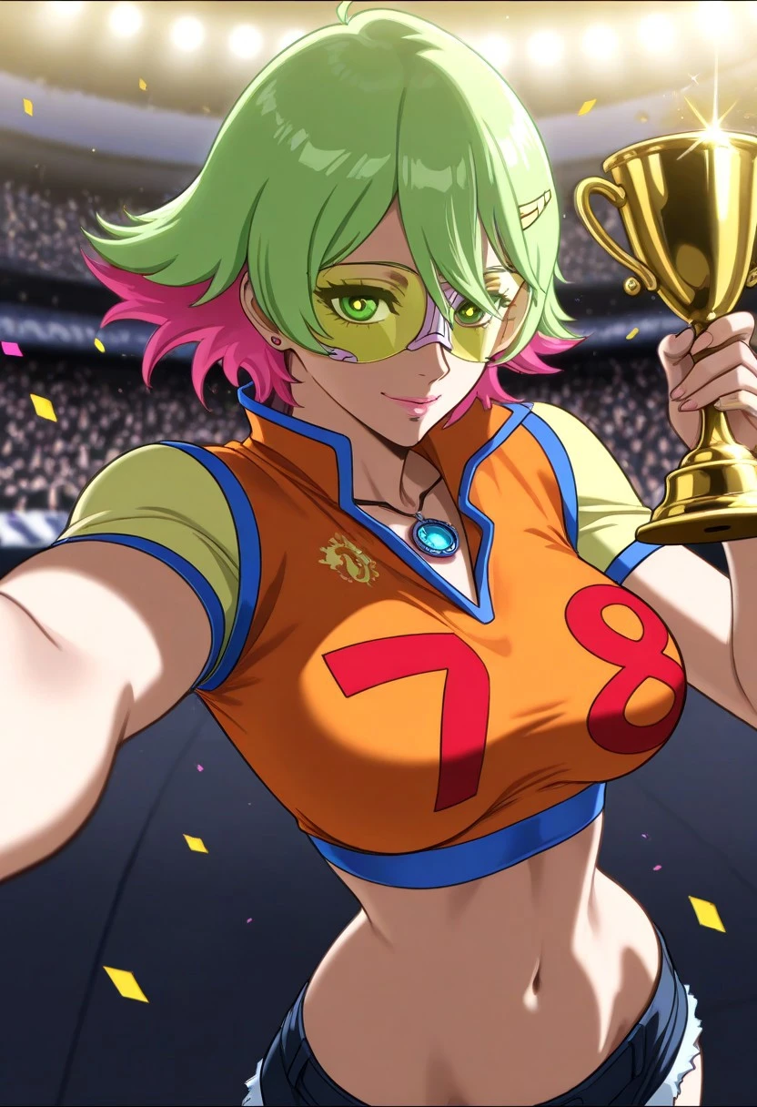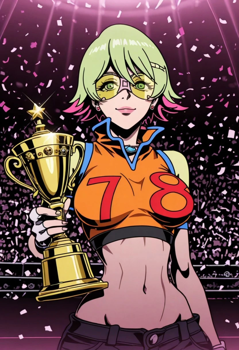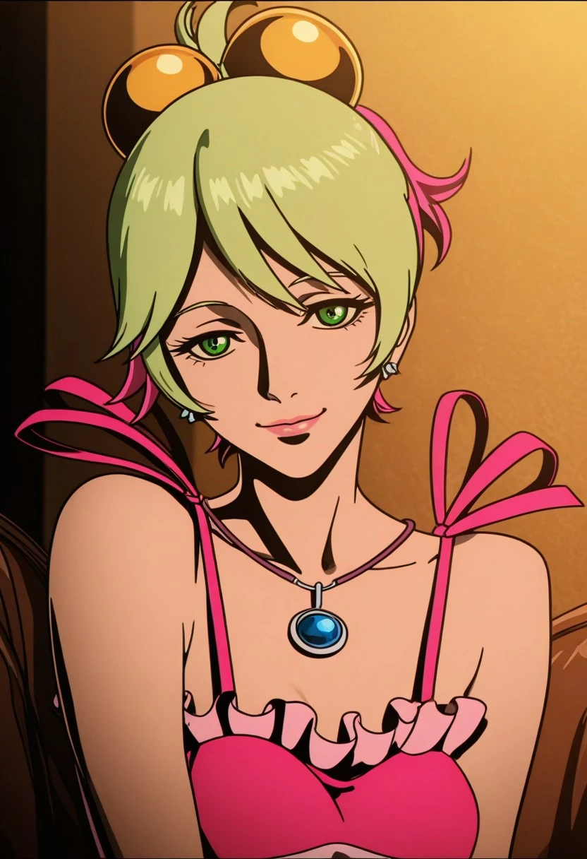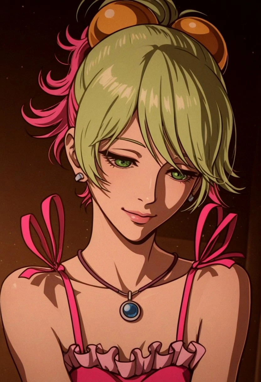 sonoshee_redline, 1girl, lime green hair, pink tips, green eyes, pink lips, fair skin, bob cut, short hair,
