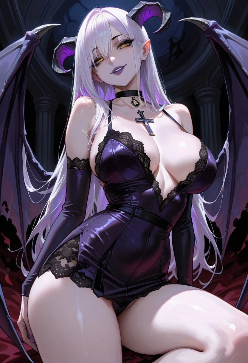 1girl, Morgana-IL, succubus, long hair, white hair, purple hair, yellow eyes, purple lipstick, black cross choker, large wings, sexy body