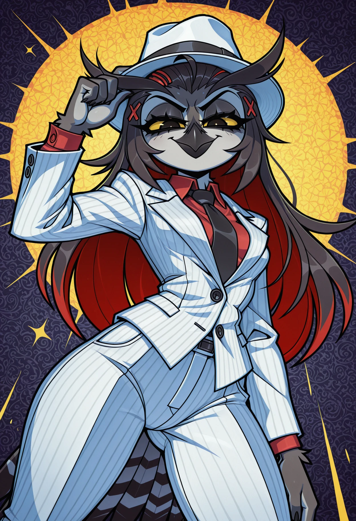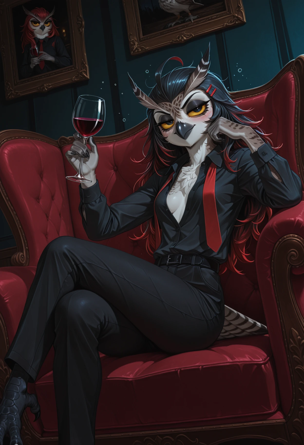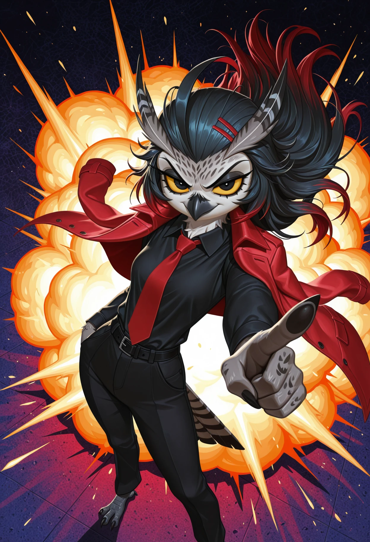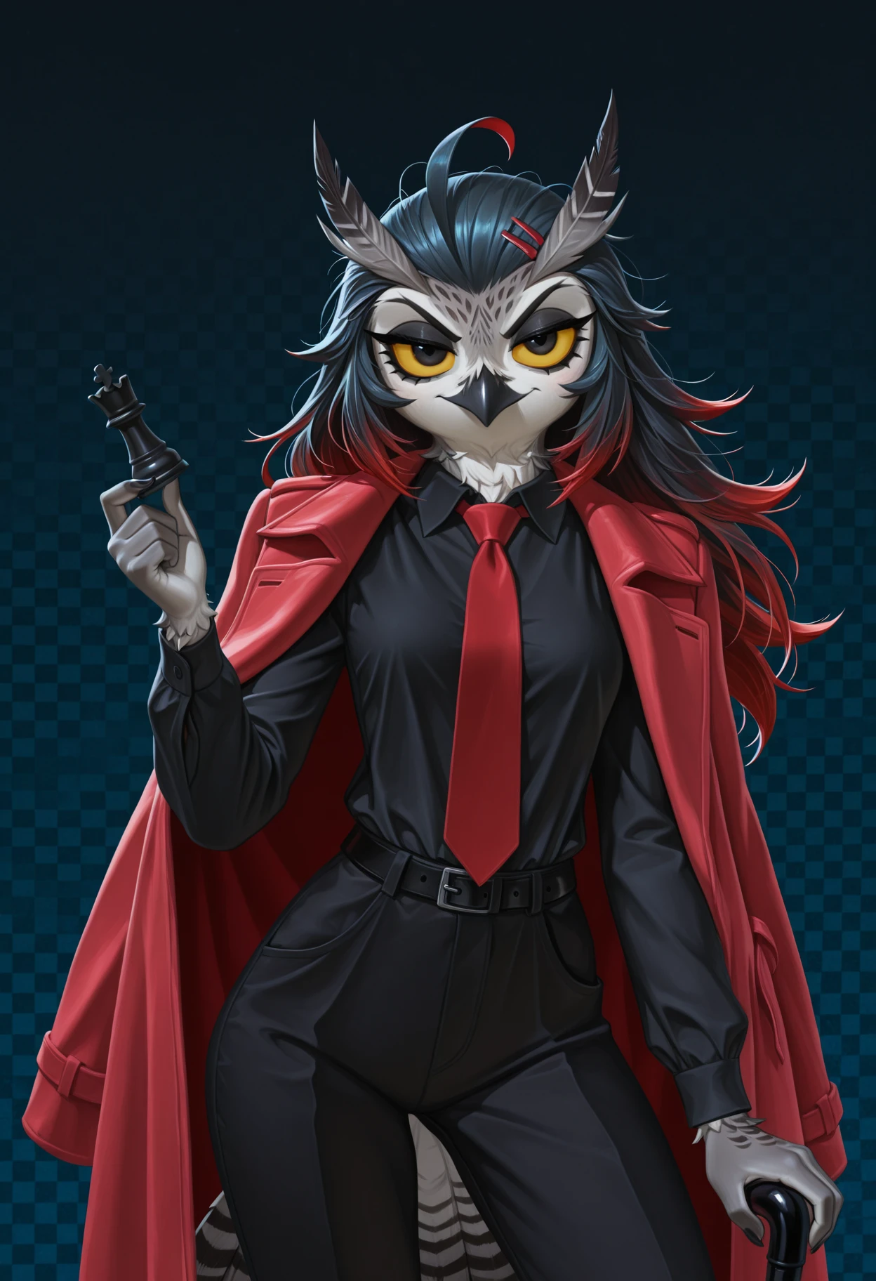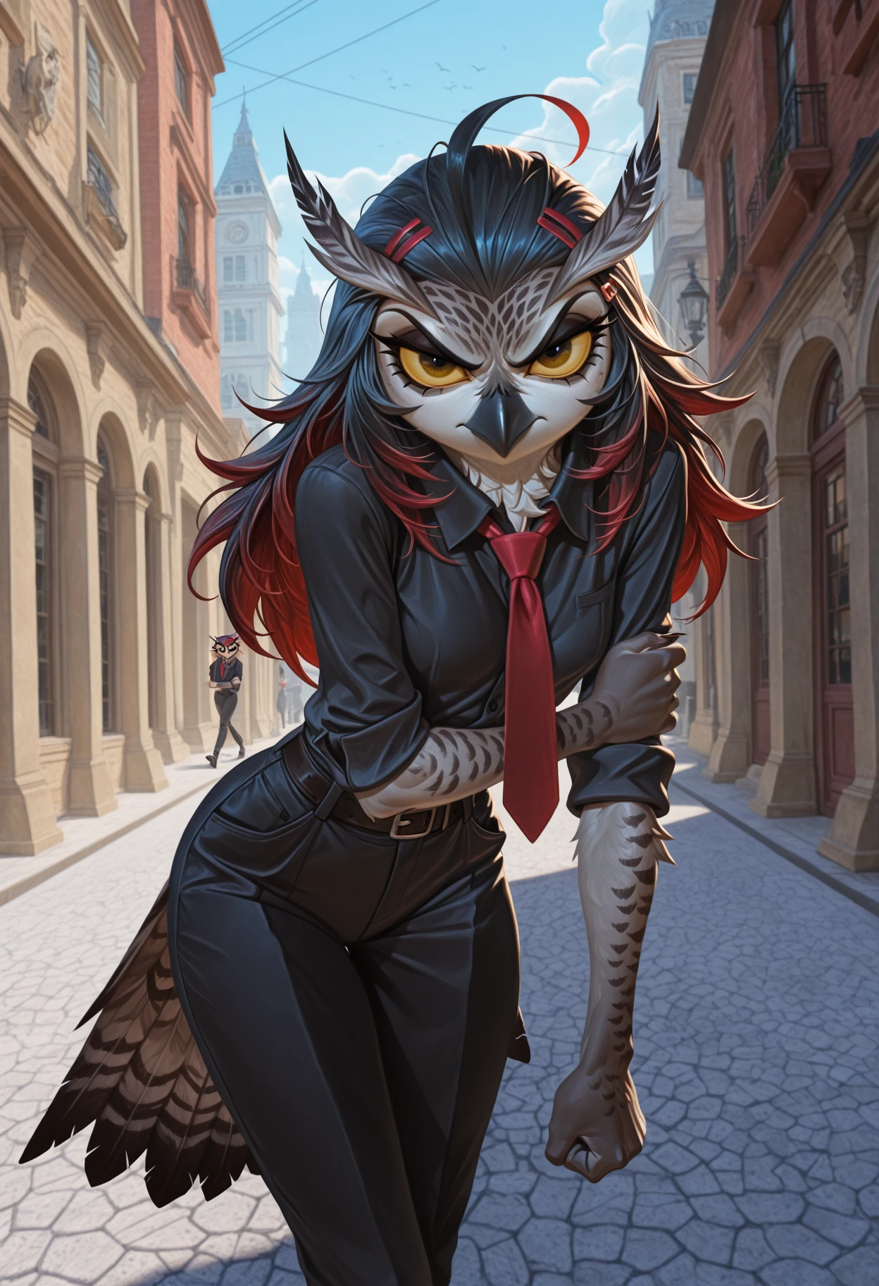 Additional triggers: female furry owl, slim female, small breasts, grey body, beak, black hair, red hair, multicolored hair, long hair, hair slicked back, ahoge, yellow sclera, bird tail, bird feet, talons, black feet (for basic looks), hairclip, hair ornament, black shirt, collared shirt, red necktie, red coat, coat on shoulders, black pants, formal pants, belt (main clothing)
