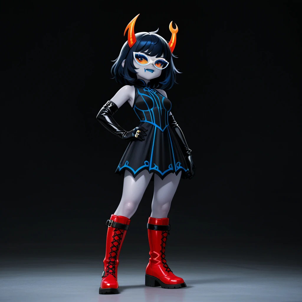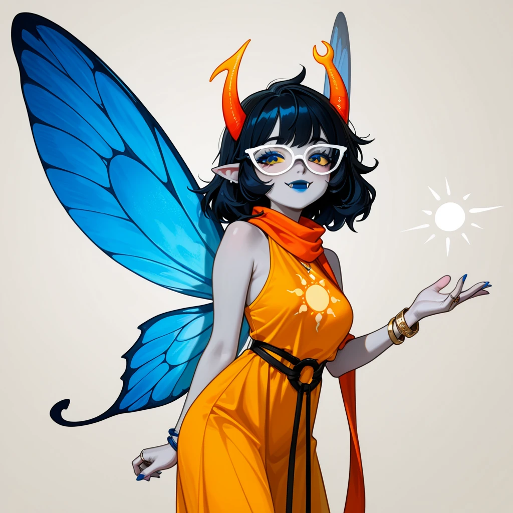 aranea, 1girl, solo, grey skin, black hair, medium hair, orange horns, asymmetric horns, blue eyelashes, blue lipstick, white glasses, fangs out,