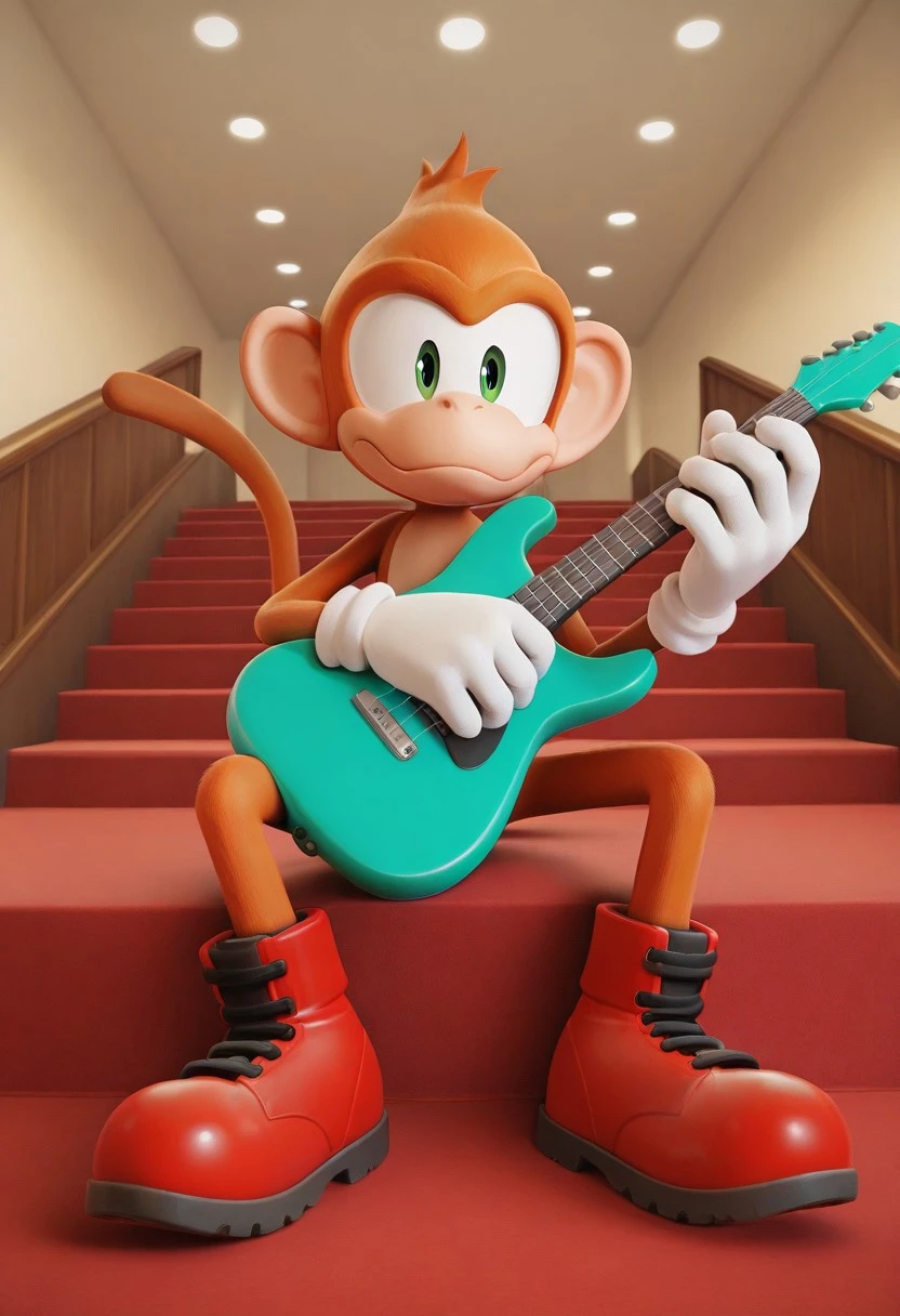 Max the Monkey, brown fur, green eyes, brown tail, holding green guitar, white gloves, red boots