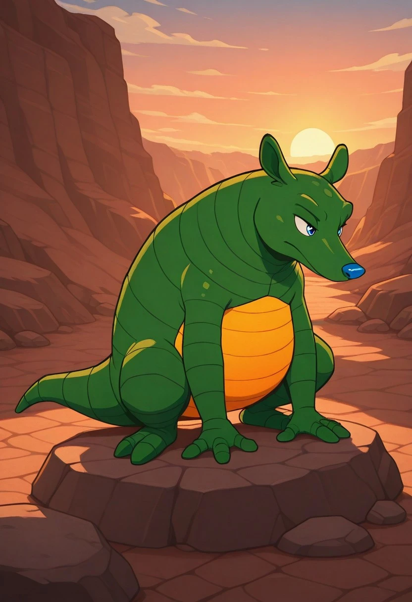 Arlo the Armadillo, green skin, peach-colored stomach, blue eyes, blue nose, green tail