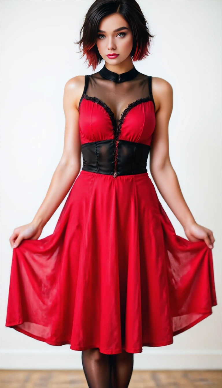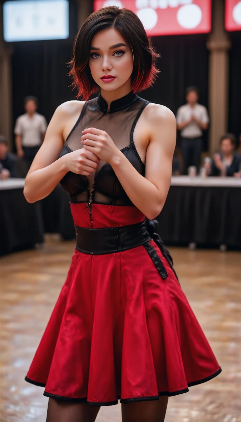 To create the Beacon dance dress, try: A photo of Ruby Rose (RWBY). She is wearing her Beacon dance dress. It is comprised of a red dress with a black band around her stomach and black stockings. She is wearing a black, semi-transparent, mesh top beneath the dress with a black collar.
